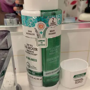 I love all their products. However one problem I see with this daul chamber mouthwash is the mint side doesn't pour into the cap like the essential oil chamber does. One drips out and the other pours out. It's interesting. Maybe it was by design. Other than that I love the batch