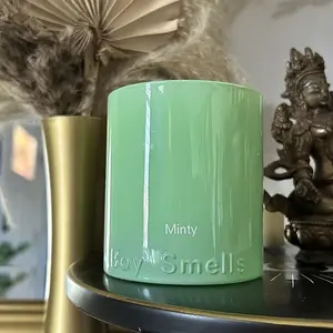 Boy Smells Minty Candle light green vessel is so beautiful as glows! Such a gorgeous shade of green and looks so pretty on my mantle in the living room. The scent of soothing mint, melded with invigorating ginger makes the perfect balance creating a sublime atmosphere. My whole home smells amazing when it’s lit. Love that I’ve experienced no tunneling using this vegan candle. An even burn each time! A positive vibe every time you light it! gifted by boysmells