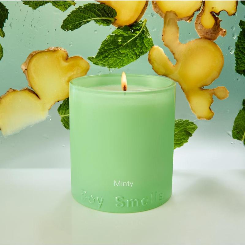 Gifted by boy smells. The Minty Candle by Boy Smells is a refreshing twist on classic greenery. With cool notes of mint, eucalyptus, and subtle citrus, it creates a crisp, invigorating atmosphere. Housed in a sleek, minimalist vessel, this candle blends sophistication with a vibrant scent profile—perfect for lifting moods and energizing spaces with just the right touch of freshness.