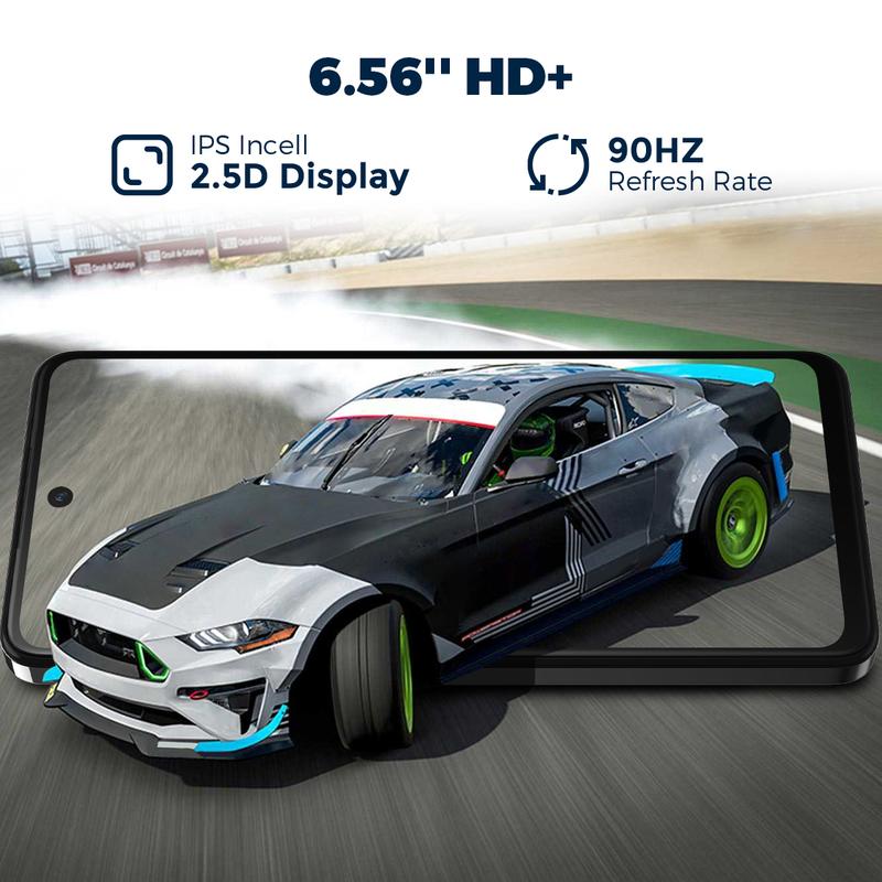 Watch TikTok videos, play games, or binge shows on a 6.56” IPS Incell 2.5D screen with 90Hz refresh. Dual SIM & Unlocked Freedom allows two numbers with dual nano SIMs.