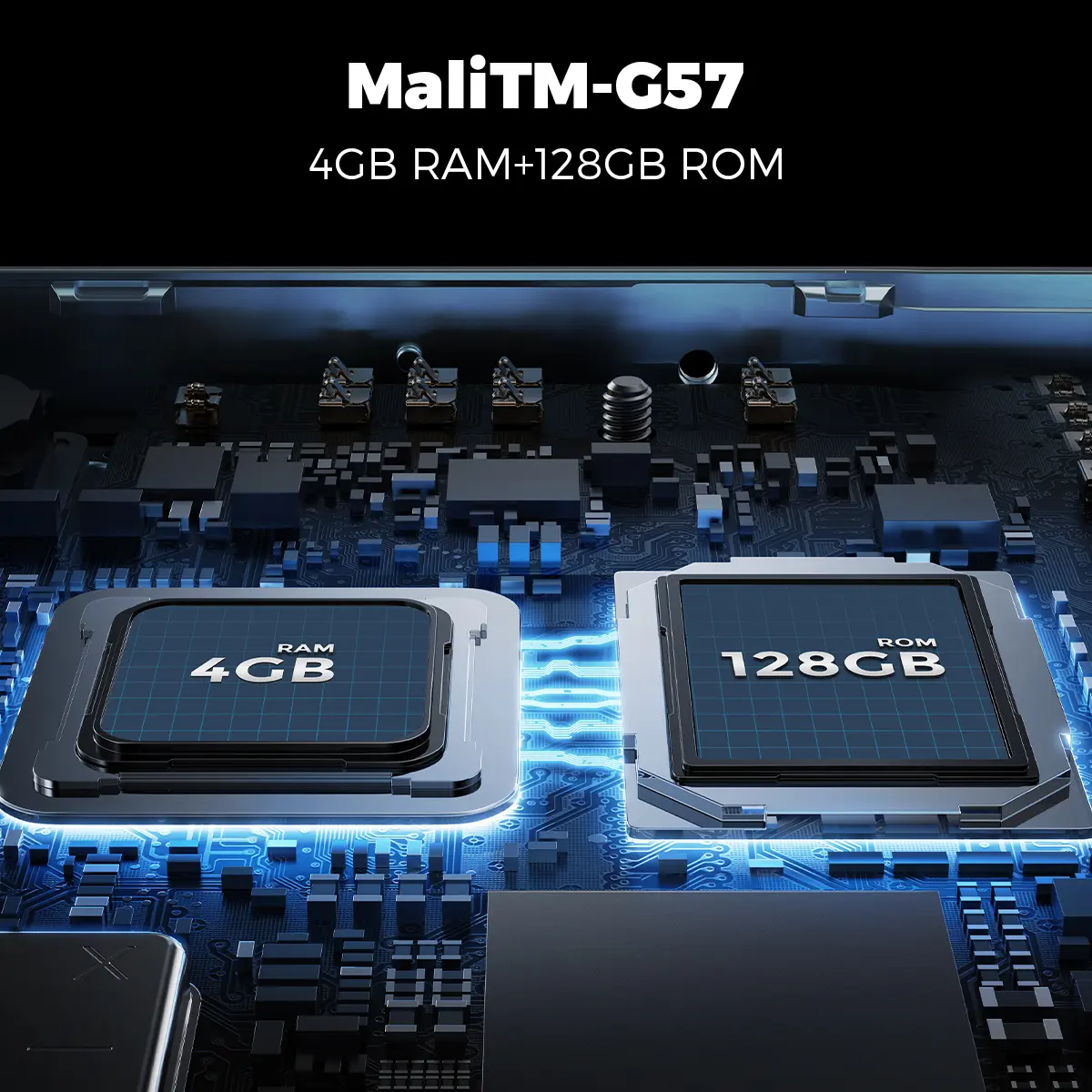 Runs on Android 14 with a 2x Cortex-A75 1.8GHz + 6x Cortex-A55 1.6GHz CPU and MaliTM-G57 GPU. It's responsive for TikTok, streaming, or gaming. With 4GB RAM + 128GB ROM, save thousands of videos, games, and photos. Expandable storage ensures future-proofing.