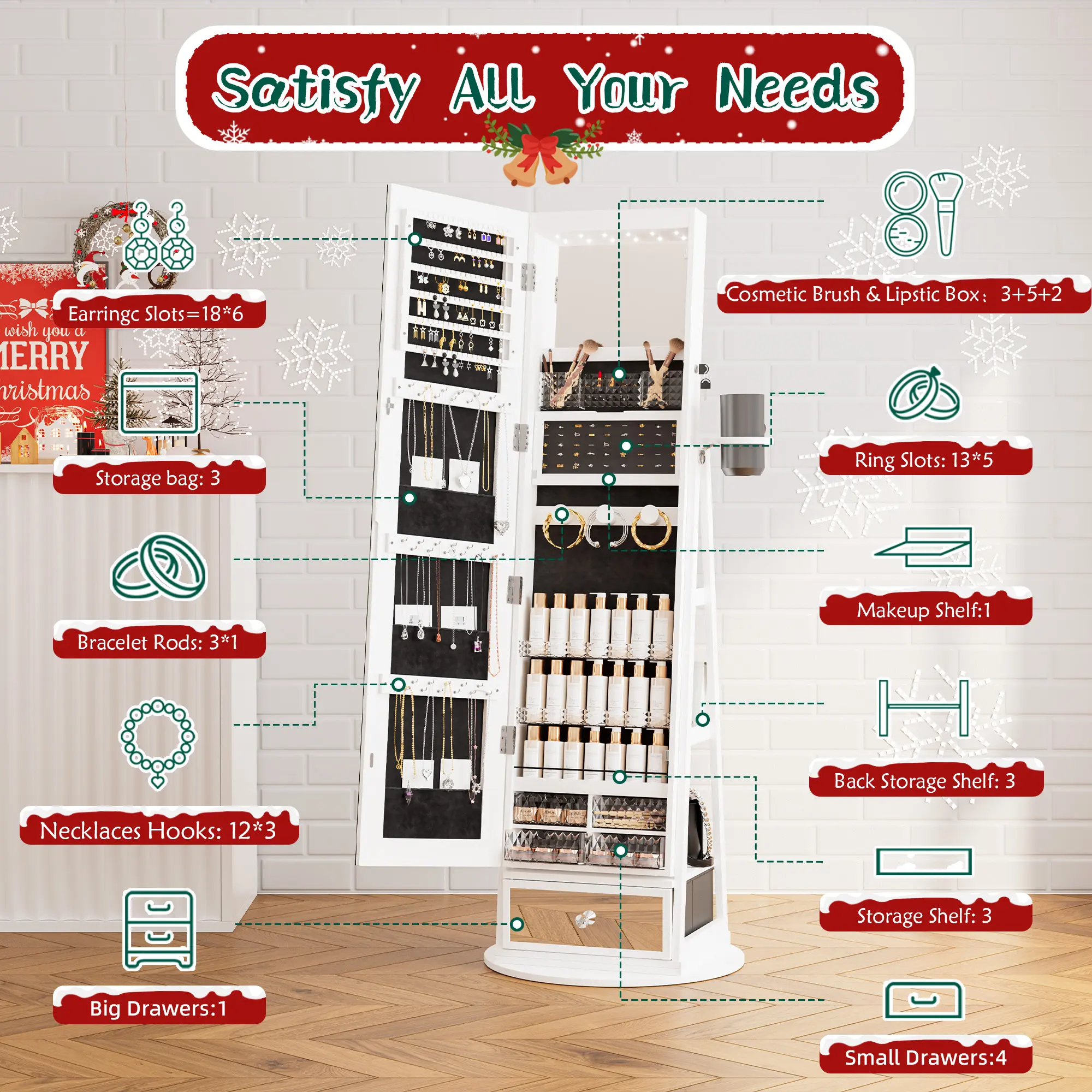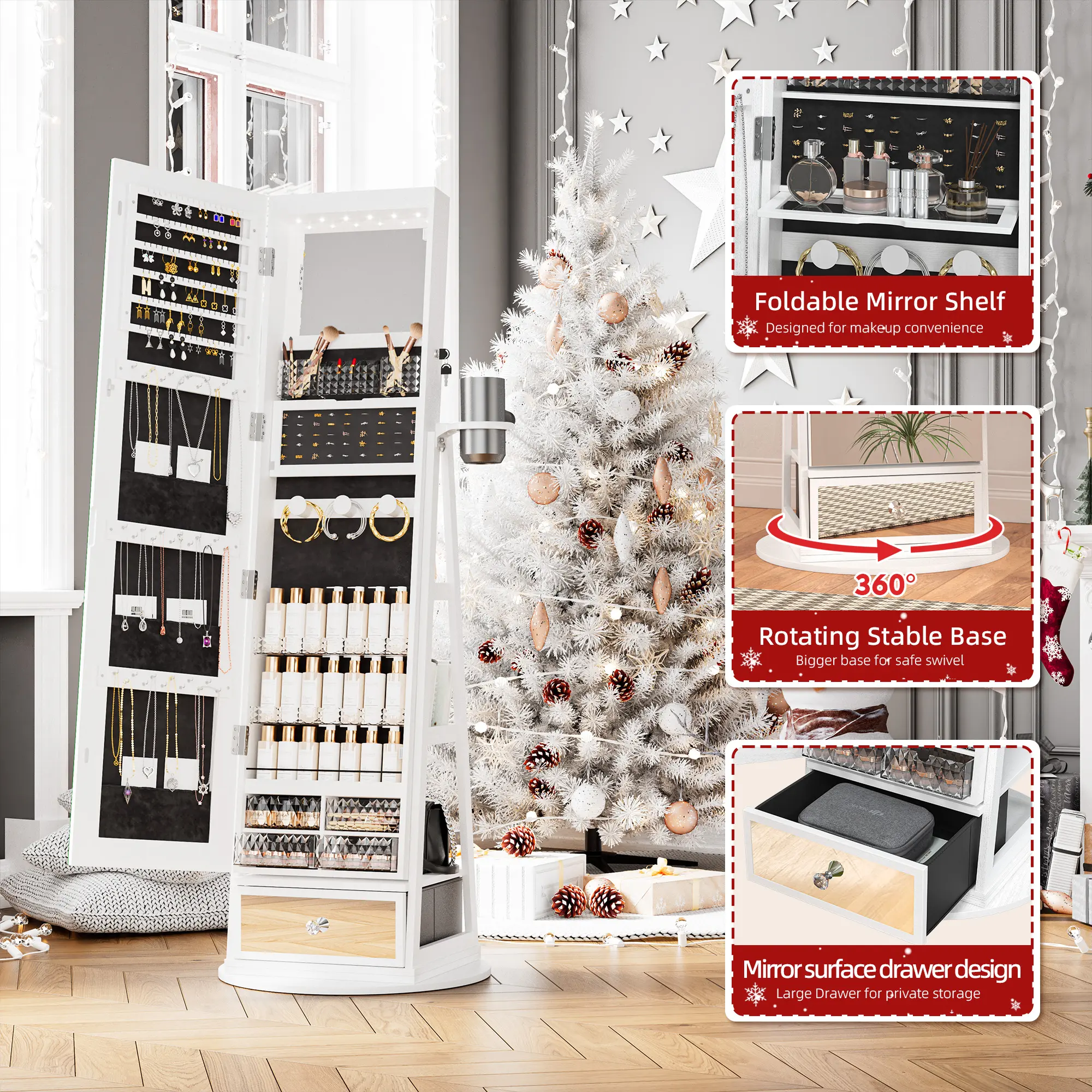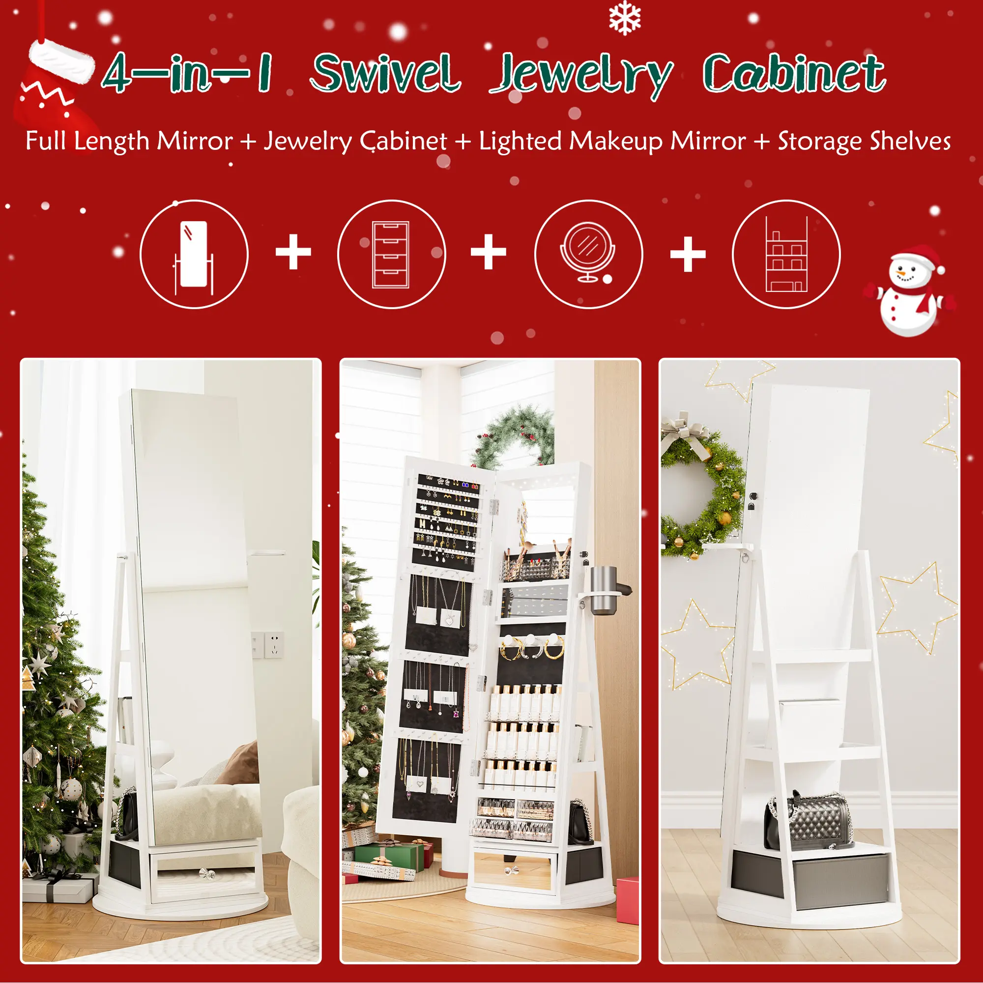·4-in-1 Design: Combines a full-length mirror, a makeup mirror, a storage cabinet, and a jewelry cabinet. The integrated design makes usage and storage more convenient.