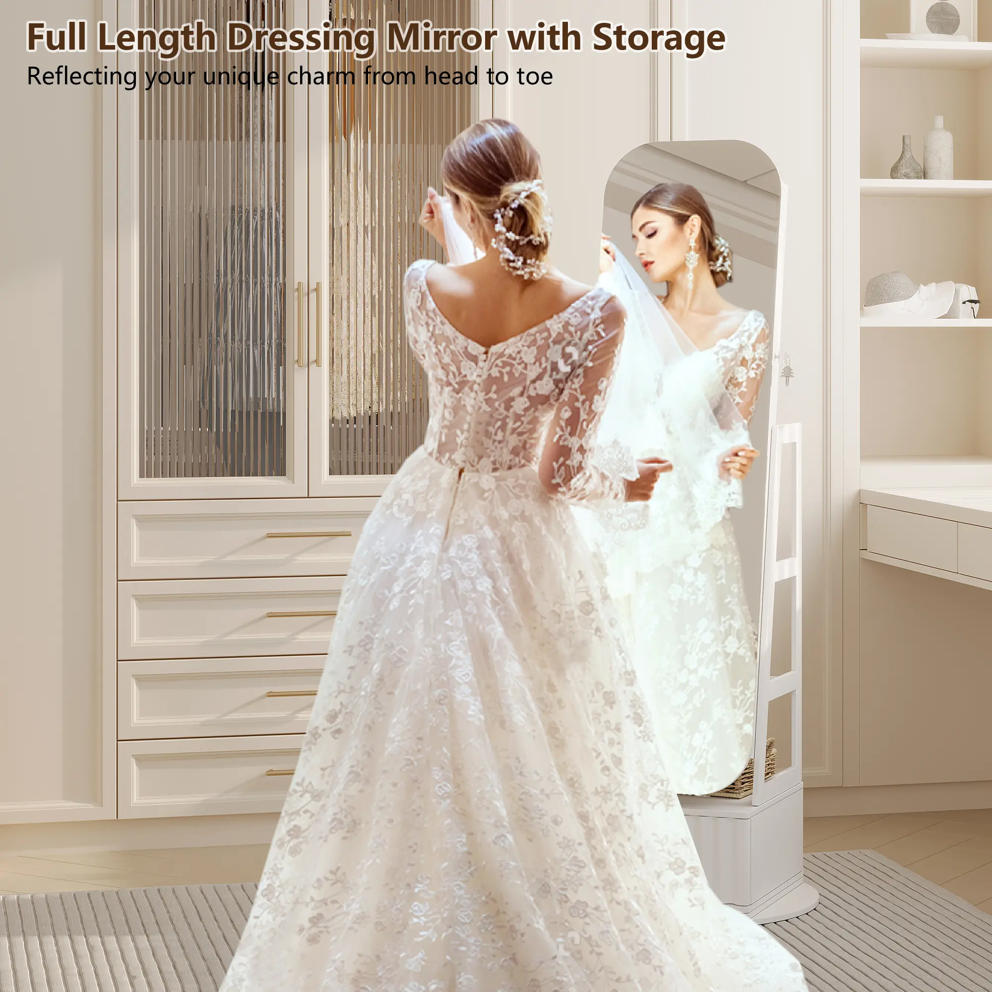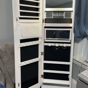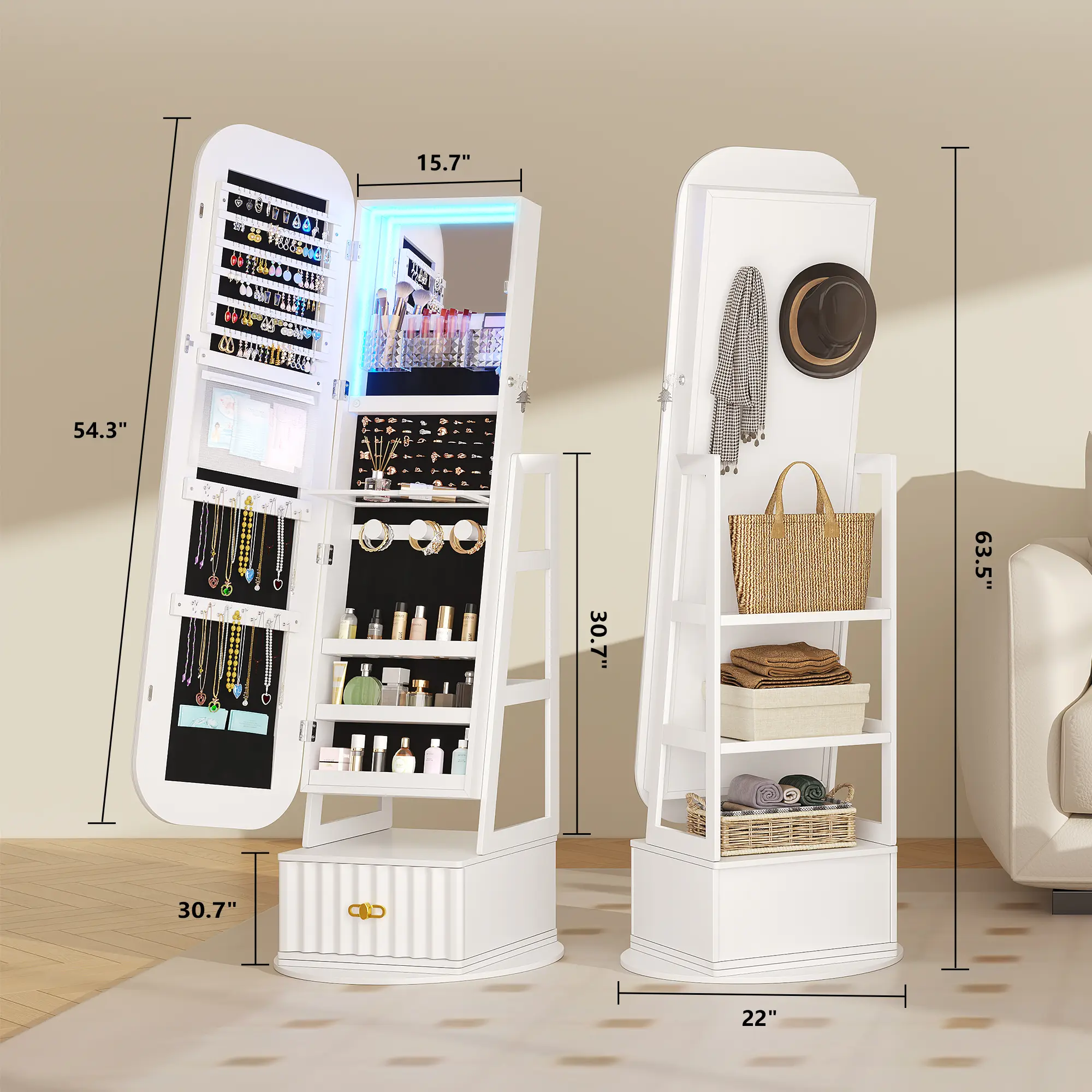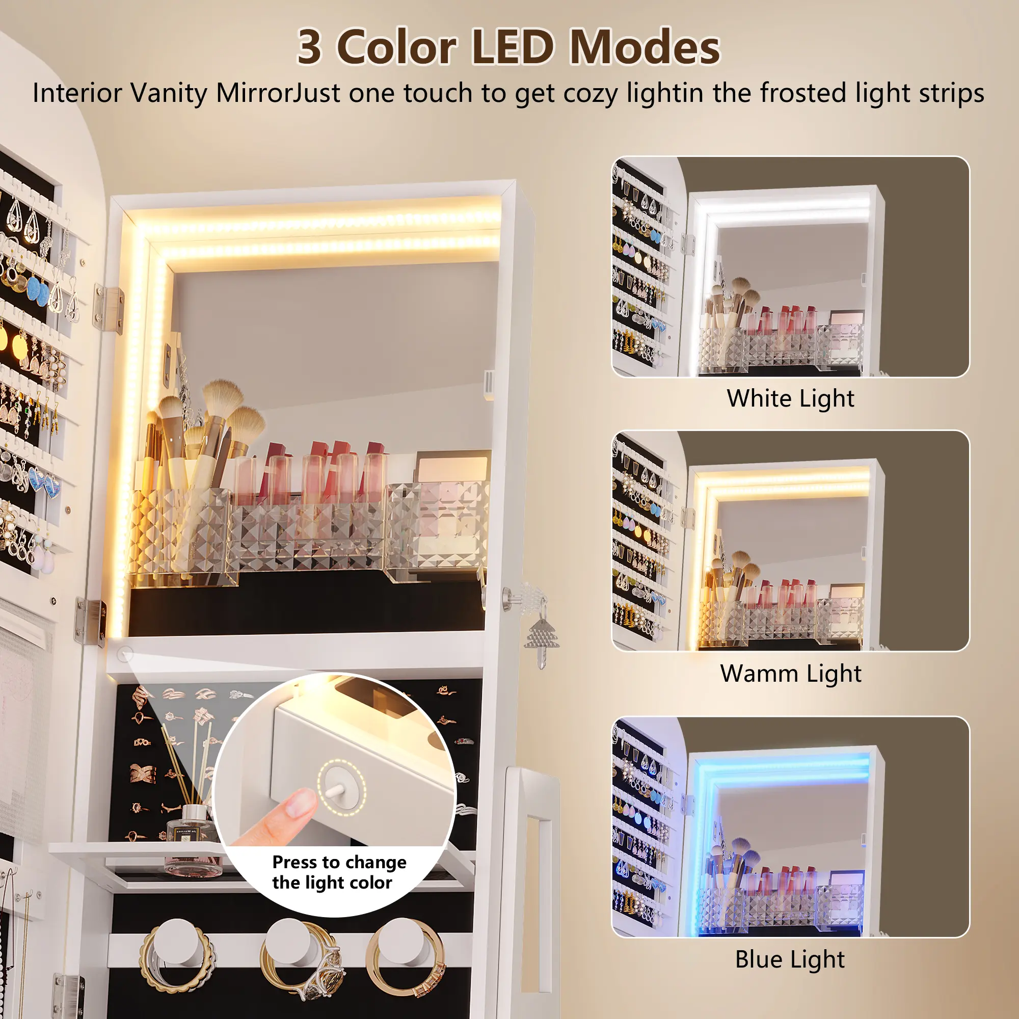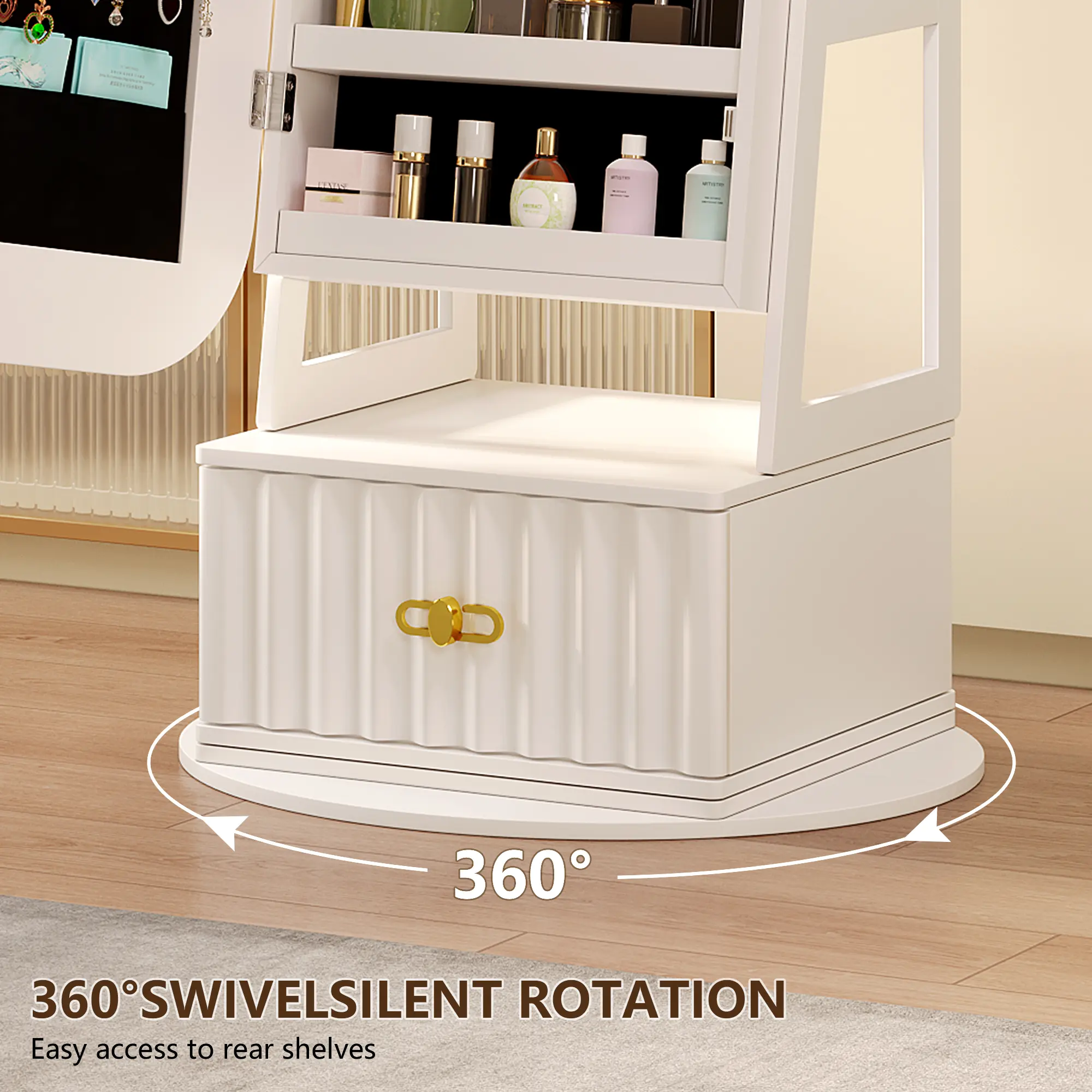 The cabinet’s top mirror rotates smoothly, offering 360° access to your jewelry and cosmetics. Integrated with three adjustable LED light modes (white, warm, and blue), the mirror provides optimal lighting for makeup application or jewelry selection, blending functionality with modern elegance.