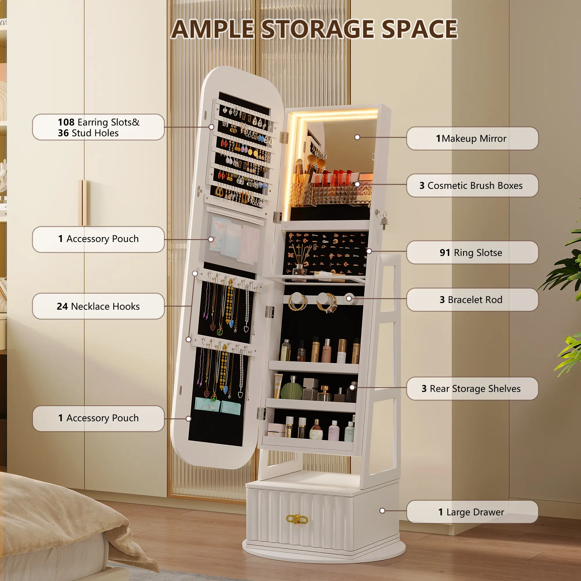 This jewelry cabinet is designed to store and display your treasures effortlessly. It features 108 earring slots, 36 stud holes, 91 ring slots, 24 necklace hooks, and three bracelet rods, along with three rear storage shelves and two accessory pouches. A spacious bottom drawer and three dedicated cosmetic brush boxes complete the storage, ensuring every item has its place.