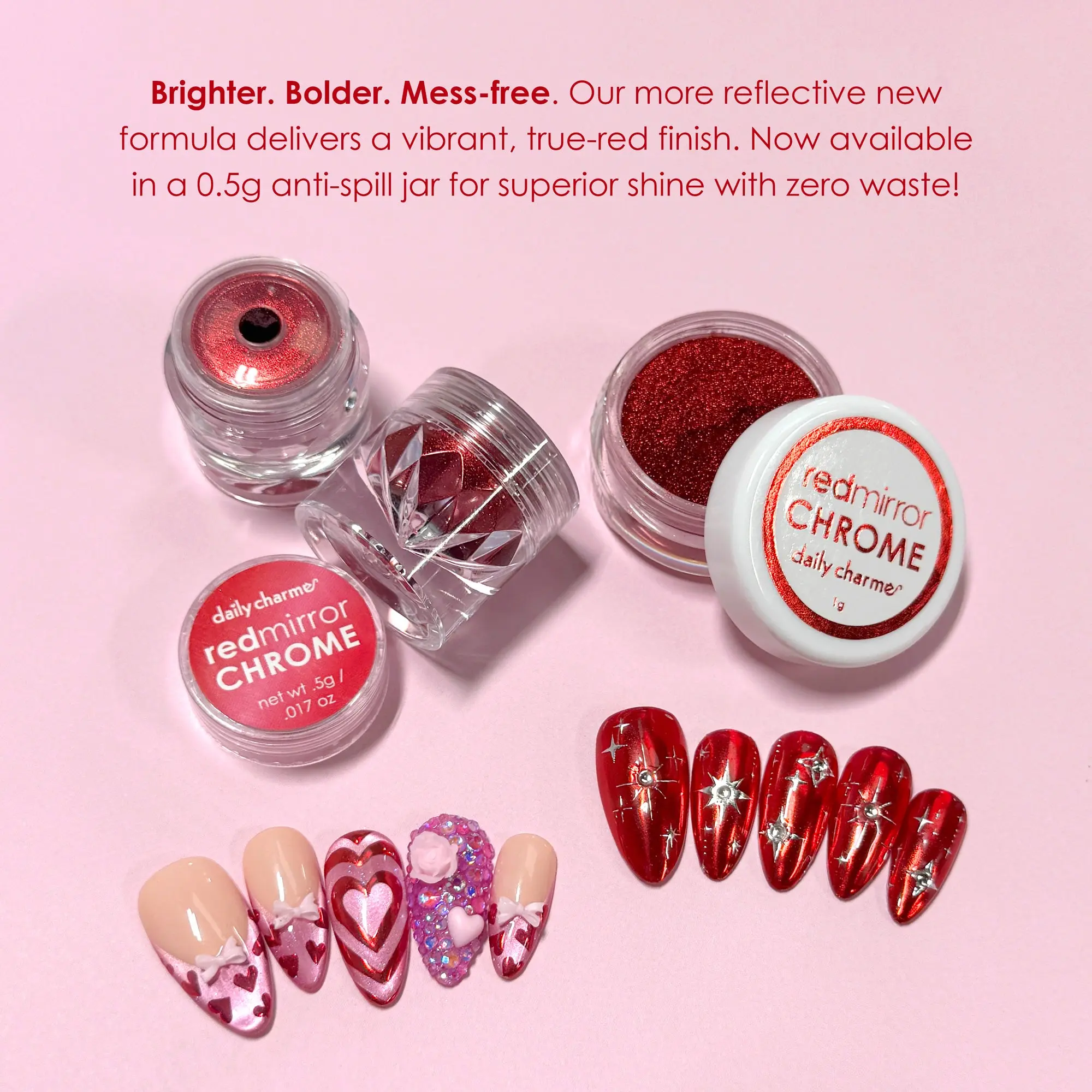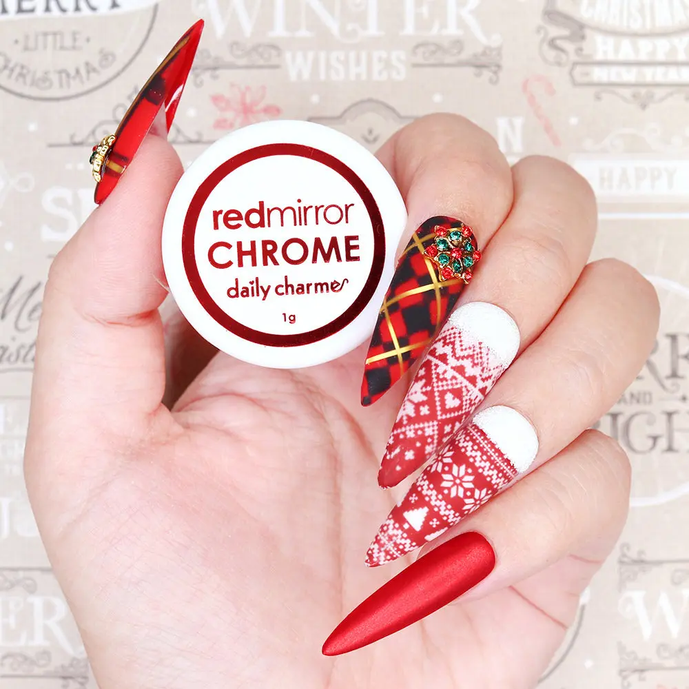 NEW FORMULA & SIZE! Our popular Mirror Red Chrome Powder just got an upgrade with a smoother, high-reflection, and more vibrant formula. It’s the perfect true red chrome you’ve been waiting for, now available in both 0.5g and 1g jars!