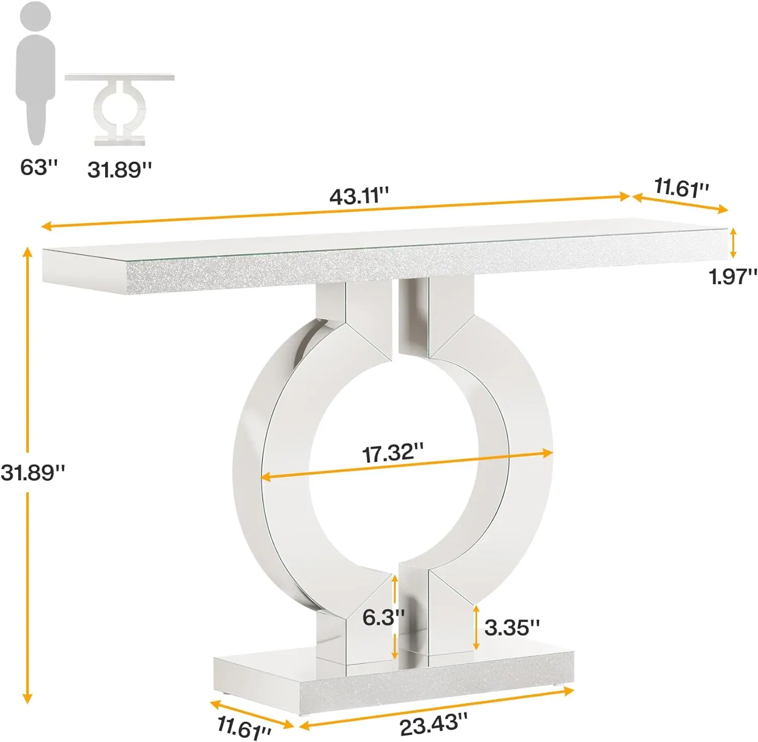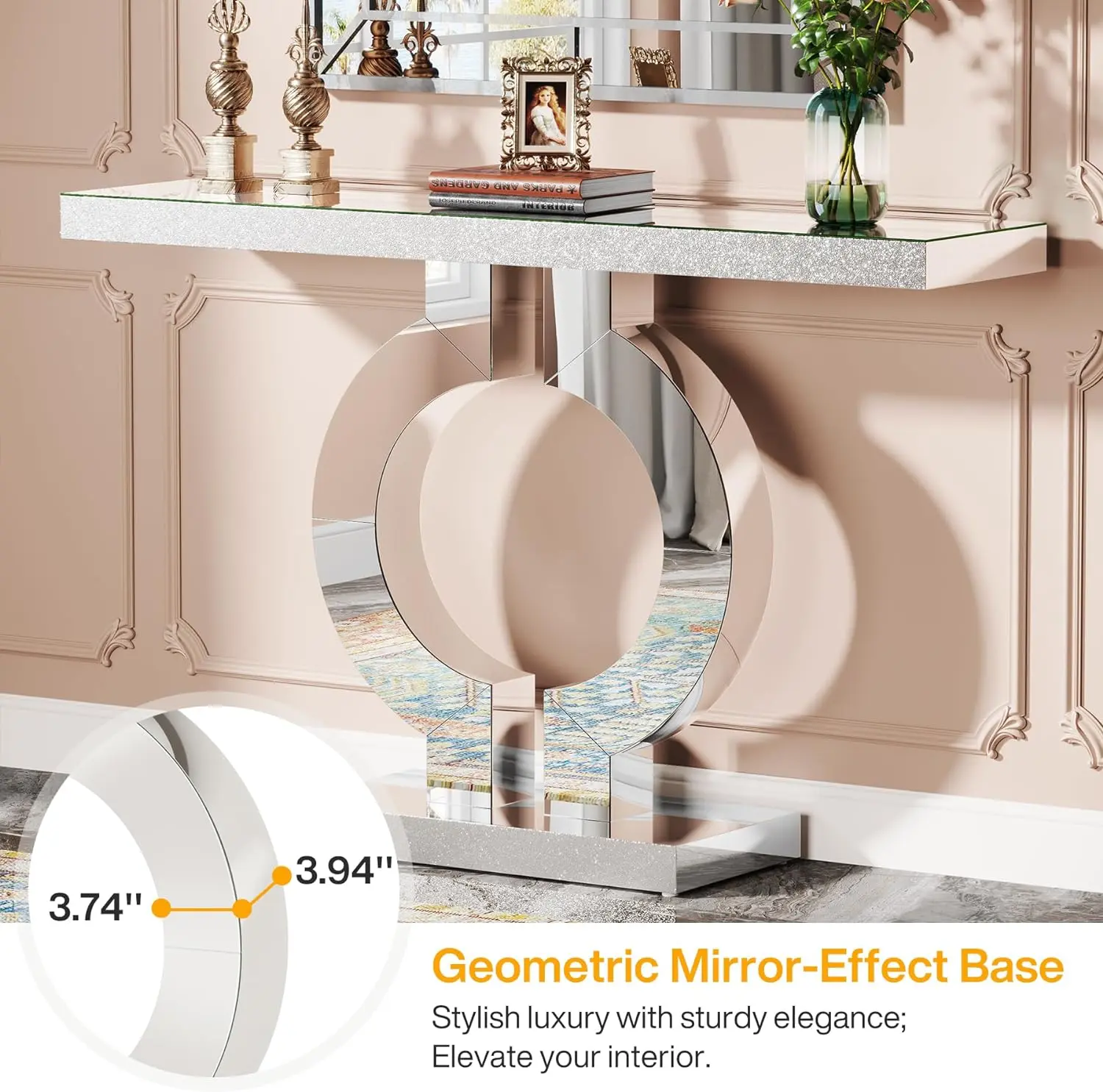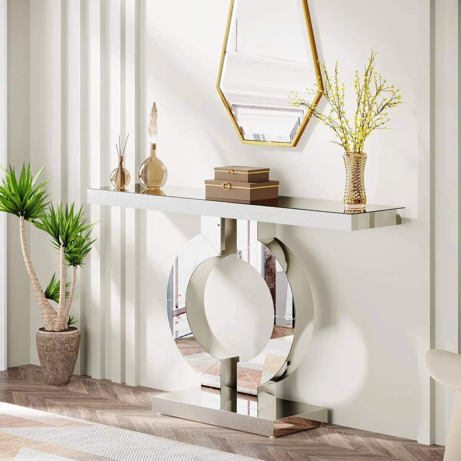 Our console table, with its immaculate mirrored surface and unique O-shaped base, provides an immediate boost of modern aesthetics to any room.