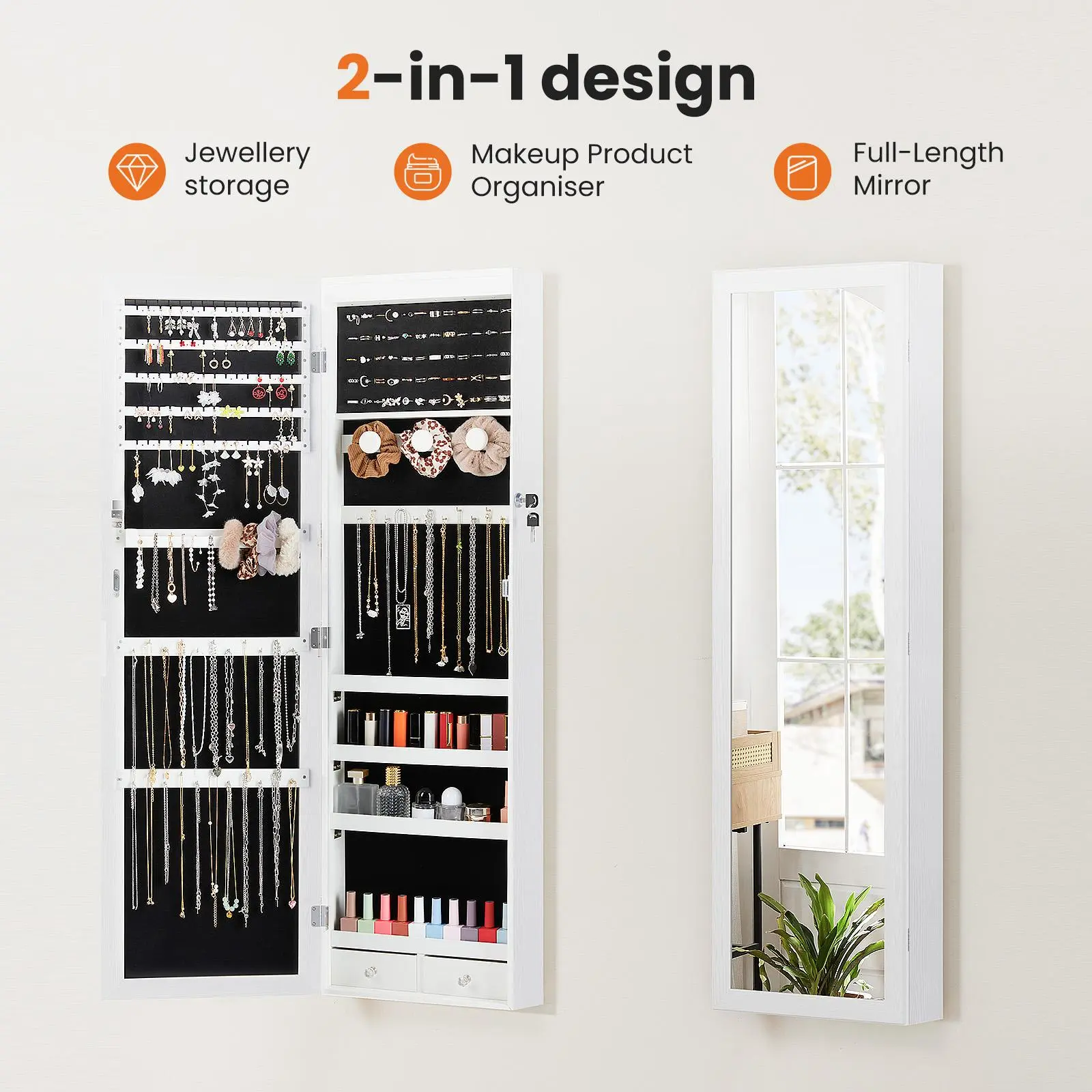 ·[Elegant Modern Jewellery Cabinet ] Jewellery Cabinet is made from MDF for strength and durability, with a mirrored frame to prevent fingerprint staining. Fine lined fabric, unique hooks and dresser features for easy dressing and 2 adjustable drawers designed to easily organise and protect your jewellery collection.