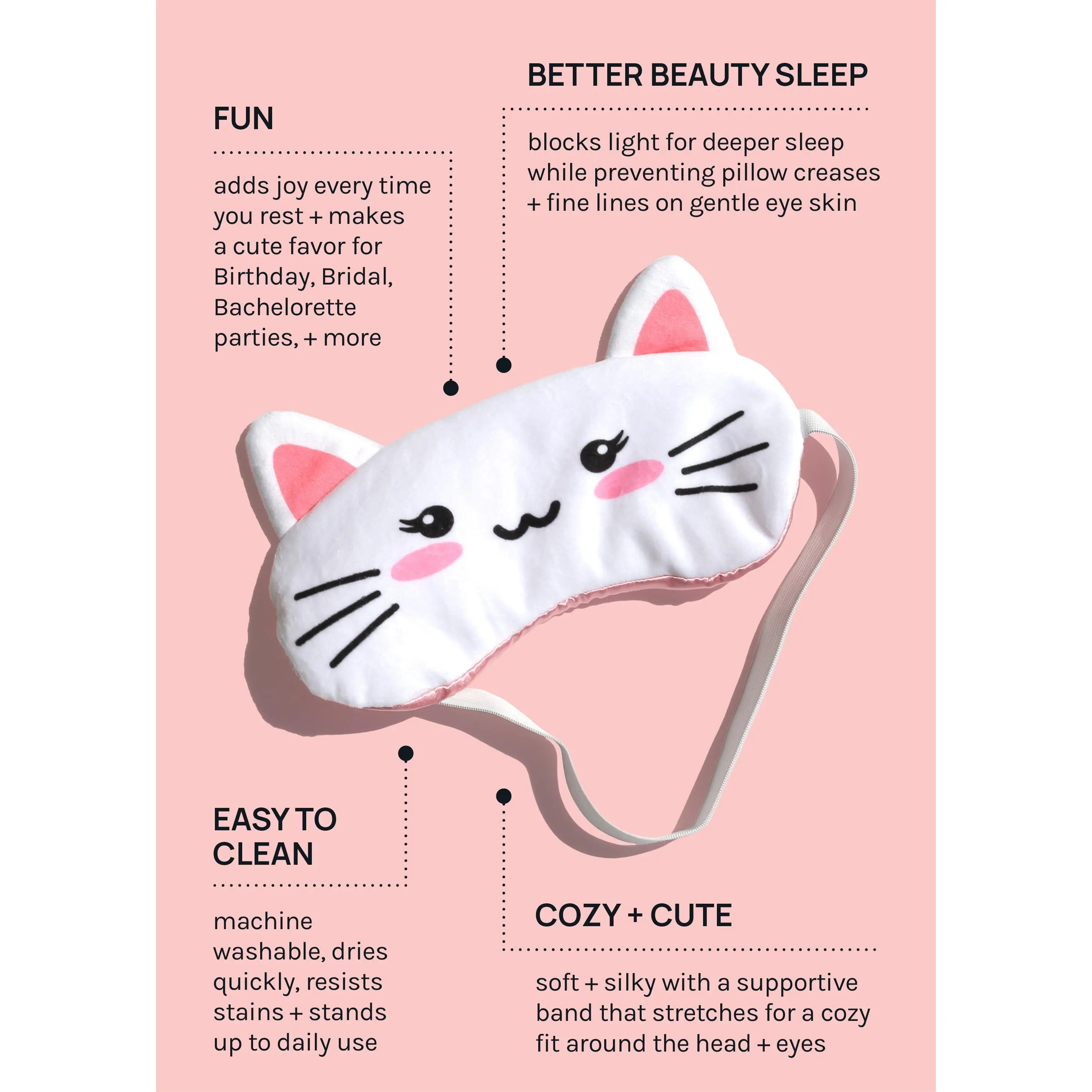 Get better sleep while looking cute with Miss A Friends Sleeping Mask! This Sleeping Mask is your newest nighttime + travel go-to by helping block out light so you can fall asleep faster, improving your overall sleep quality. It acts as a smooth anti-aging surface for the gentle eye area, preventing pillow creases, friction + more.