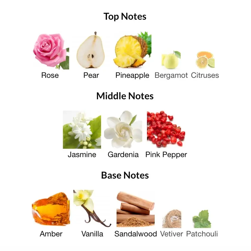·Top Notes: including Bergamot, Rose, Citruses, Pear, and Pineapple