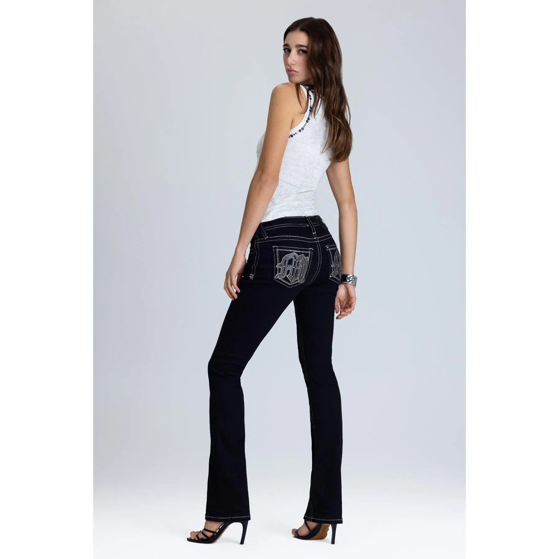 Mid-rise bootcut jeans- Embroidered logo monogram design with studded embellishments- Metallic contrast multi-stitched detailing for a three-dimensional effect- Rhinestone rivet accents- Embossed black studded leather cross Miss Me brand patch- 5-pocket designStyle No. M9554BL-B01, M9554BS-B01, M9554BV-B01
