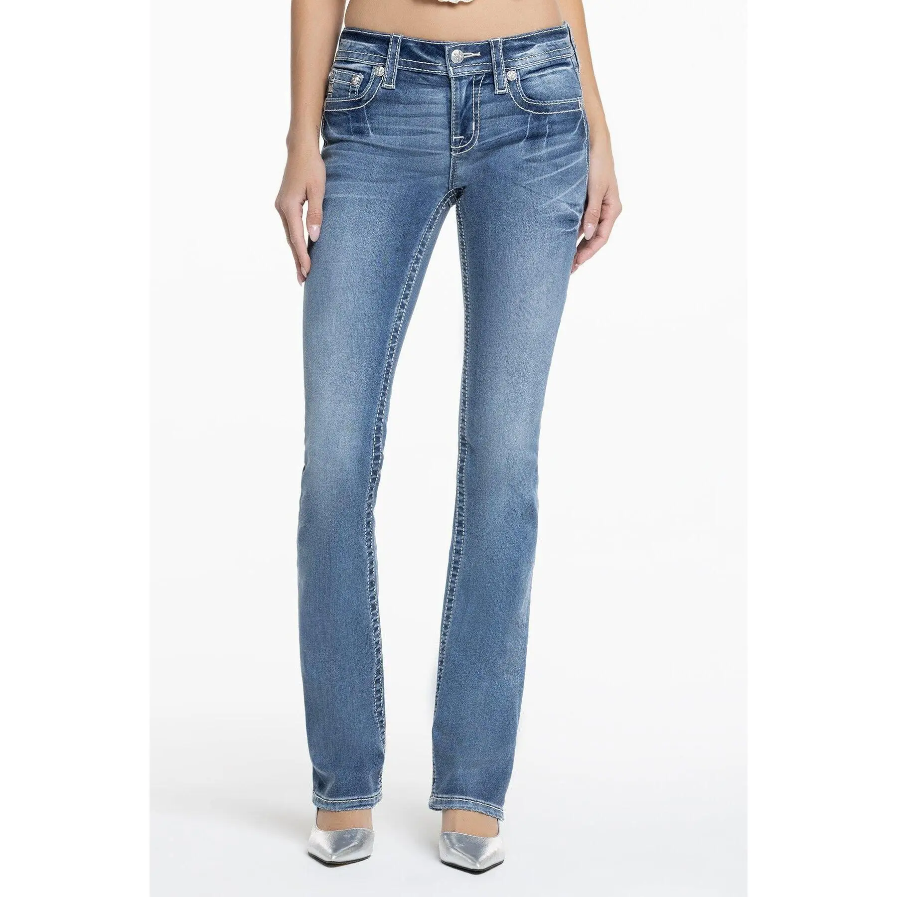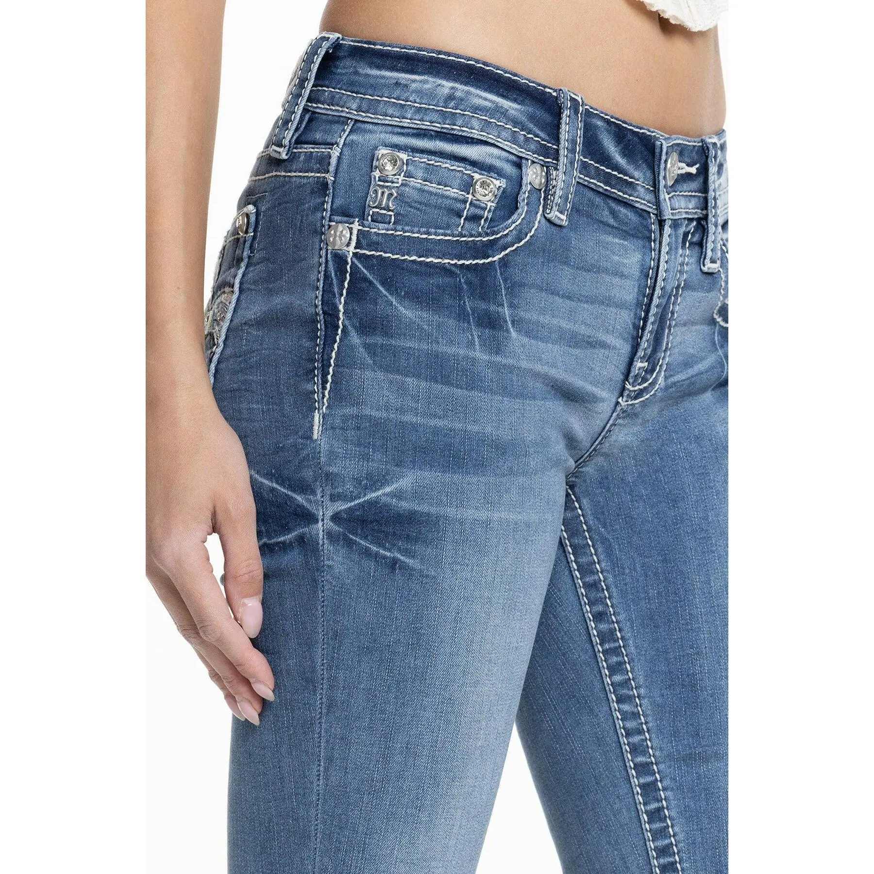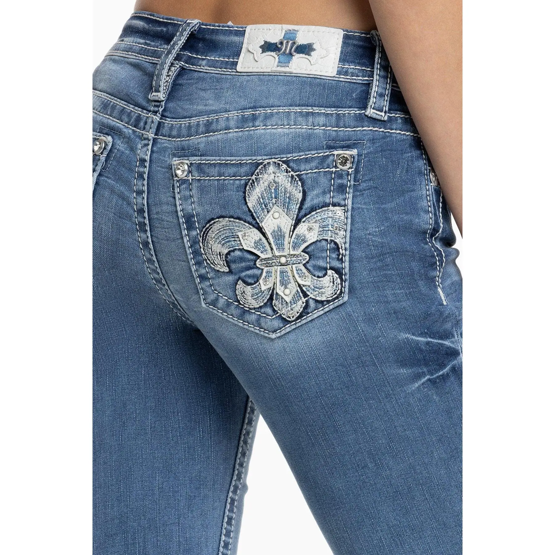 Washed, mid-rise bootcut jeans - Embroidered fleur-de-lis back pocket design - Leather appliqué accents with sequins, faux pearls and rhinestone rivet highlights - Embossed blue leather cross on white Miss Me brand patch - Whiskering details - 5-pocket design