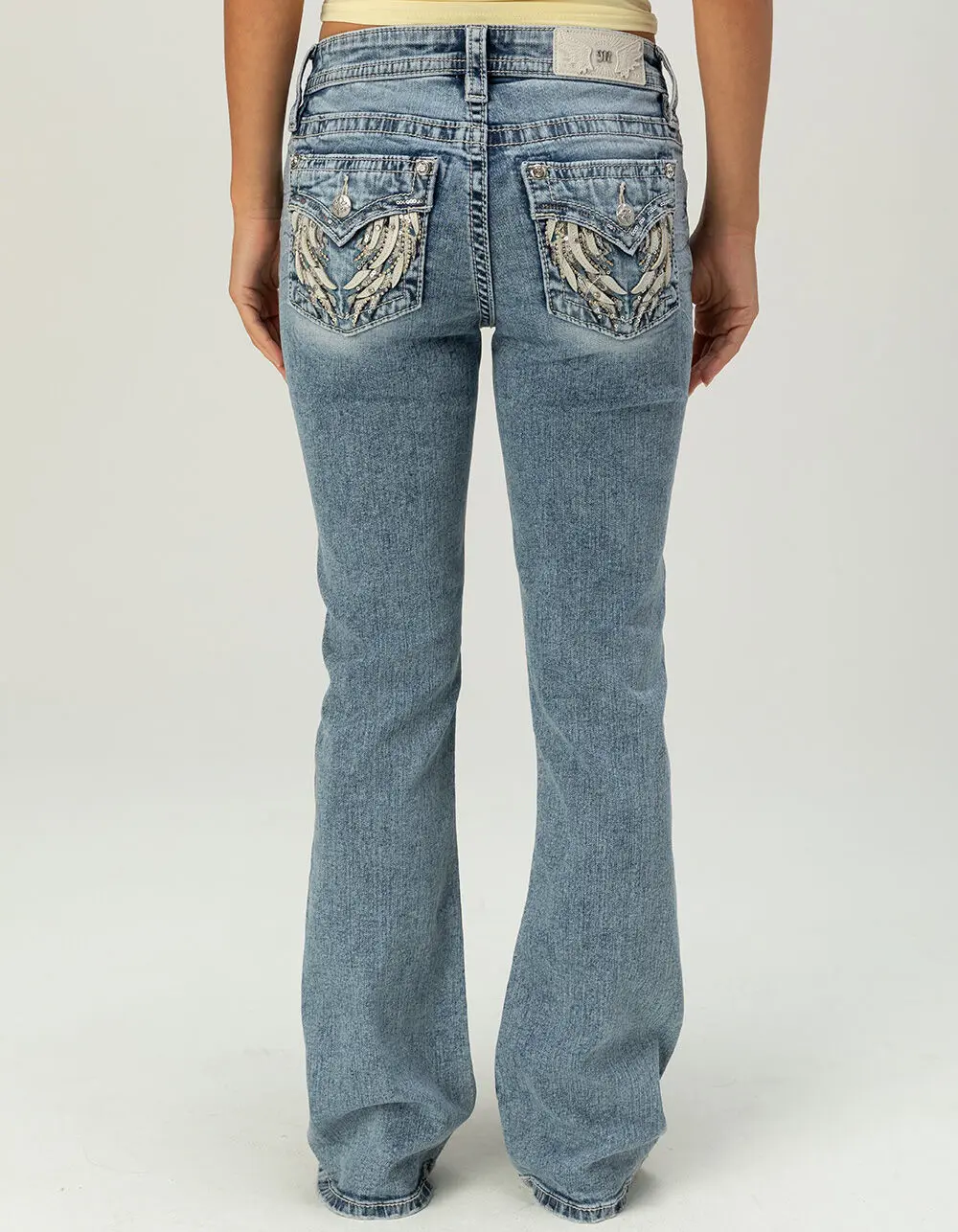 Miss Me Wing Pocket Mid Rise Bootcut Jeans. Step into standout style with the Miss Me Wing Pocket Mid Rise Bootcut Jeans for women. Designed in a flattering mid-rise silhouette, these medium wash jeans feature classic 5-pocket styling with faux flaps on the back pockets for added dimension. The back pockets are richly detailed with leather accents, sequins, rhinestones, and intricate embroidery, creating a bold, signature look, while white contrast stitching enhances the overall design. A button closure with zip fly and belt loops provide a secure, customizable fit, and slight fraying adds a touch of lived-in character. Finished with an approximate 31in inseam and 18in leg opening, these bootcut jeans deliver the perfect blend of statement detail and everyday wearability. 98% Cotton 2% Elastane. Machine wash. Imported.