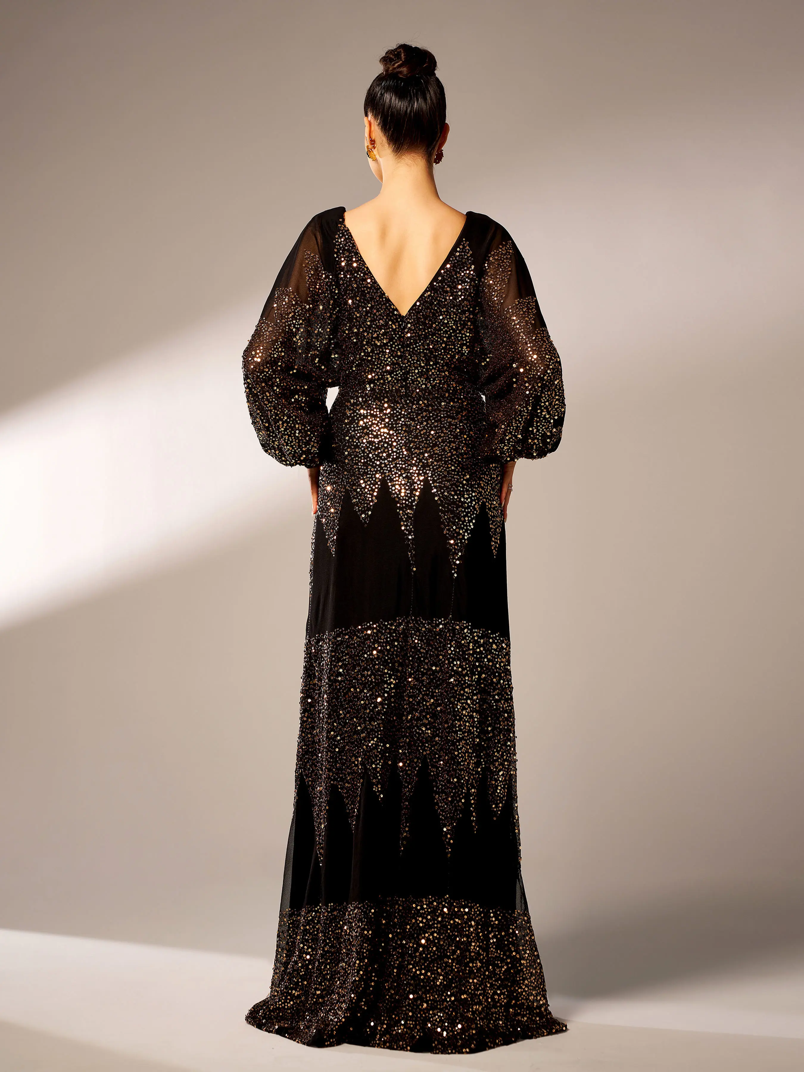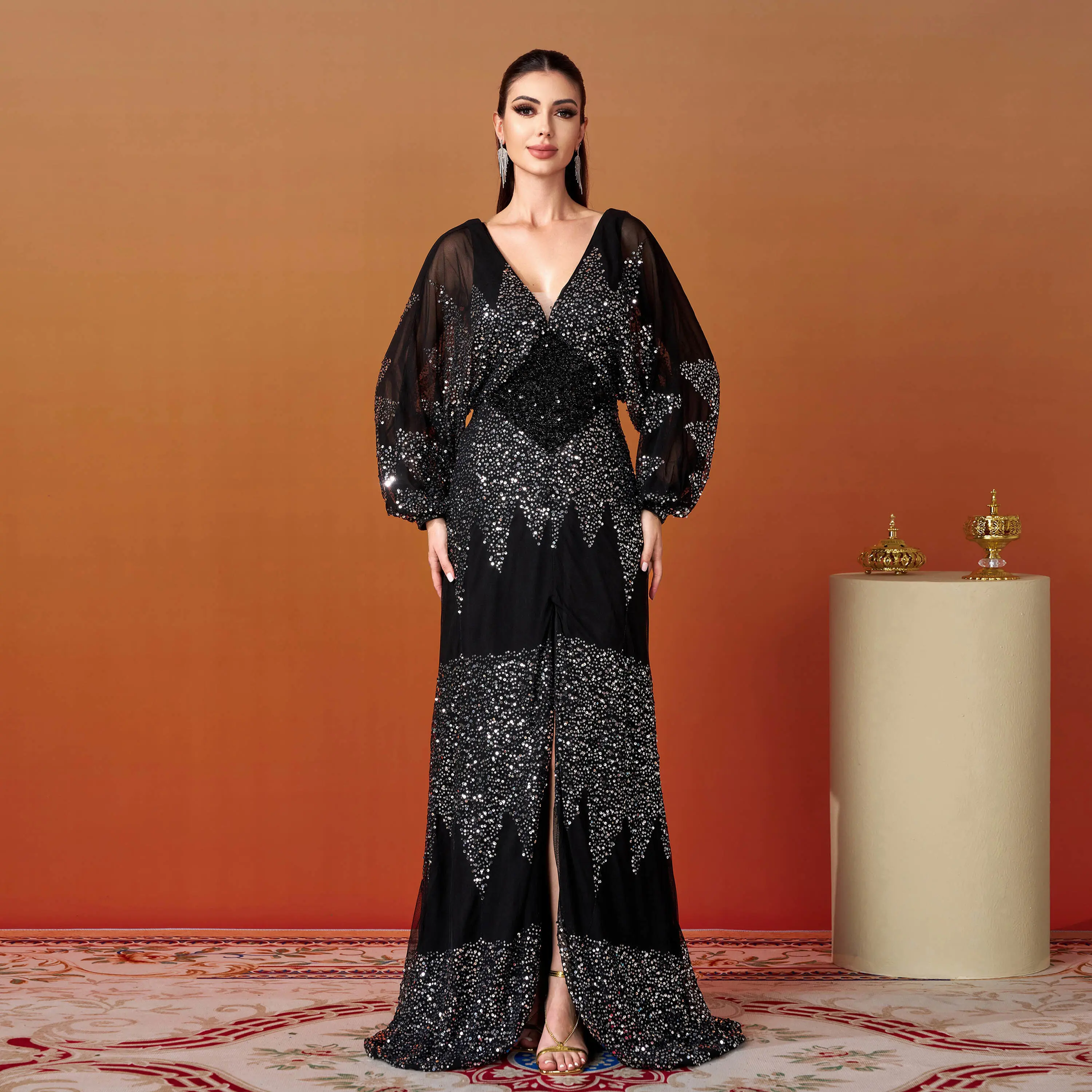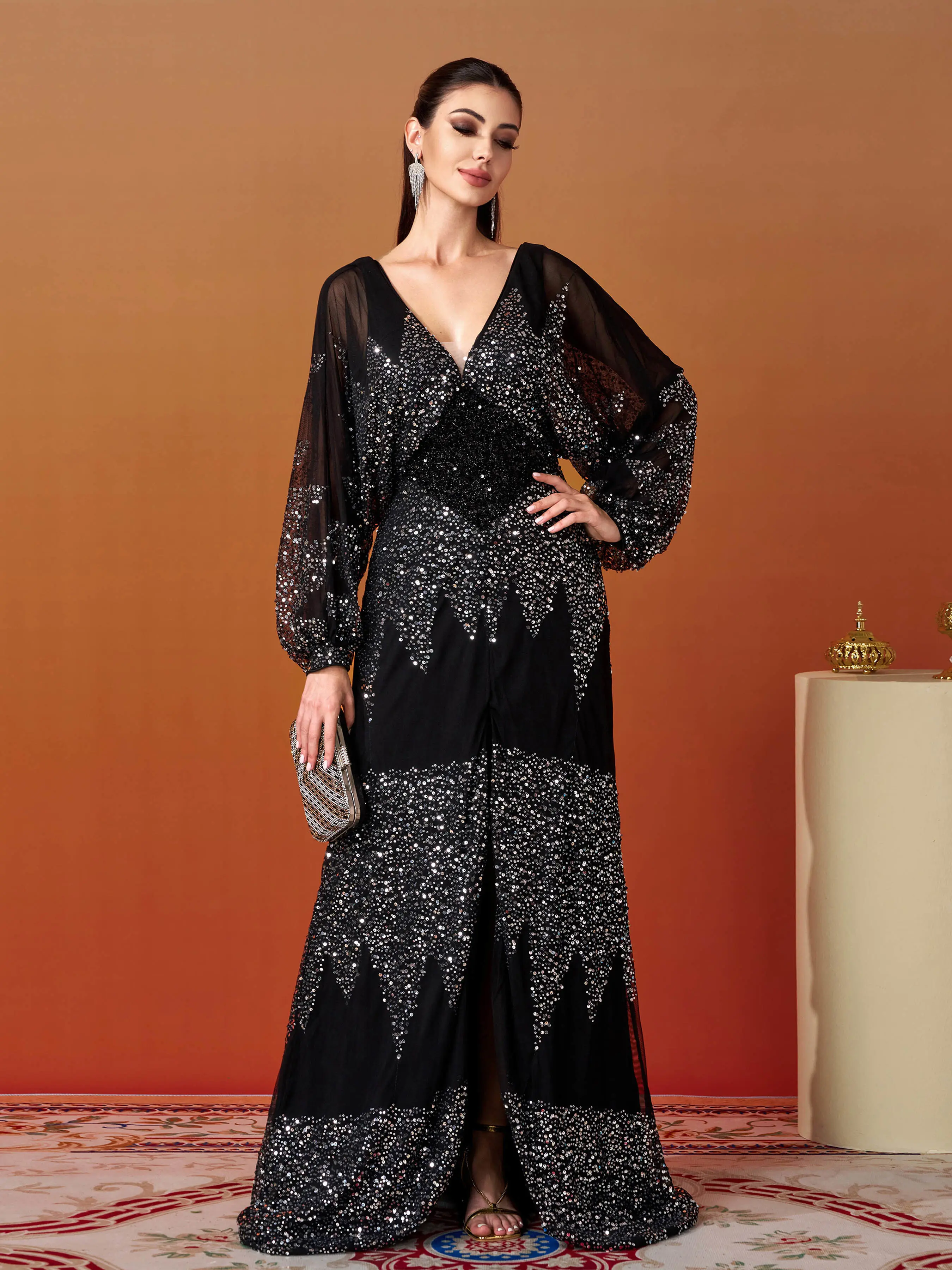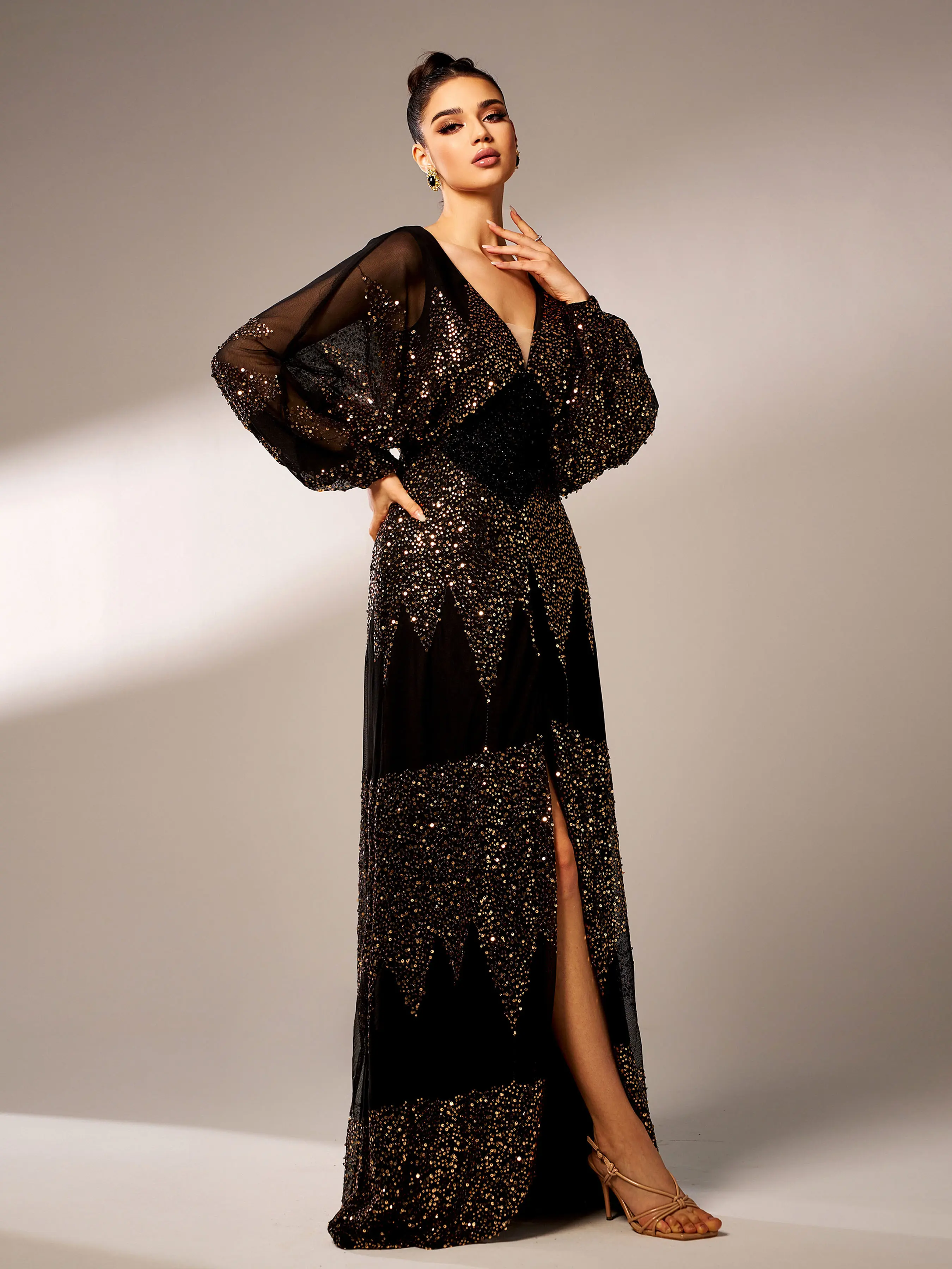 MISSORD Lantern Sleeve V-Neck High Split Black Prom Dress with Sequin Fabric and Back Zip Closure for Formal Events - FitMISSORD Lantern Sleeve V-Neck High Split Black Prom Dress with Sequin Fabric and Back Zip Closure for Formal Events - Fit