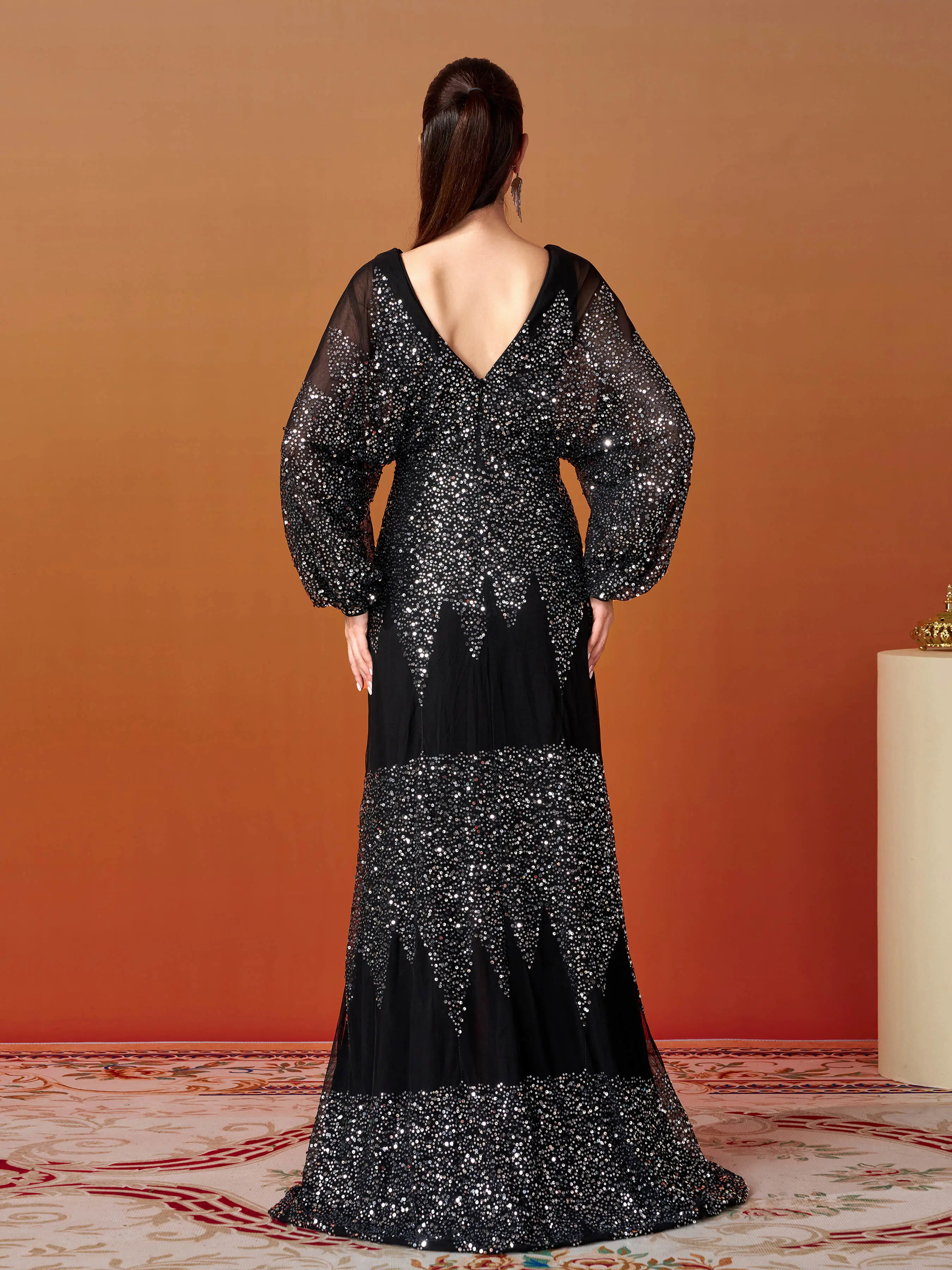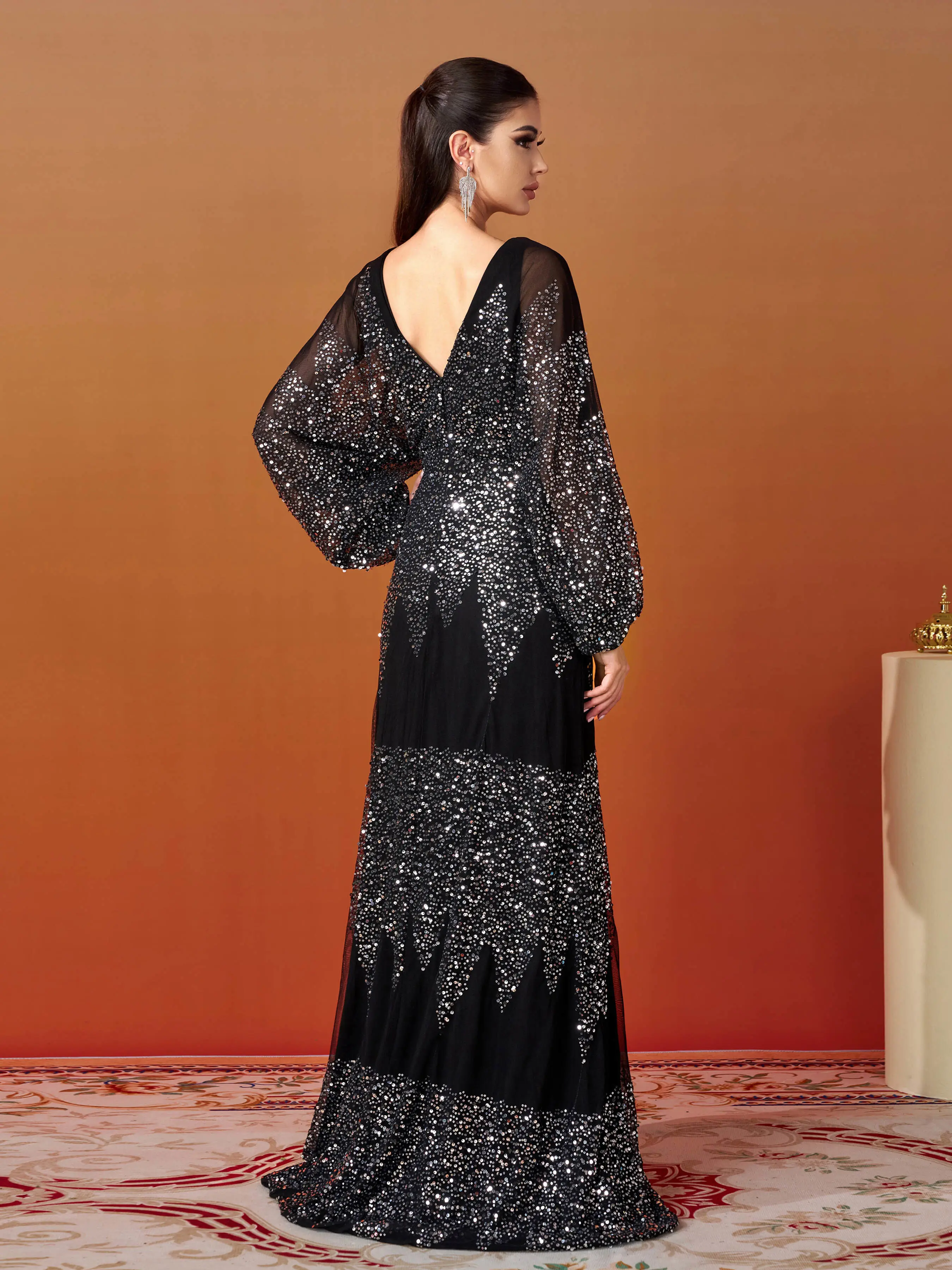 5. MISSORD Lantern Sleeve V-Neck High Split Black Prom Dress with Sequin Fabric and Back Zip Closure for Formal Events - Fit