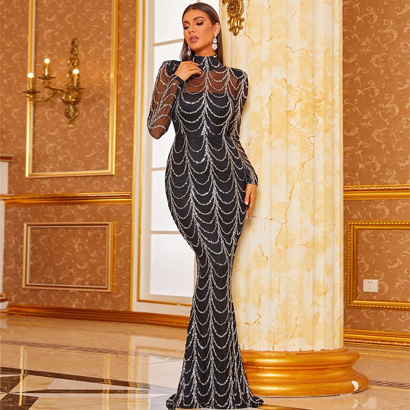 Discover the Missord Mock-Neck Sequin Mesh Prom Dresses, perfect for formal occasions. This black, elegant gown features a high waist and slim fit, ensuring a glamorous look. The stand collar and long sleeves add sophistication. Made from 100% polyester with slight stretch, it's both stylish and comfortable. 🌟