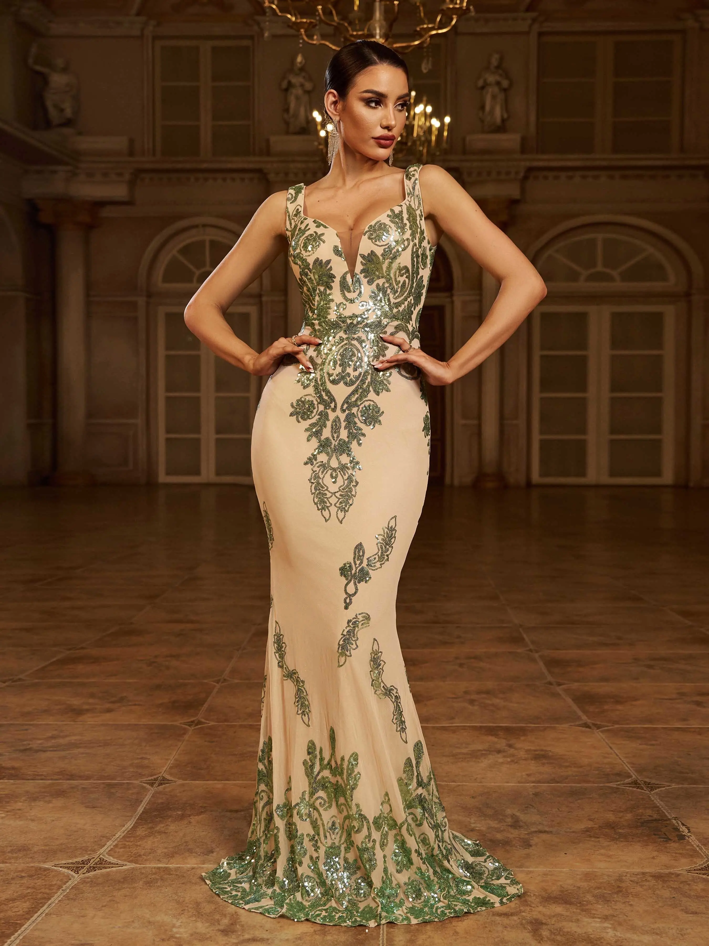 5. MISSORD Sleeveless Mermaid Sequin Gown evening maxi Dress Fit Formal Prom Dresses Apricot Floral Slim Fit High Waist Elegant Cami red carpet pram v neck