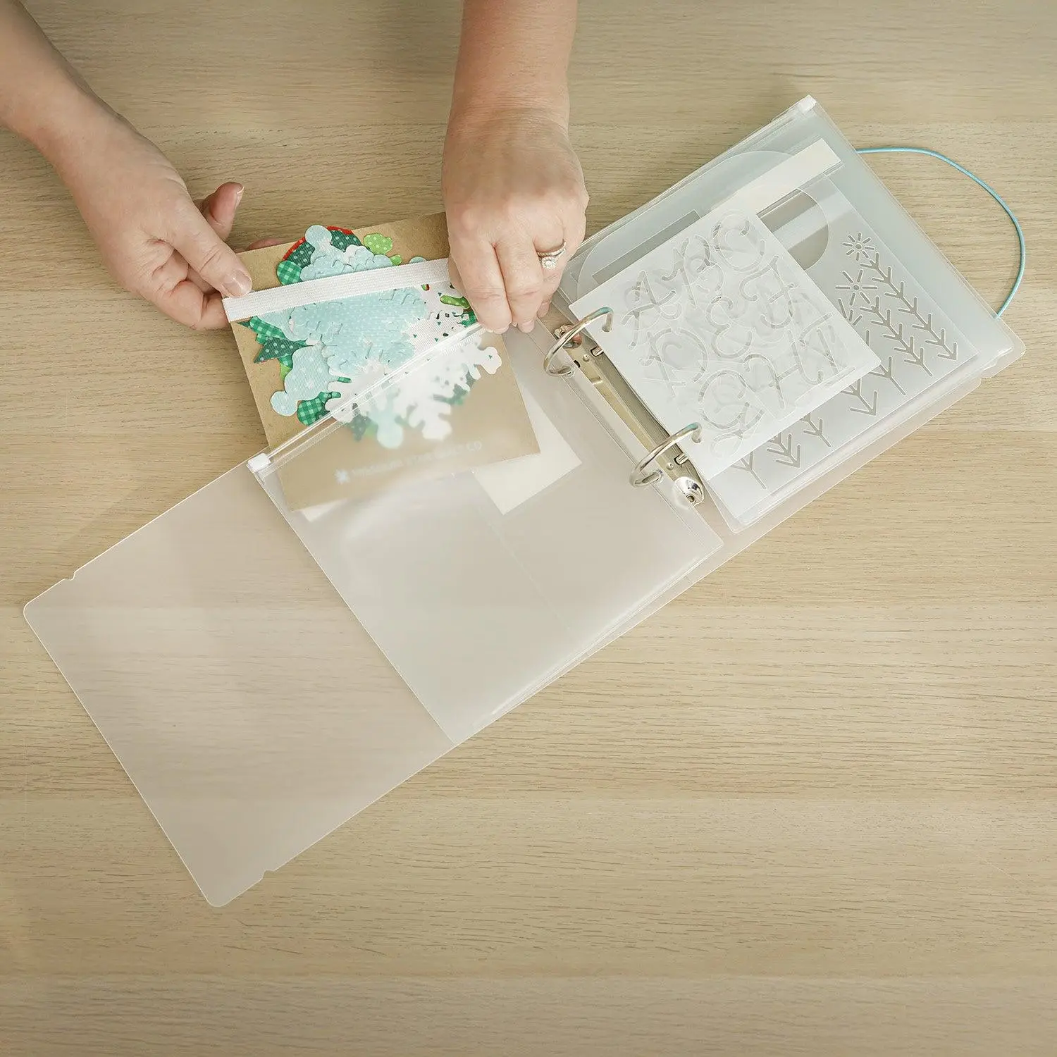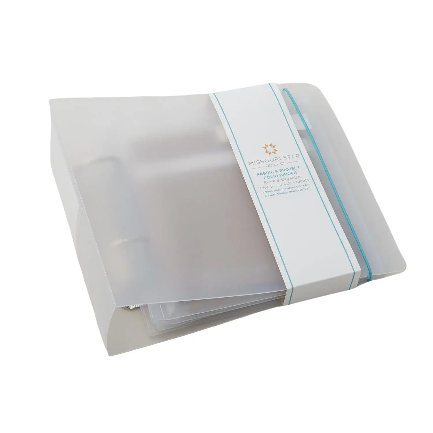 Store and organize your 5" square precuts with this handy fabric folio from Missouri Star! This folio includes (1) 10 x 8" [2" D-ring] binder with pocket and card, featuring translucent clear plastic and a teal elastic closure. Inside, you'll find (4) 7.5 x 8" vinyl pouches with pocket and card (zip closure) and (4) 6 x 6" fabric boards with elastic. Each folio stores four charm packs!