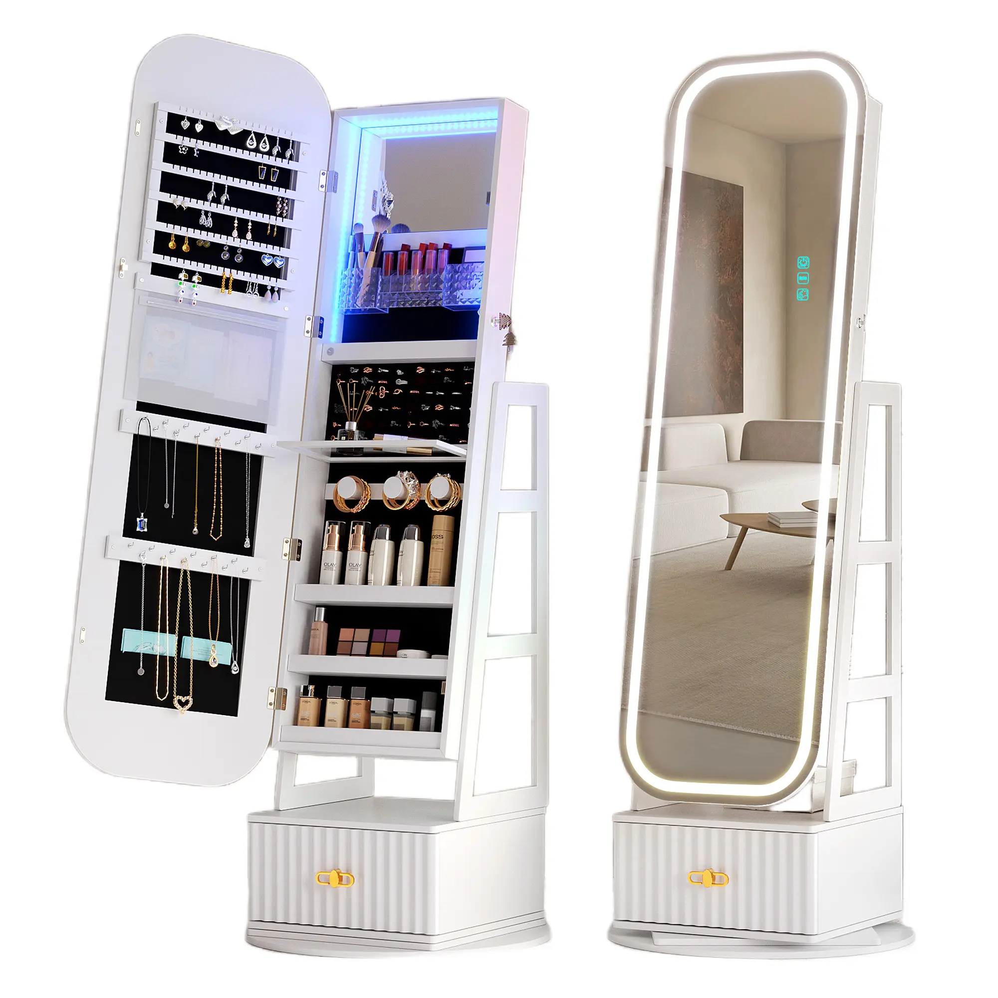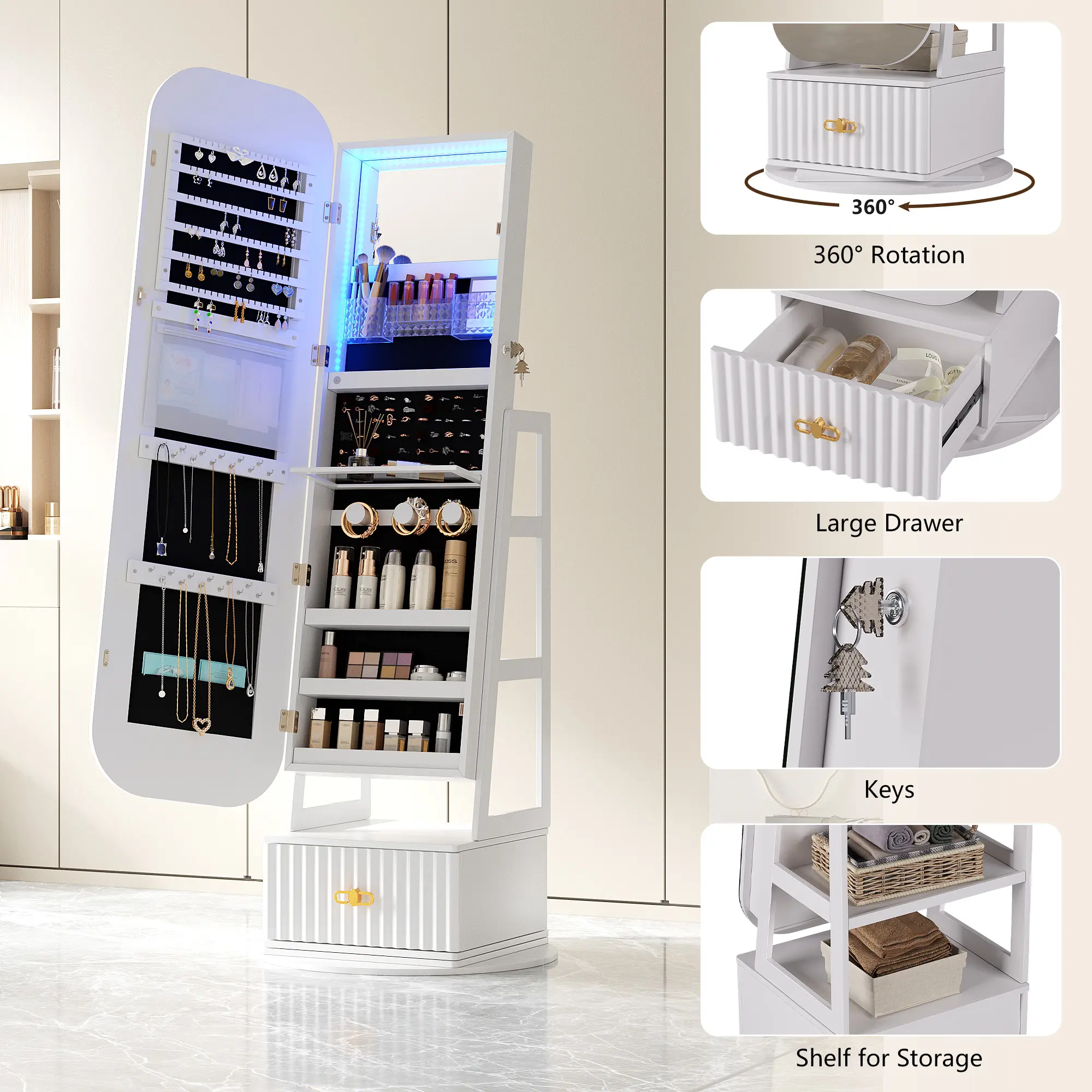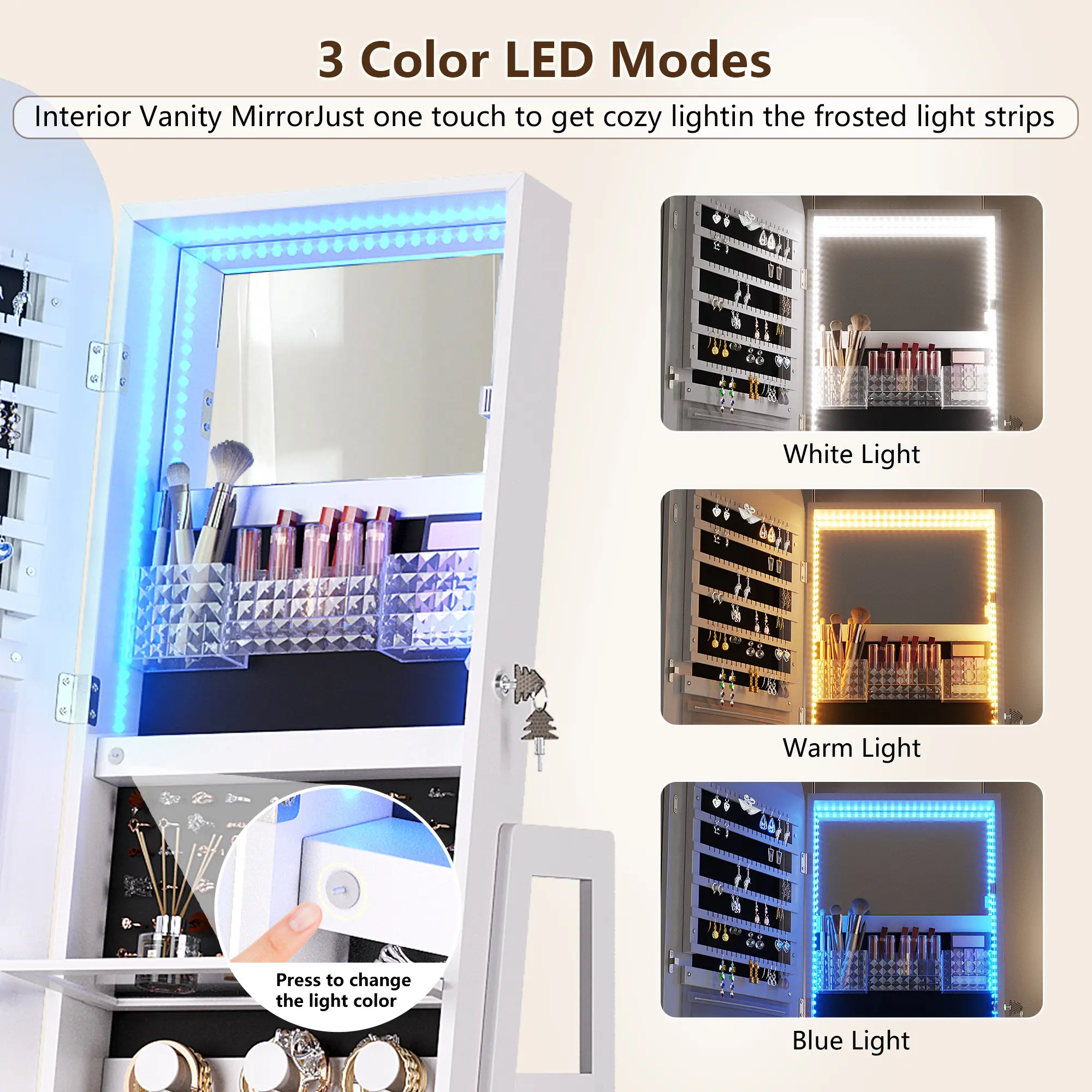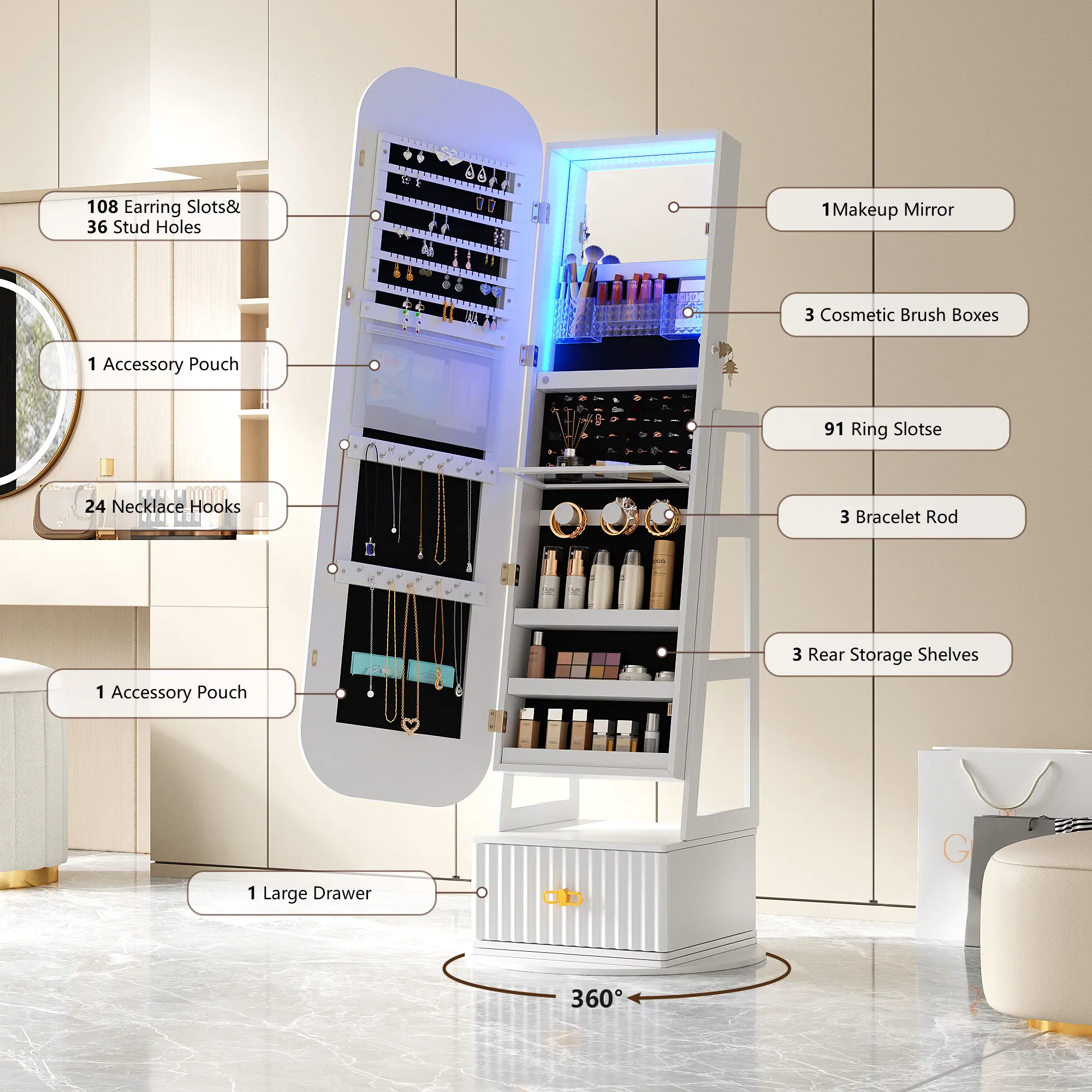 Really cute and has good storage! Took me around 1.5 hours to set up by myself. The lights on both the mirror and the inside are quite bright. The remote works well too! I only wish it had more necklace storage and less earring storage.