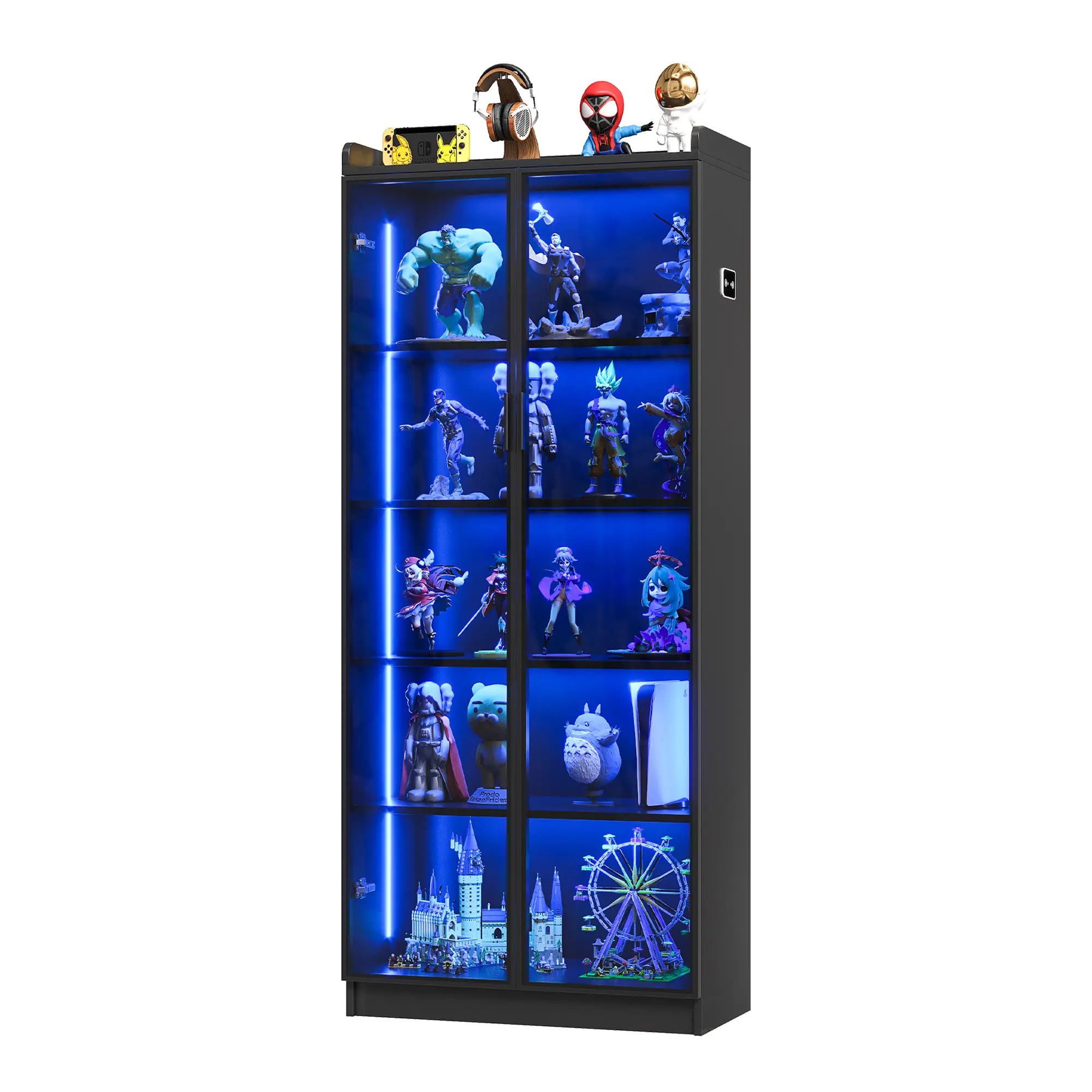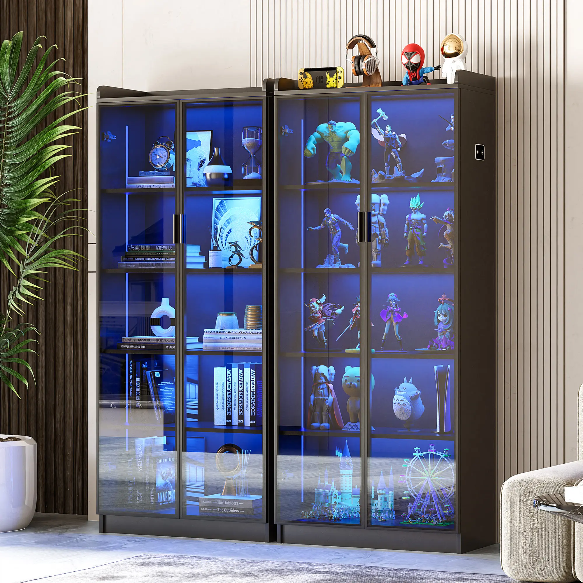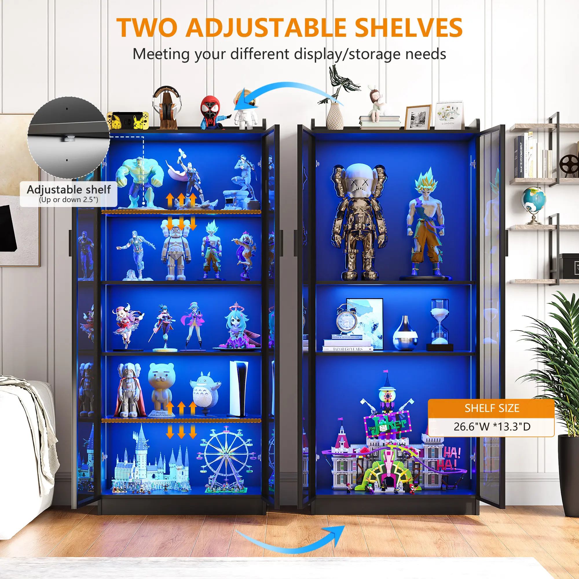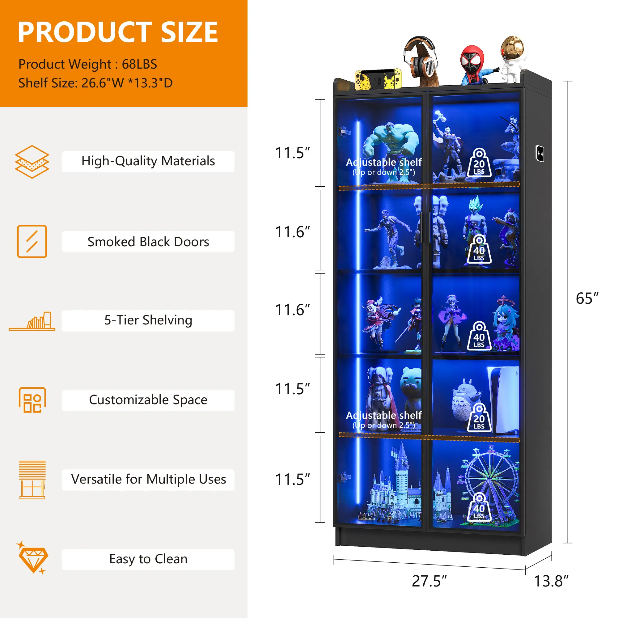 Sufficient Storage Space: Dimensions of 13.78" D x 27.56" W x 64.96" H. Dystler cabinet comes with 2 adjustable shelves and 2 fixed shelves, providing you with sufficient capacity to organize books, place toys, store food, and moreConcise & Beautiful Design: The Smoked Black color acrylic door design of the storage organizer allows you to clearly see your favorite antiques, books, and toys, and it complements any family style. It perfectly blends with your elegant home decoration and adds highlights to your roomHigh-Quality Wooden Material: Our display case is crafted from premium-quality wood, ensuring durability and longevity. It is also waterproof and easy to clean, so you don't have to worry about water splashes or stains. A simple wipe-down keeps it clean and hassle-free