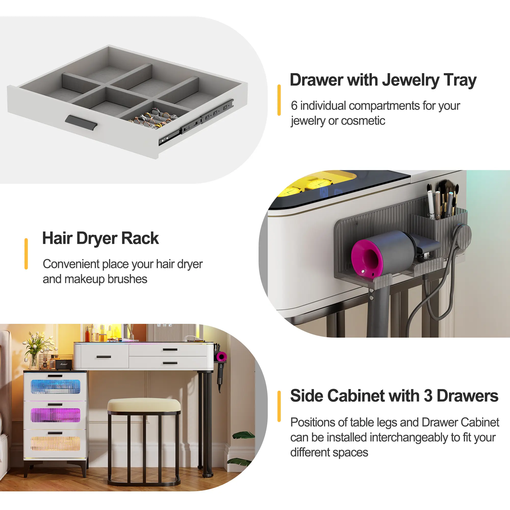 ·【Big Storage】The vanity table has 3 tiers of open and hidden storage shelves, drawer with jewelry organizer box, different storage, better storage for our skincare jewelry and more!