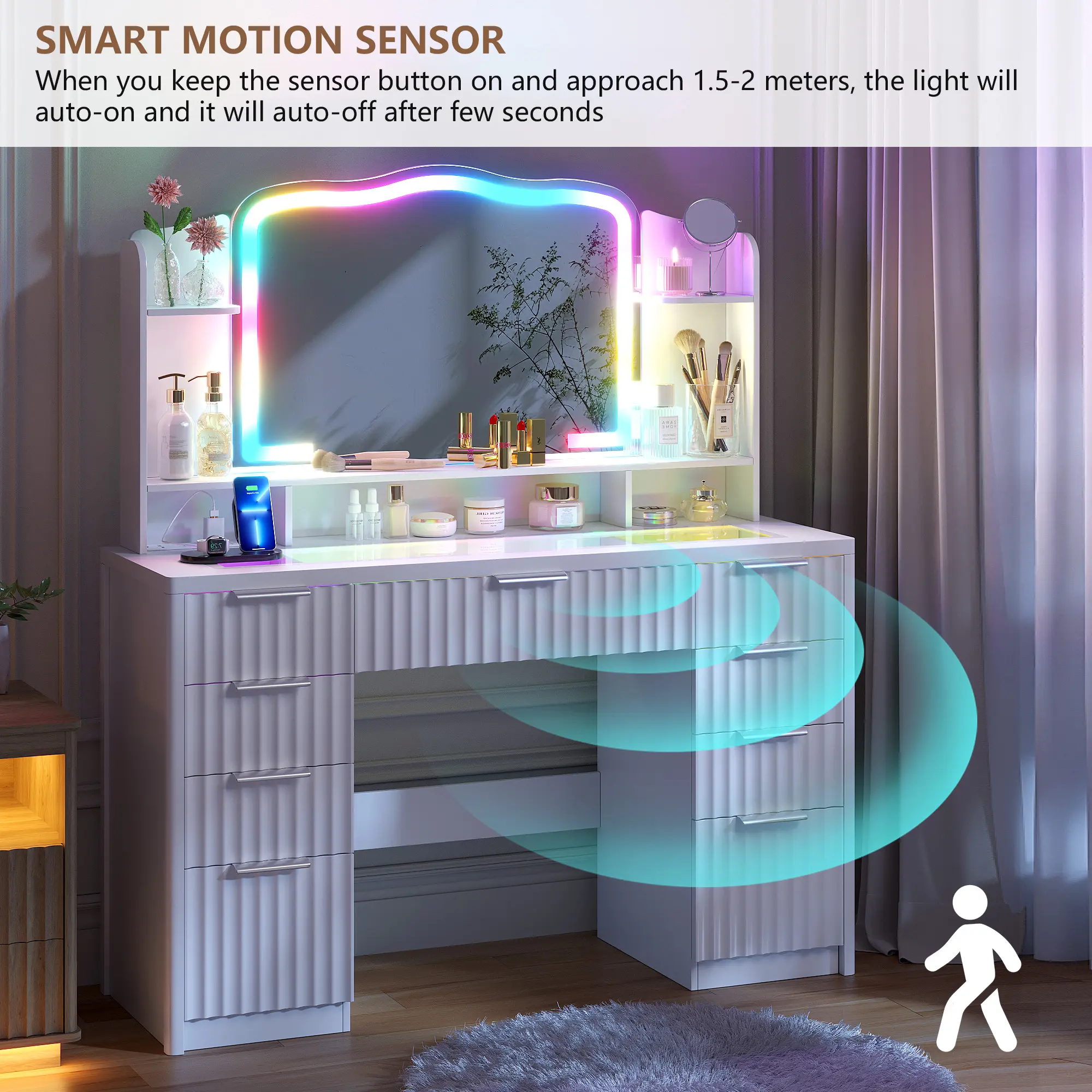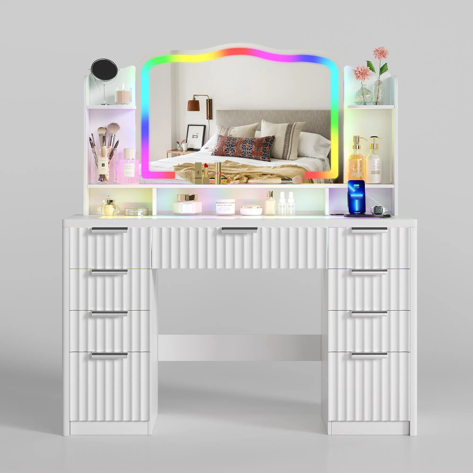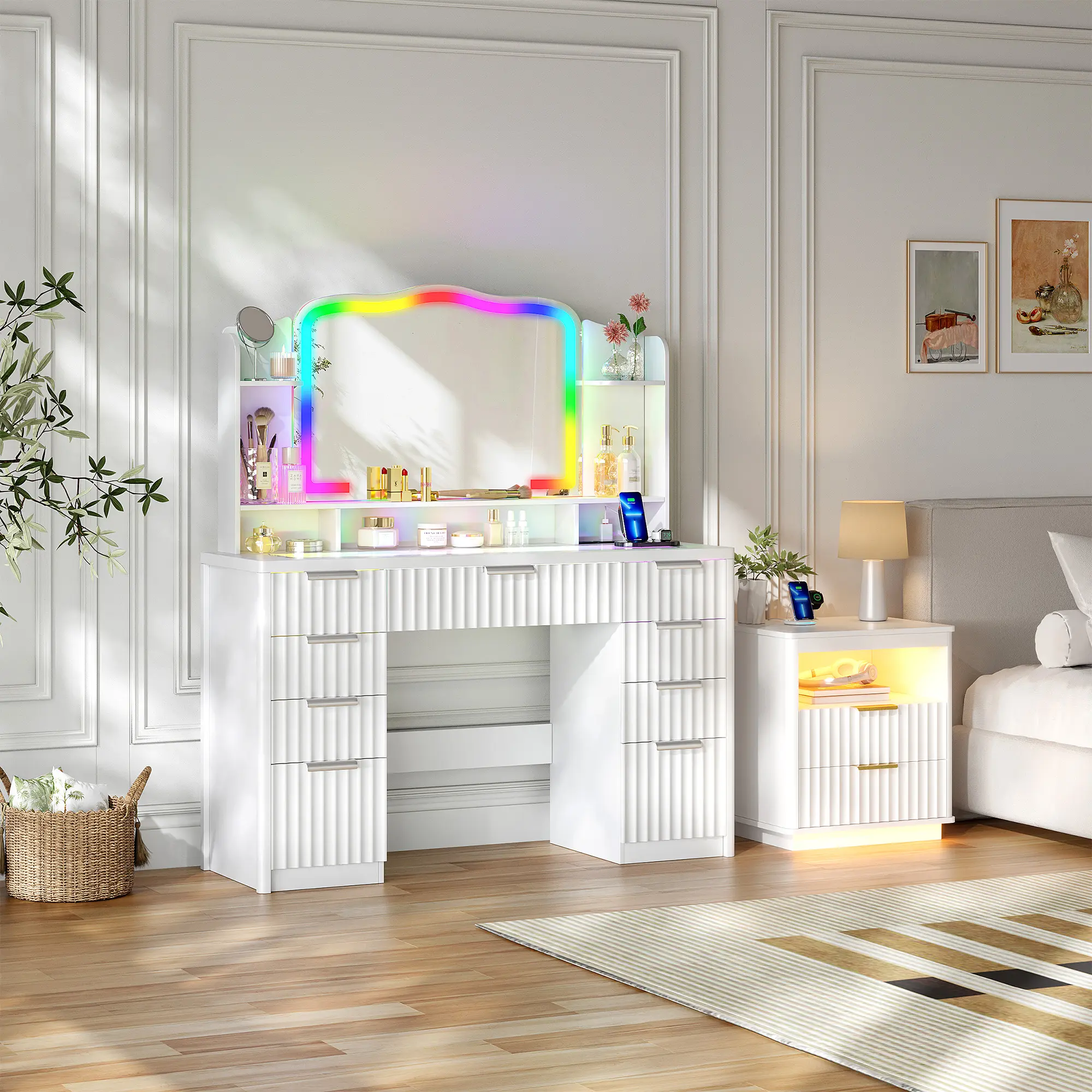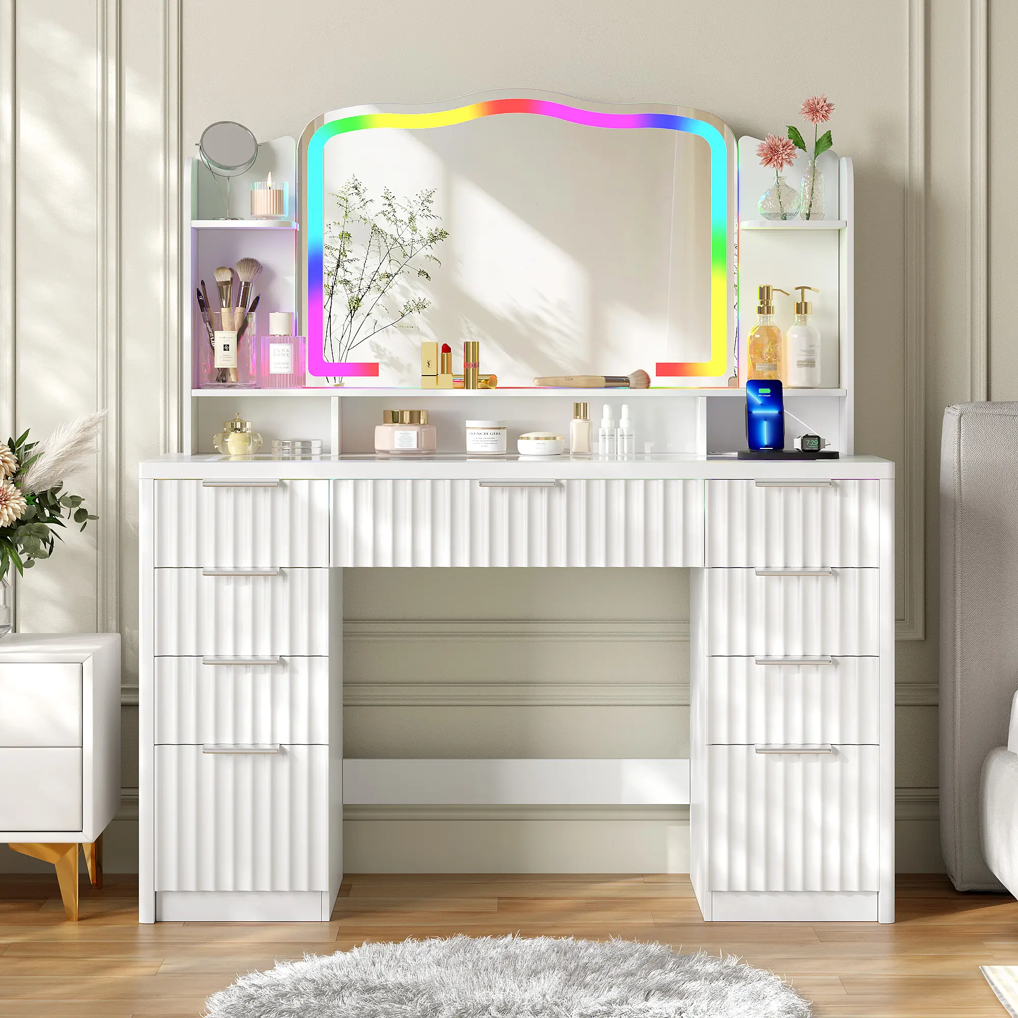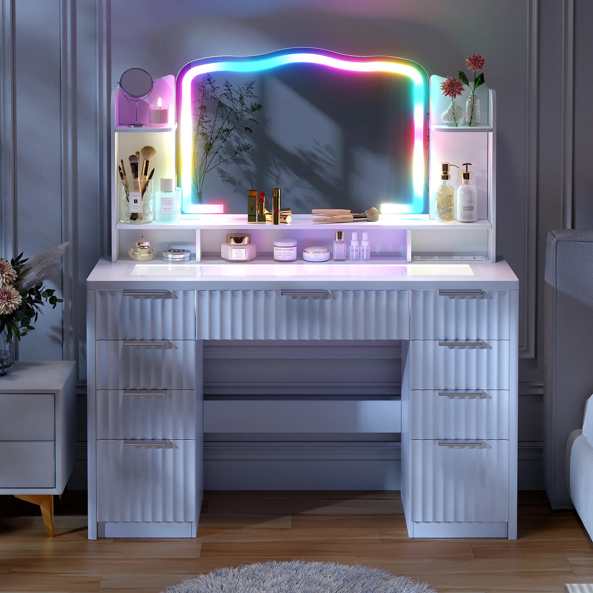 Fluted Makeup Vanity with RGB Lighting