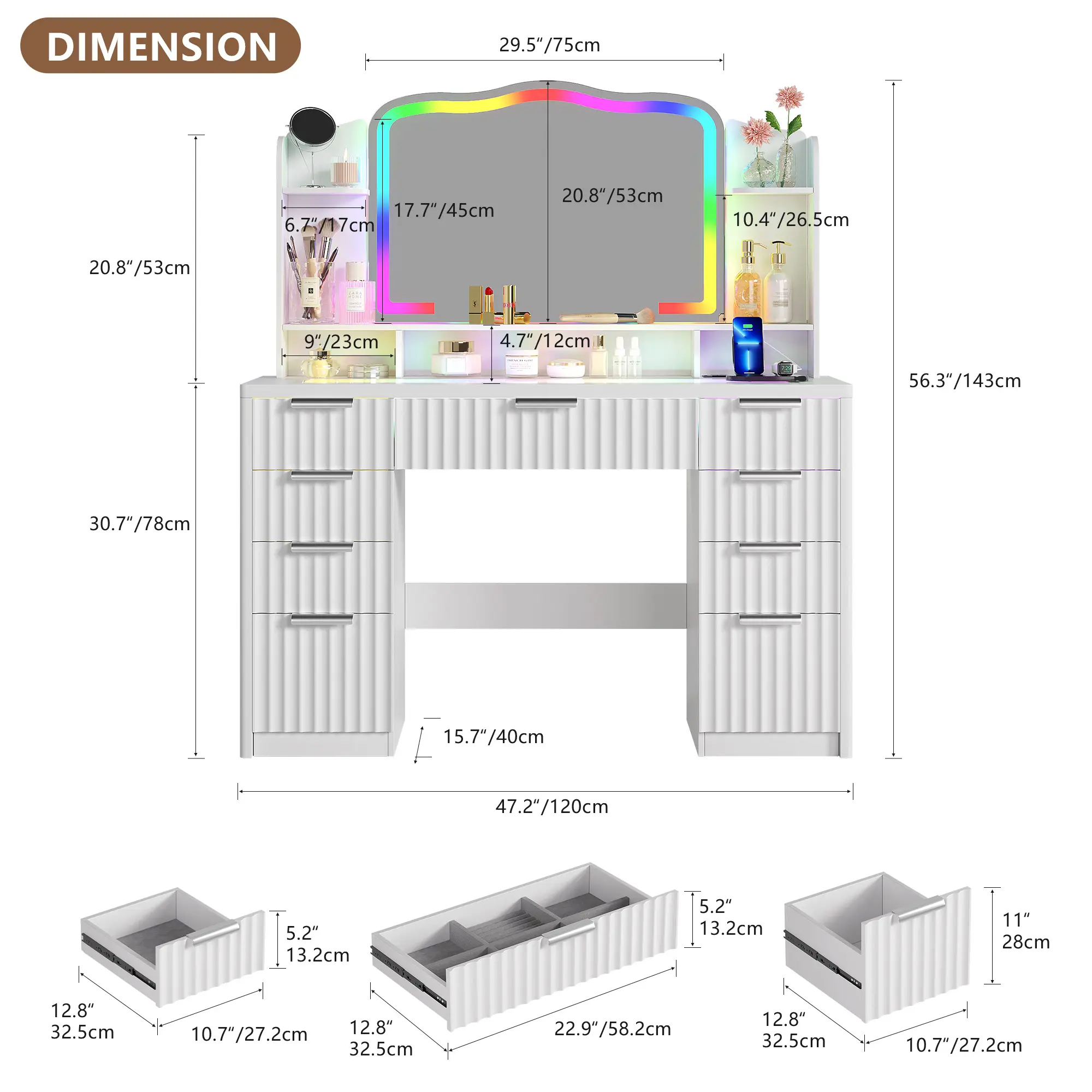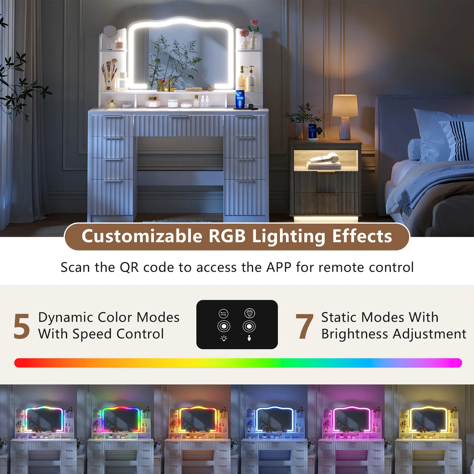 The dresser comes with RGB lighting, offering both dynamic and static options. Control the lighting remotely for a personalized dressing experience. The unique design makes it a standout piece in any room.