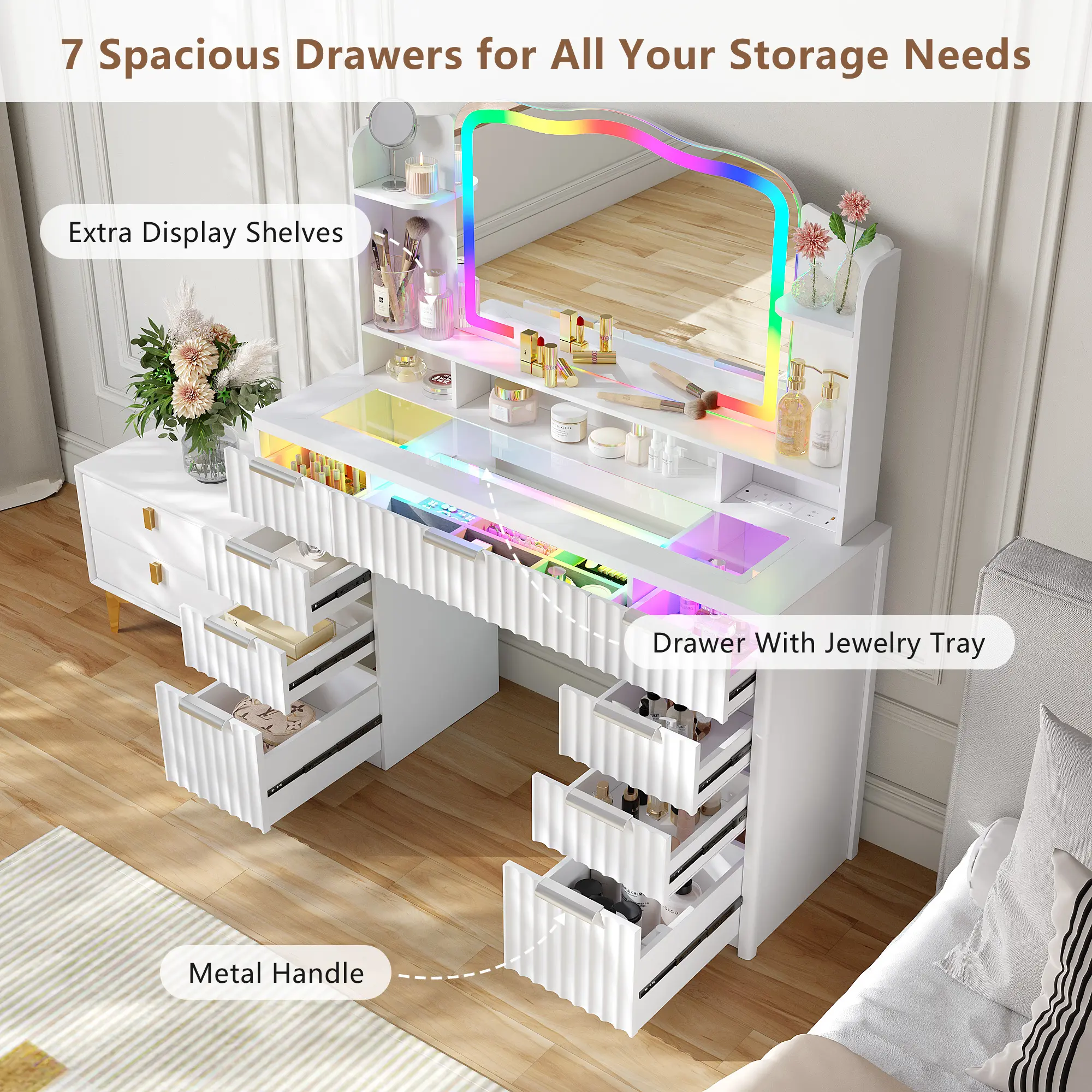 The vanity table has 4 tiers of open and hidden storage shelves, along with a drawer and jewelry organizer box. This provides better storage for skincare, jewelry, and more, ensuring everything is organized.