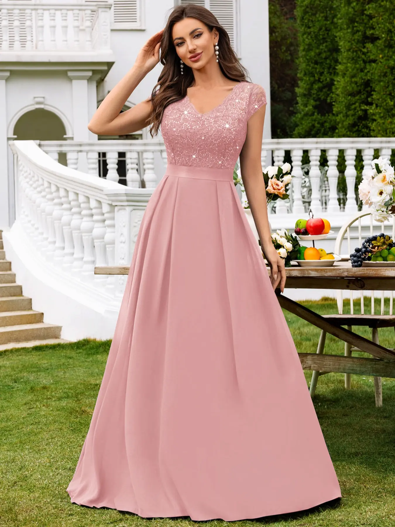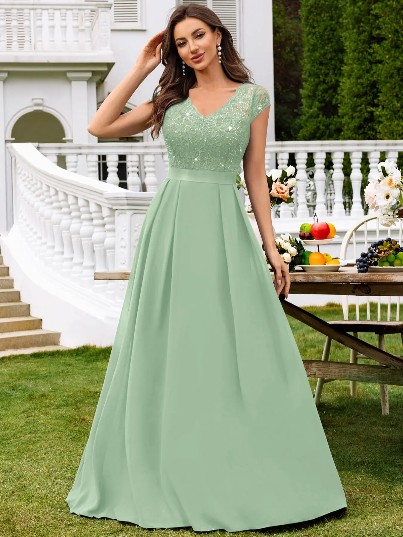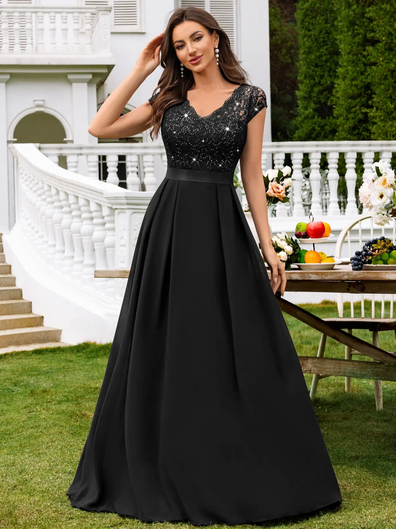 【FEATURES】: Elegant V Neck with lace trim, See-through Lace Patchwork Chiffon Hem, Cap Sleeve, A-Line, Maxi Dress.