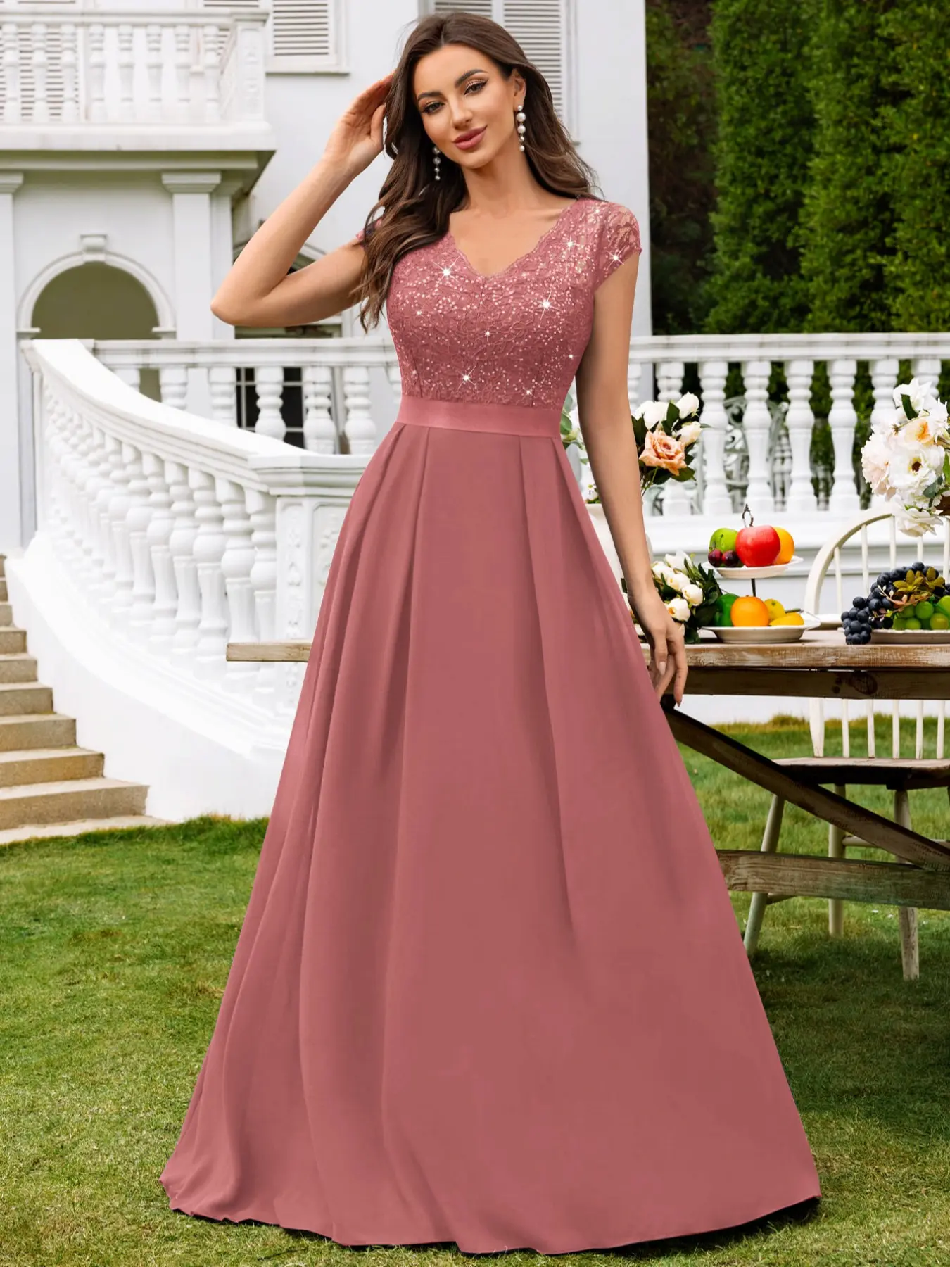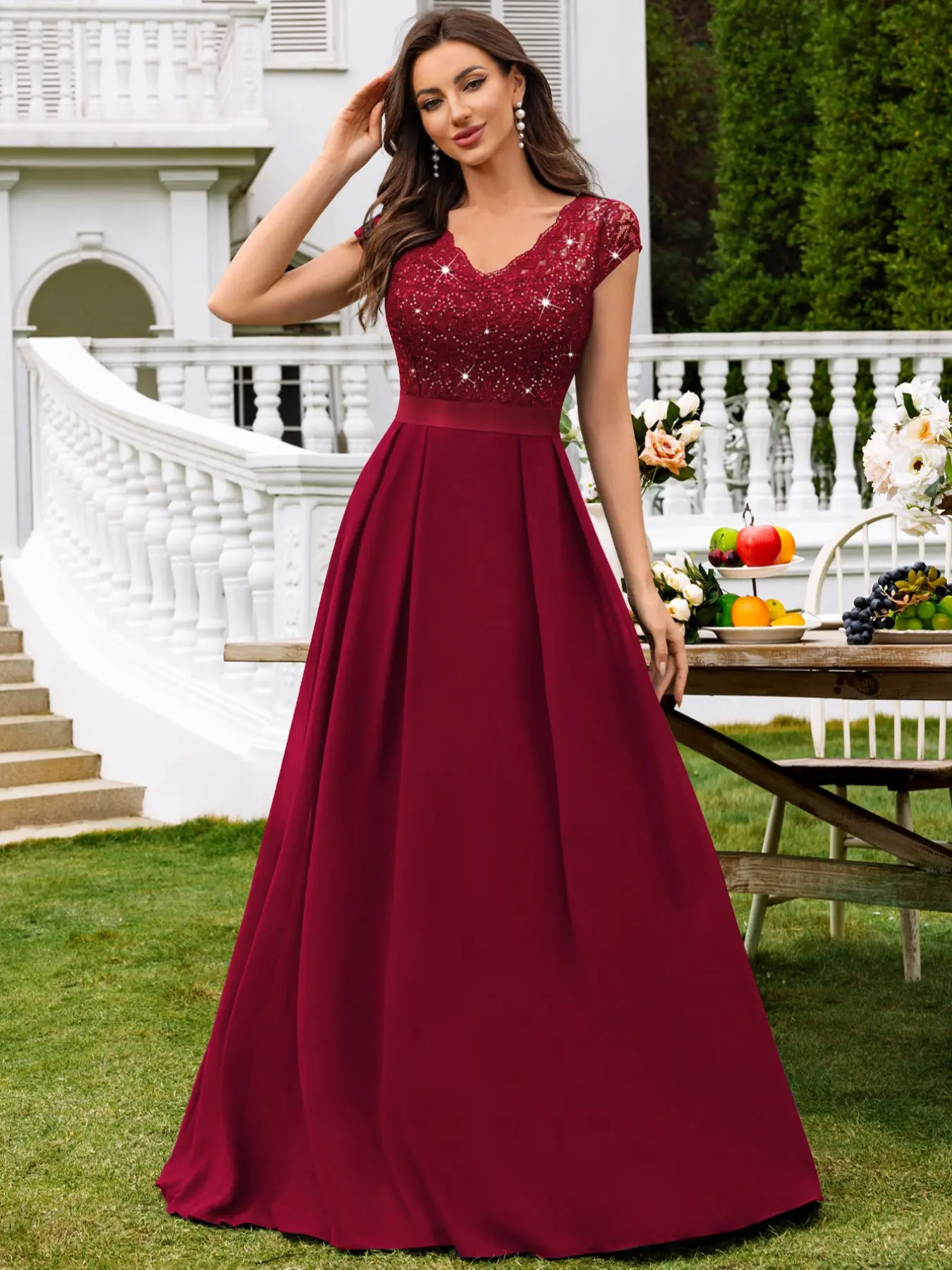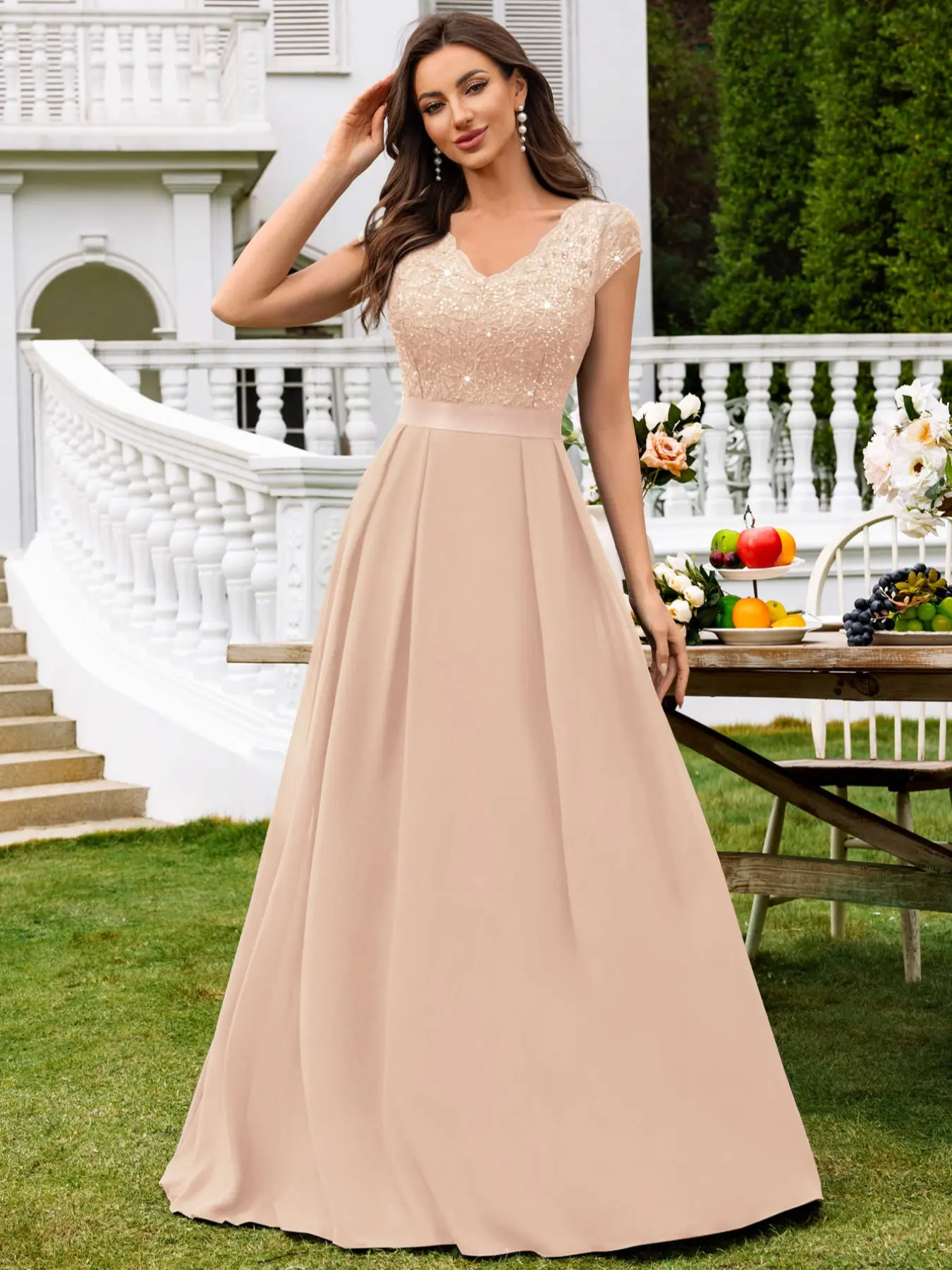 【FEATURES】: Elegant V Neck with lace trim, See-through Lace Patchwork Chiffon Hem, Cap Sleeve, A-Line, Maxi Dress.