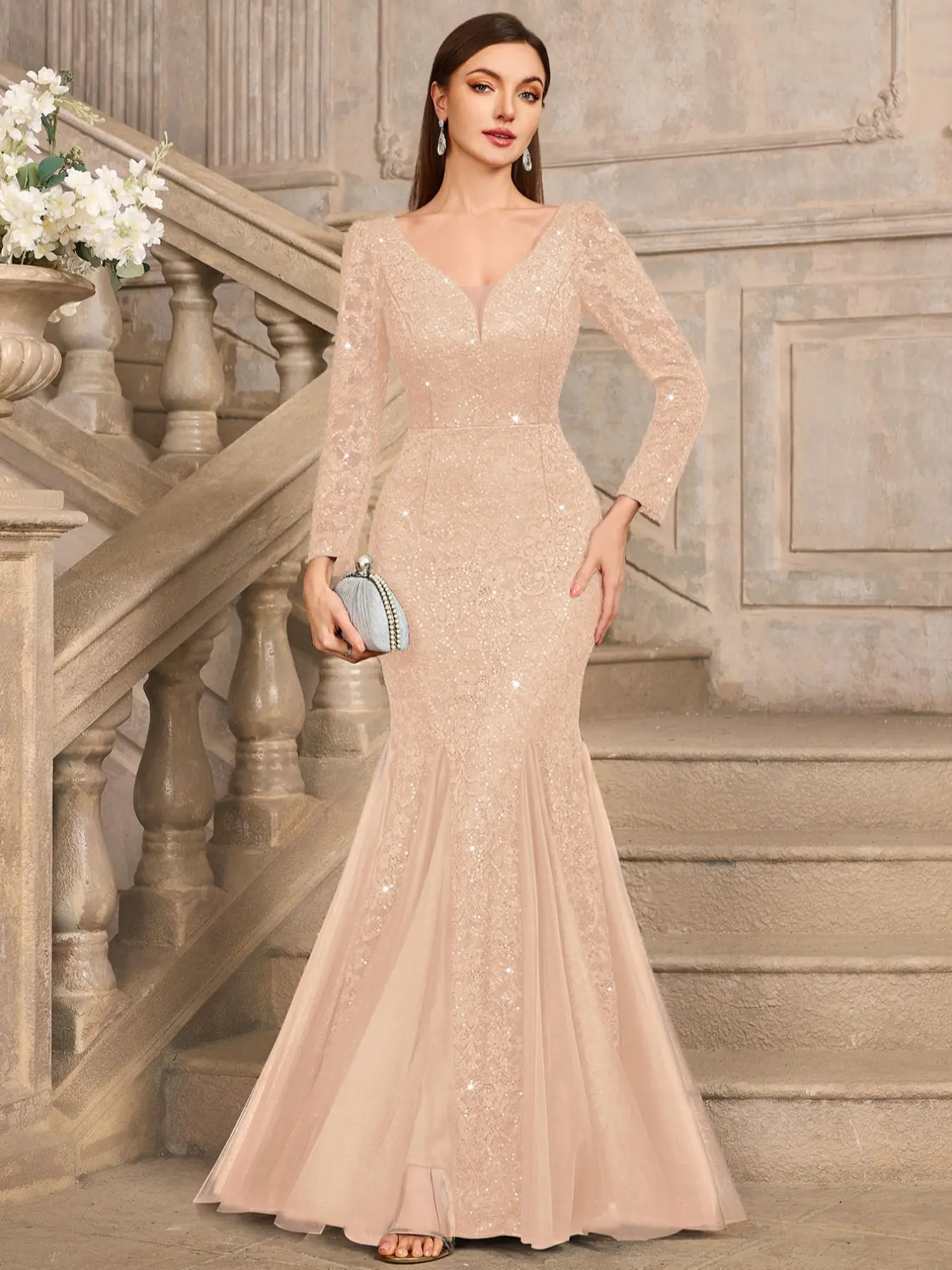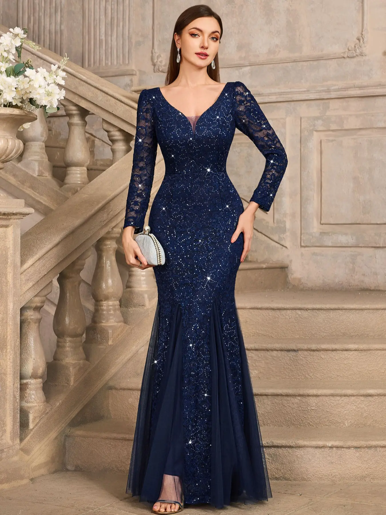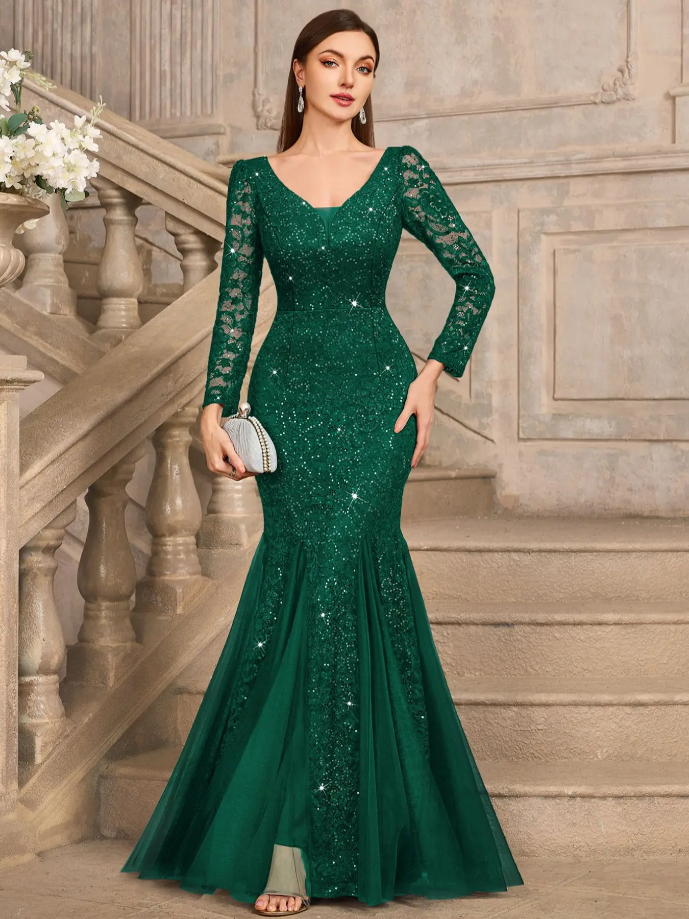 MIUSOL 24459A Sequin Floral Lace Deep V-Neck Long Sleeve Mesh Maxi Mermaid Hem Elegant Classy Evening Cocktail Party Dress, Wedding Guest Dress, Formal Dress, Gown