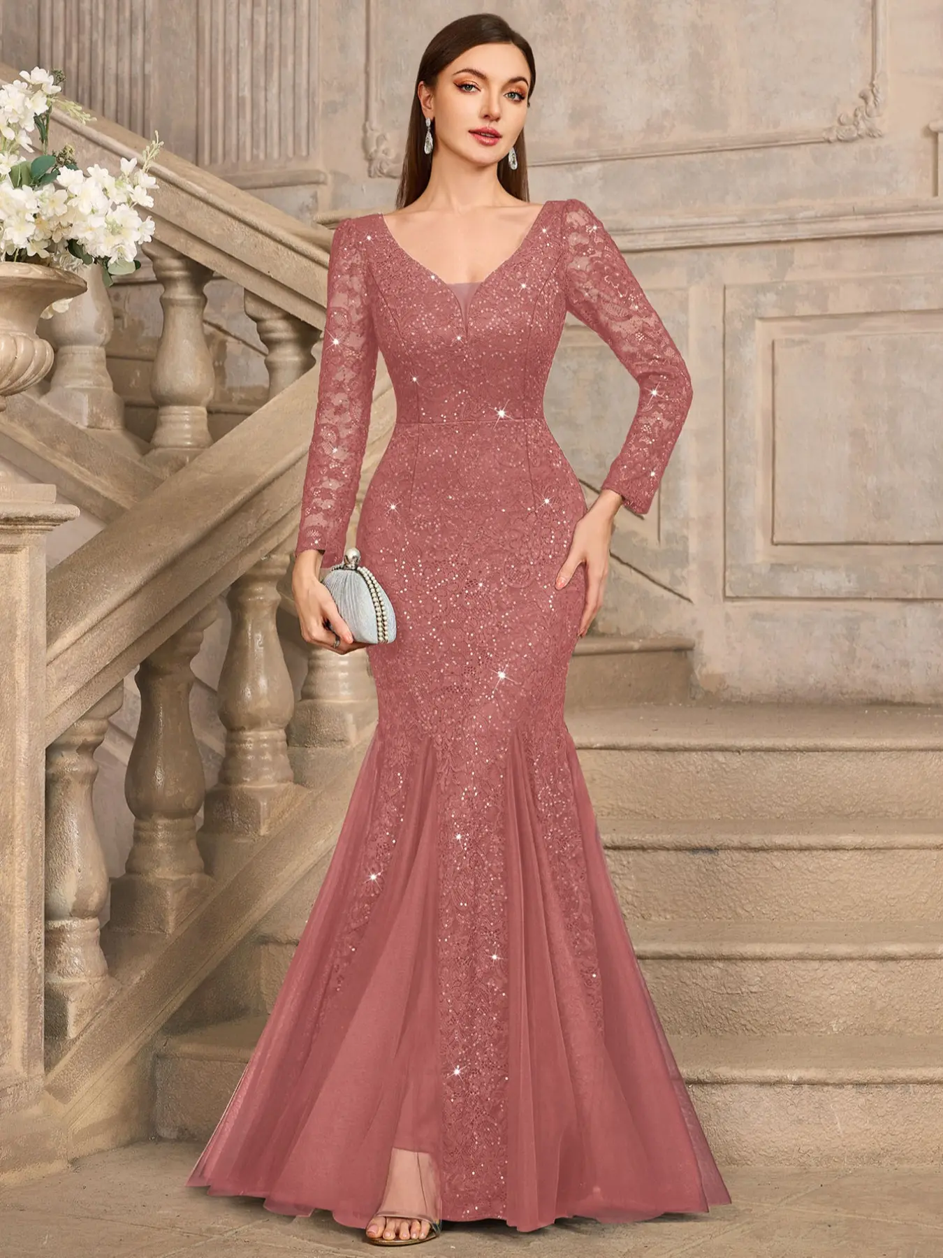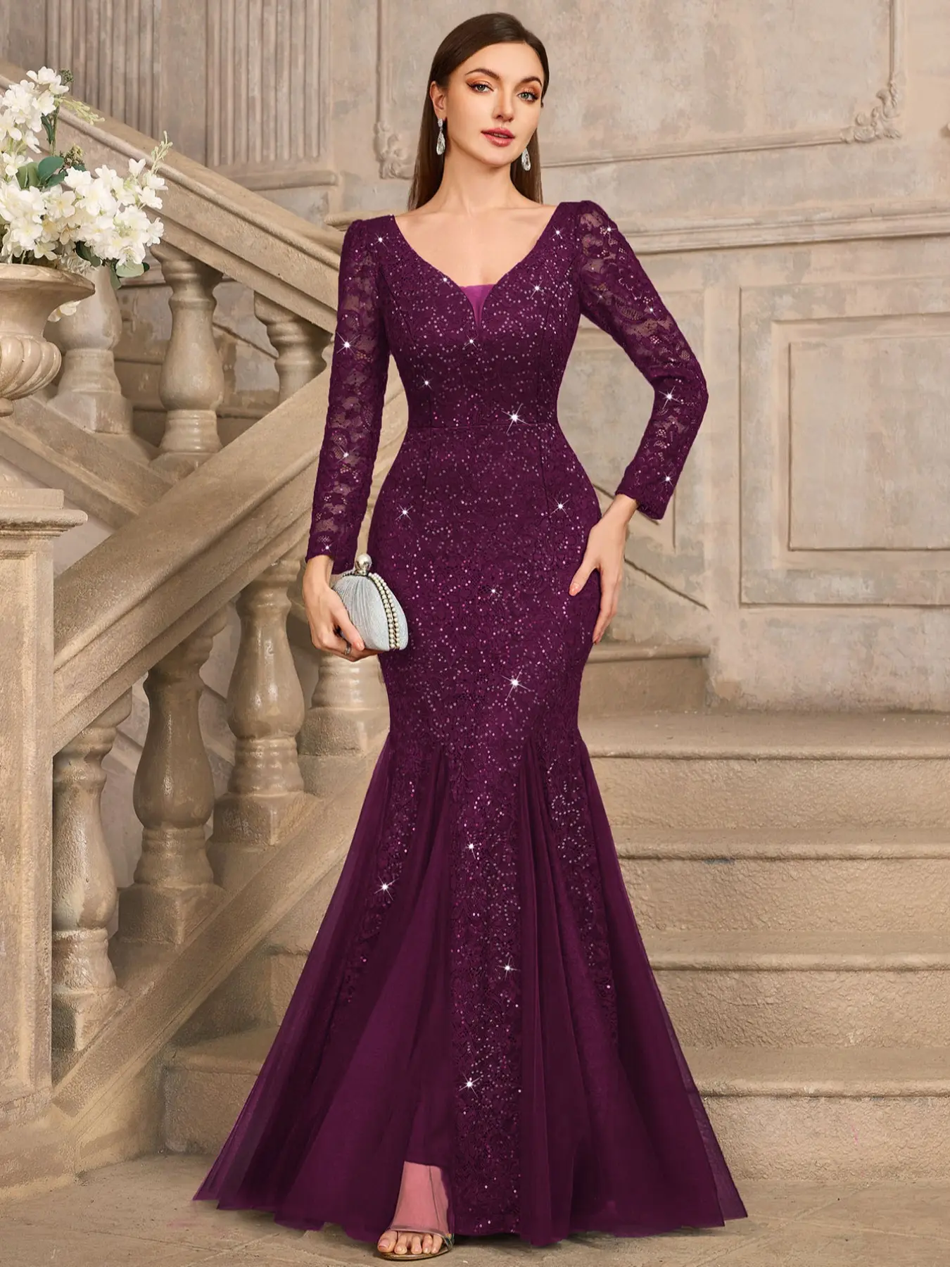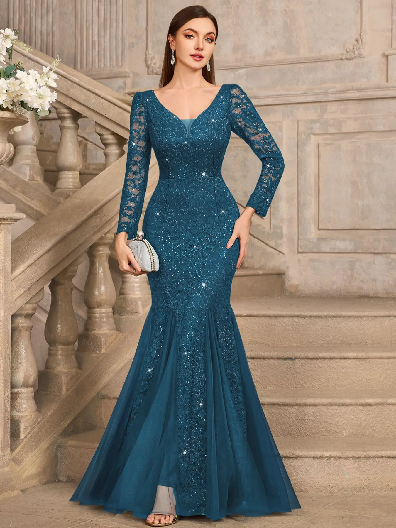 5. MIUSOL 24459A Sequin Floral Lace Deep V-Neck Long Sleeve Mesh Maxi Mermaid Hem Elegant Classy Evening Cocktail Party Dress, Wedding Guest Dress, Formal Dress, Gown