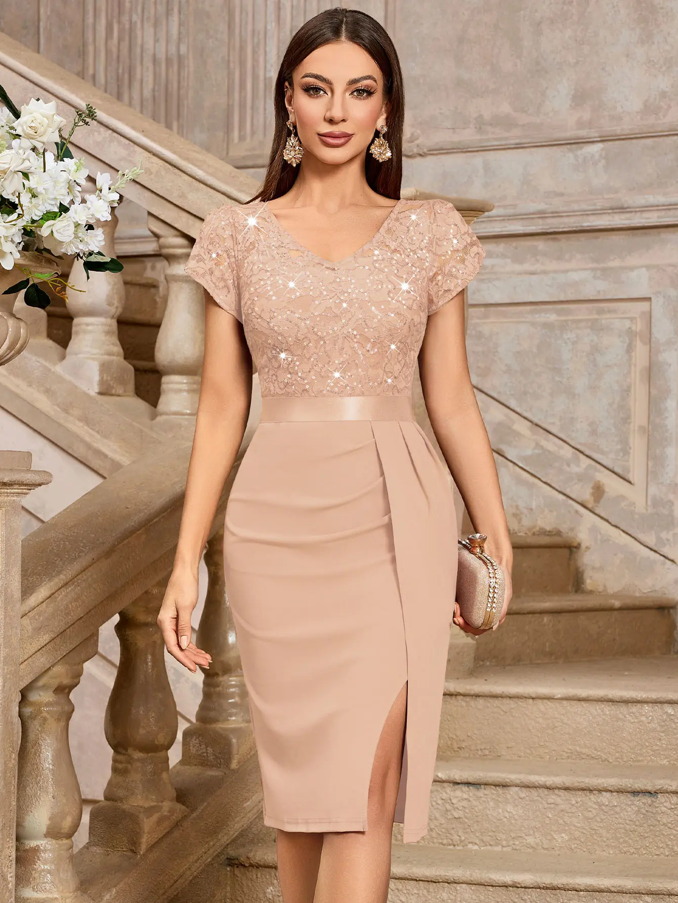 MIUSOL 54347A Women's Sequin Floral Lace V Neck Elegant Ruffle Ruched Style Slim Fit Cocktail Party Chic Womenswear Formal Dress