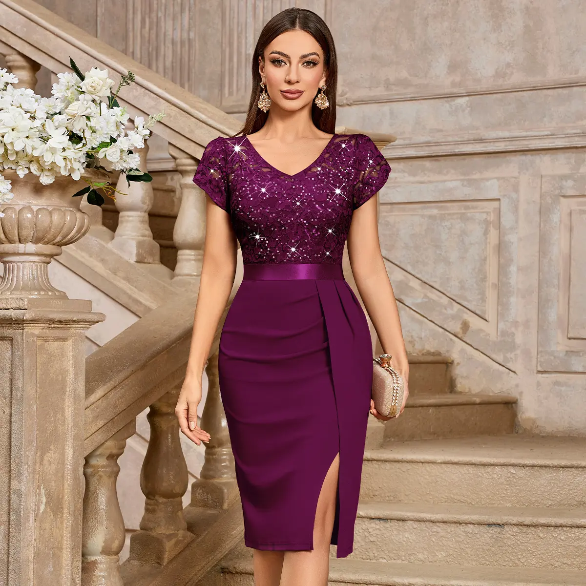 Elevate your style with this elegant dress, perfect for special occasions. The V-neck design with petal sleeve offers a chic look. The delicate lace pattern adds a touch of sophistication. Choose your size based on the recommended chart: US 4/6 (Small), US 8/10 (Medium), US 10/12 (Large), US 14/16 (X-Large), US 16/18 (XX-Large). This slim-fit cut ensures a flattering silhouette.