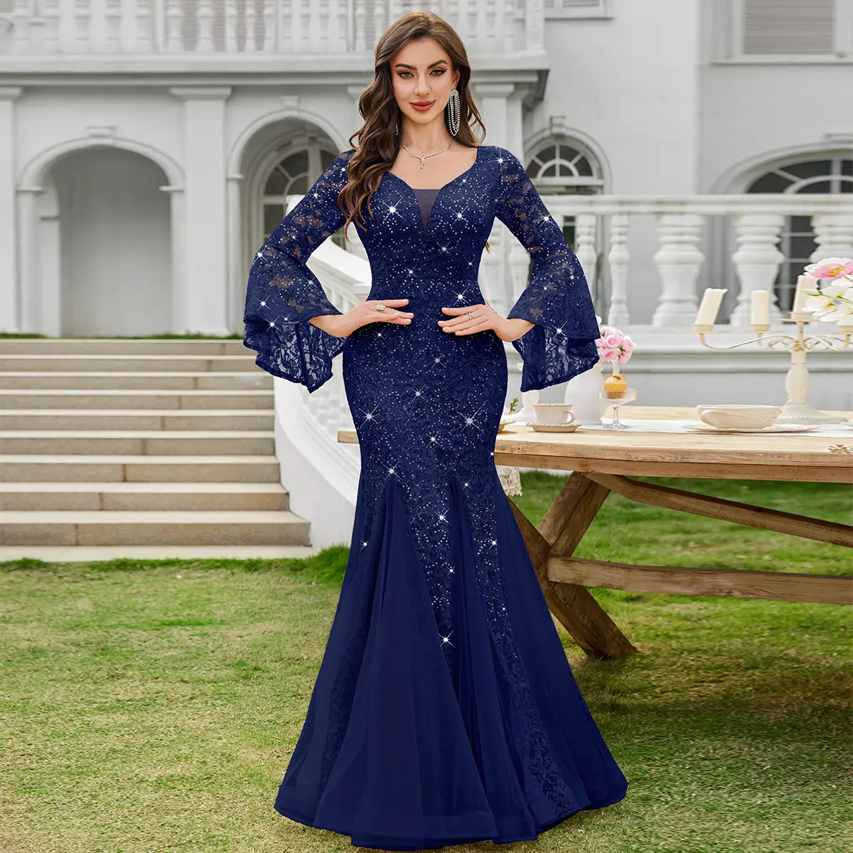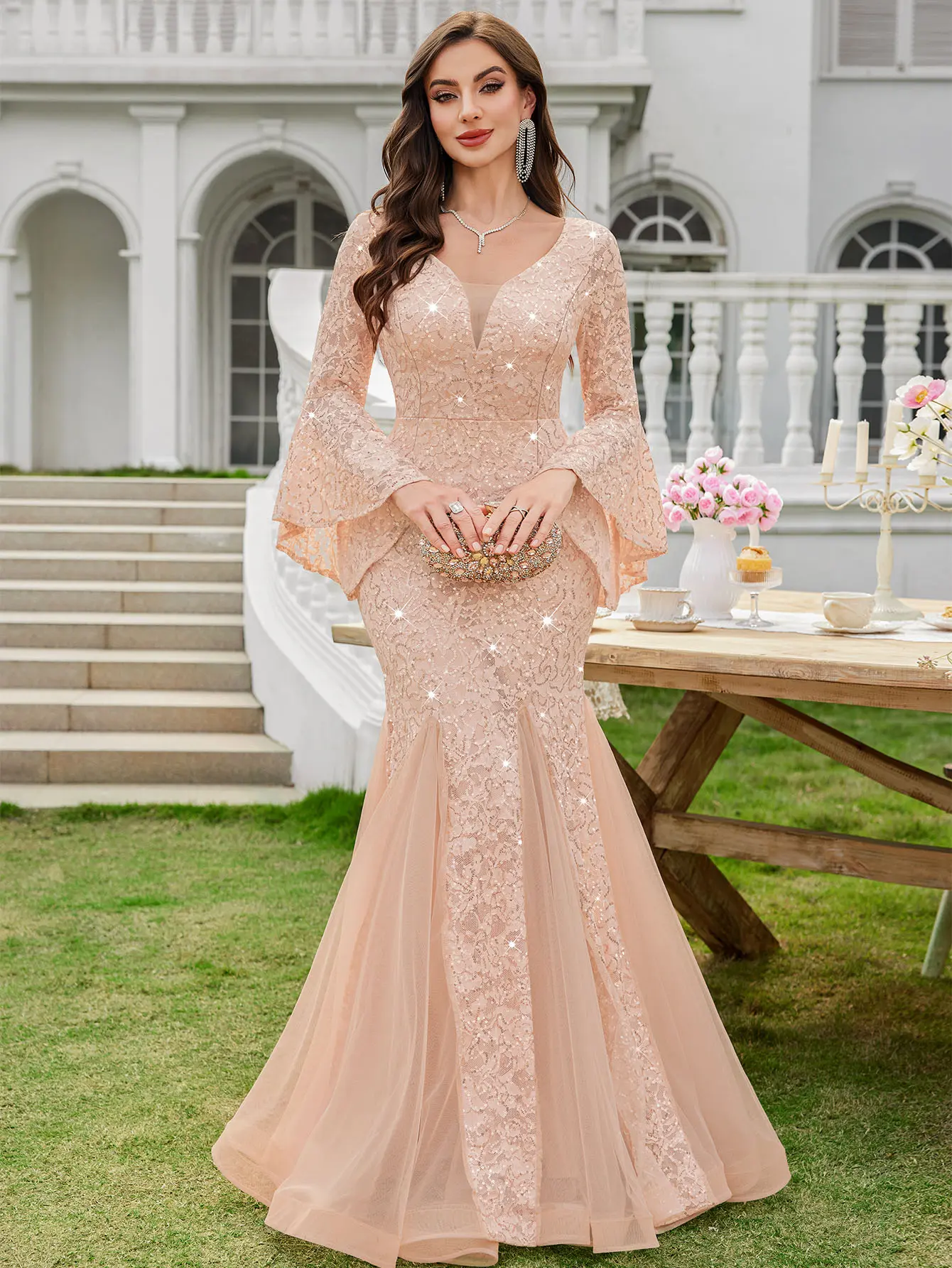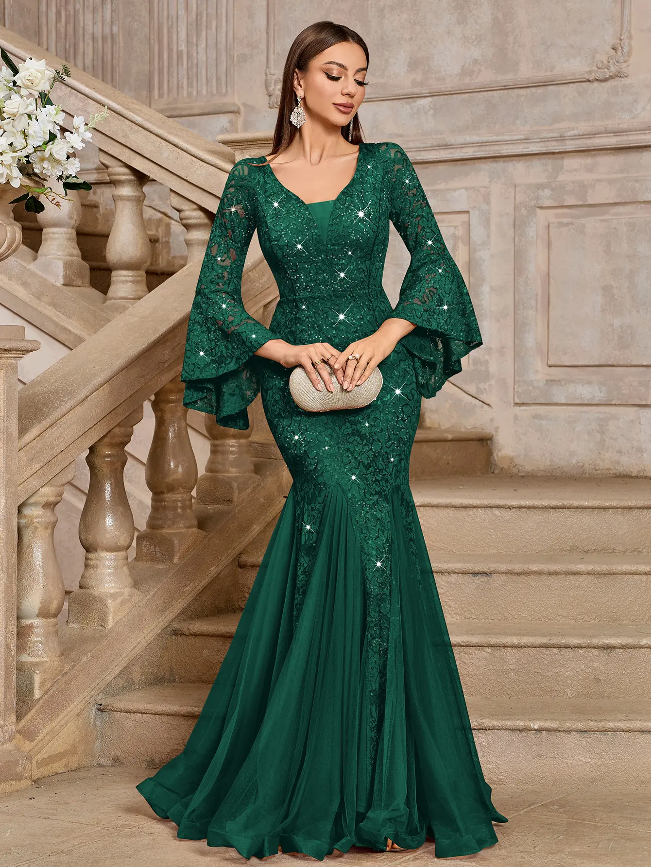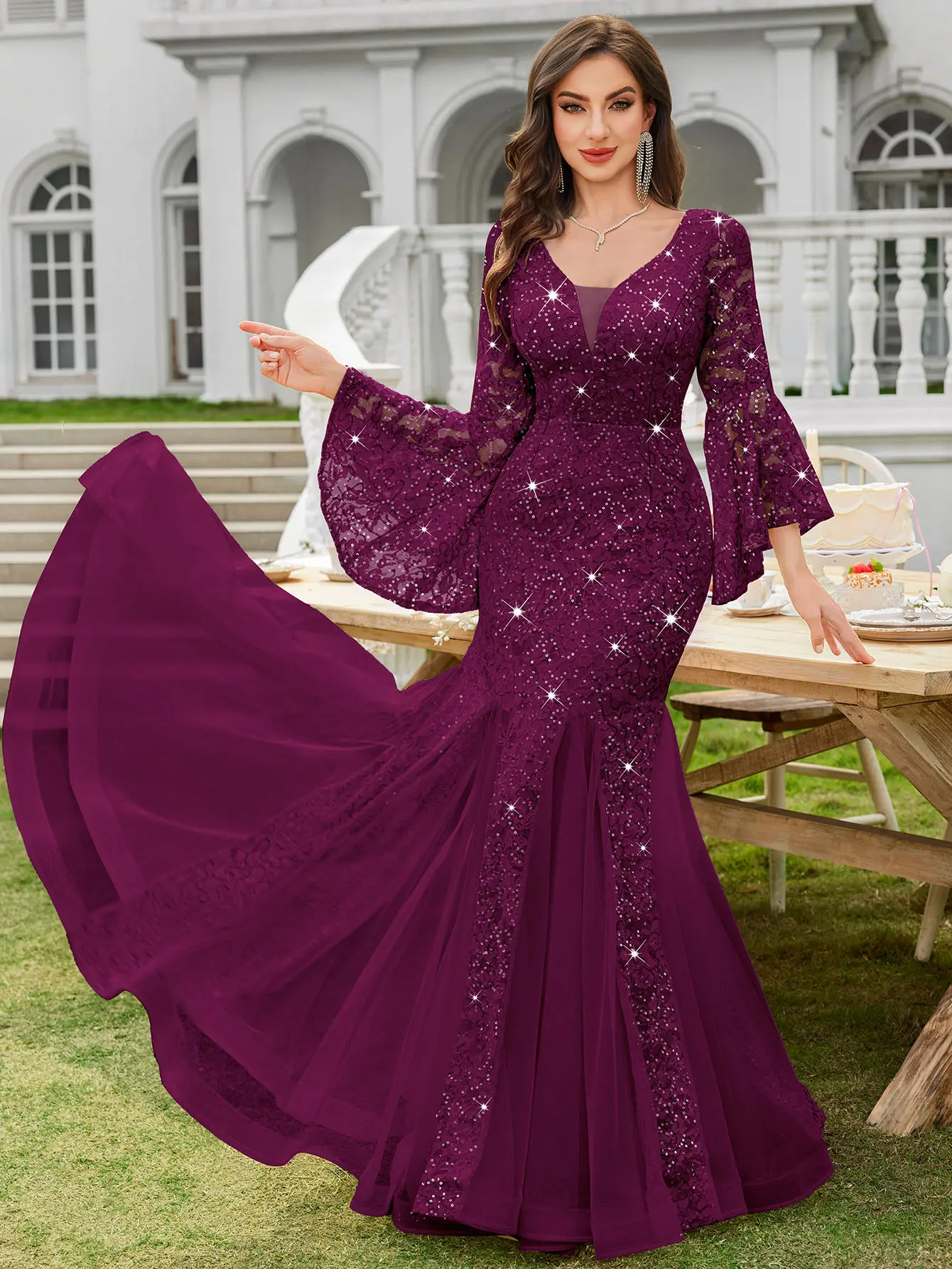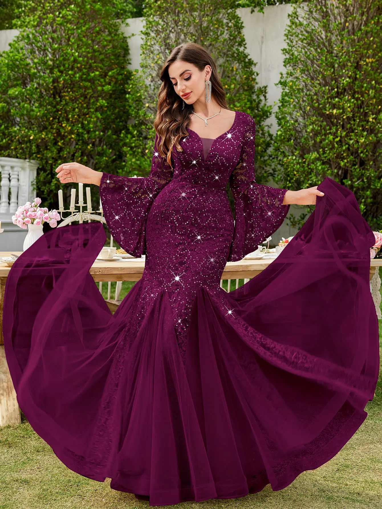 ✨ MIUSOL 24351A Women's Deep V-neck Sequin Lace Mesh Tulle Hem Long Sleeve Formal Evening Maxi Dress ✨