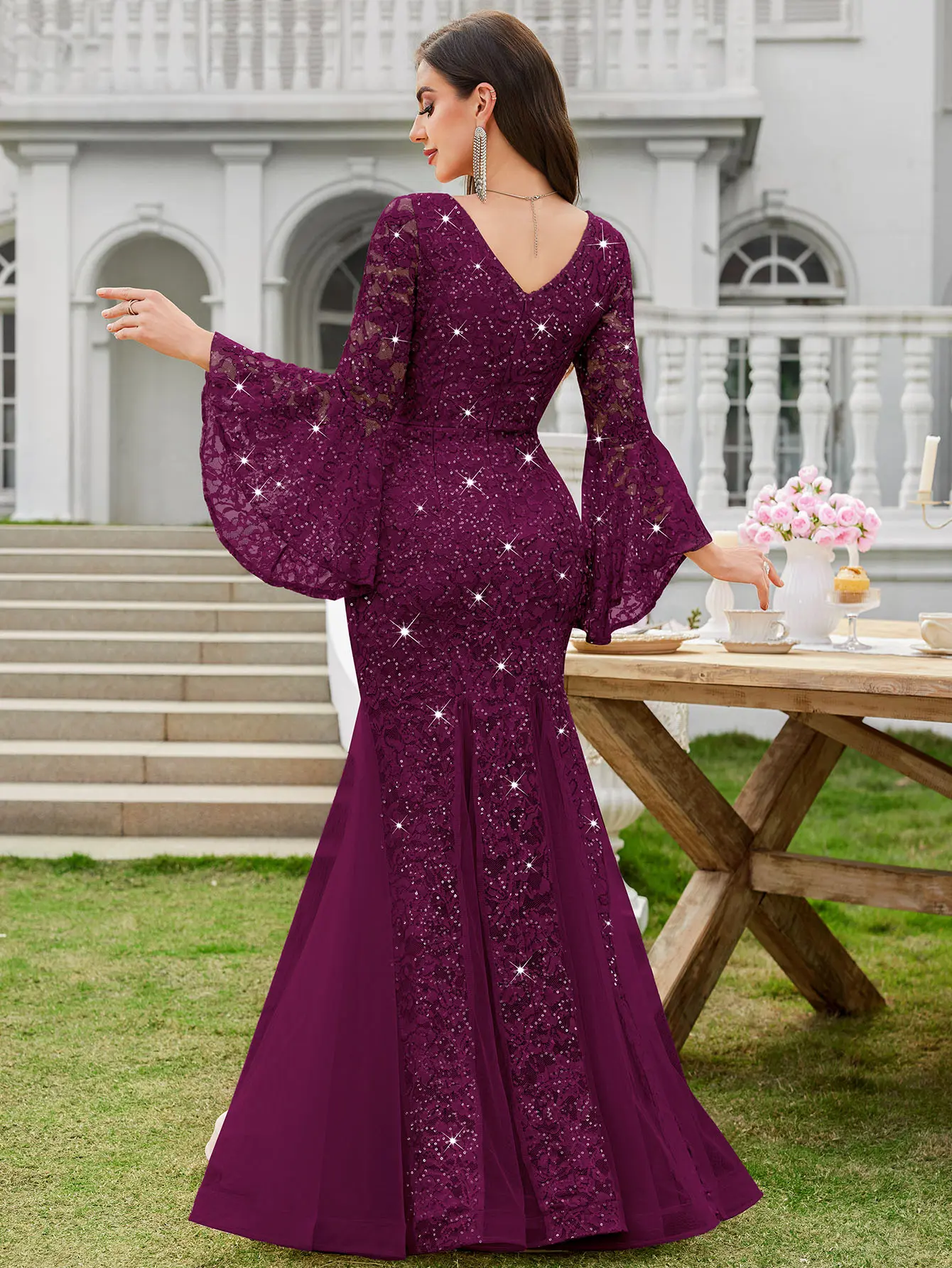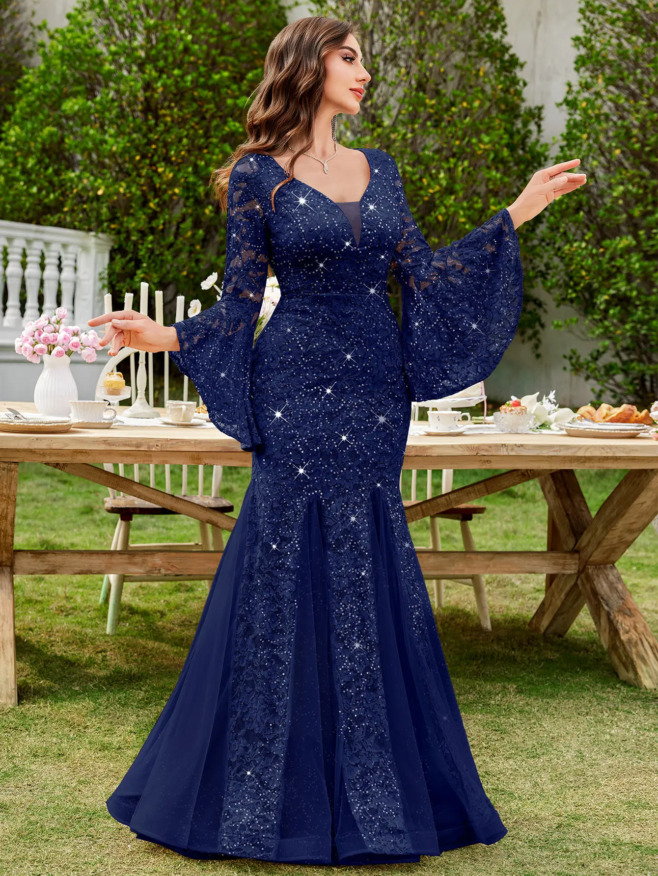 Perfect for cocktail parties, evening proms, and banquets. This dress features a deep V-neckline with sequin see-through lace and flared sleeves. The fit cutting perfectly embraces your shape, while the tulle hem adds allure. Select the perfect fit with size recommendations: US 2/4 (Small), US 4/6 (Medium), US 8/10 (Large), US 12/14 (X-Large), US 16 (XX-Large). Opt for a size up for a looser fit.
