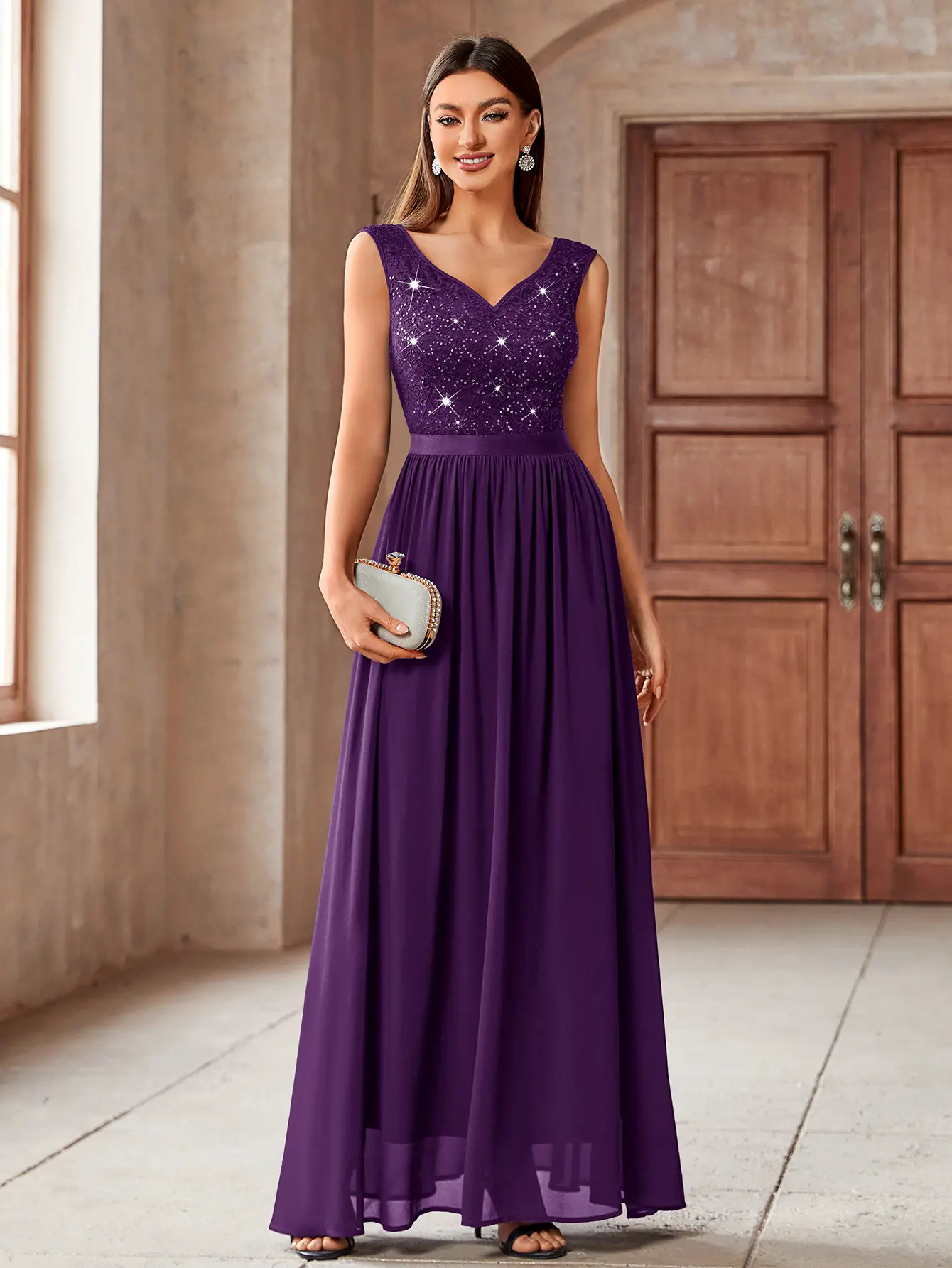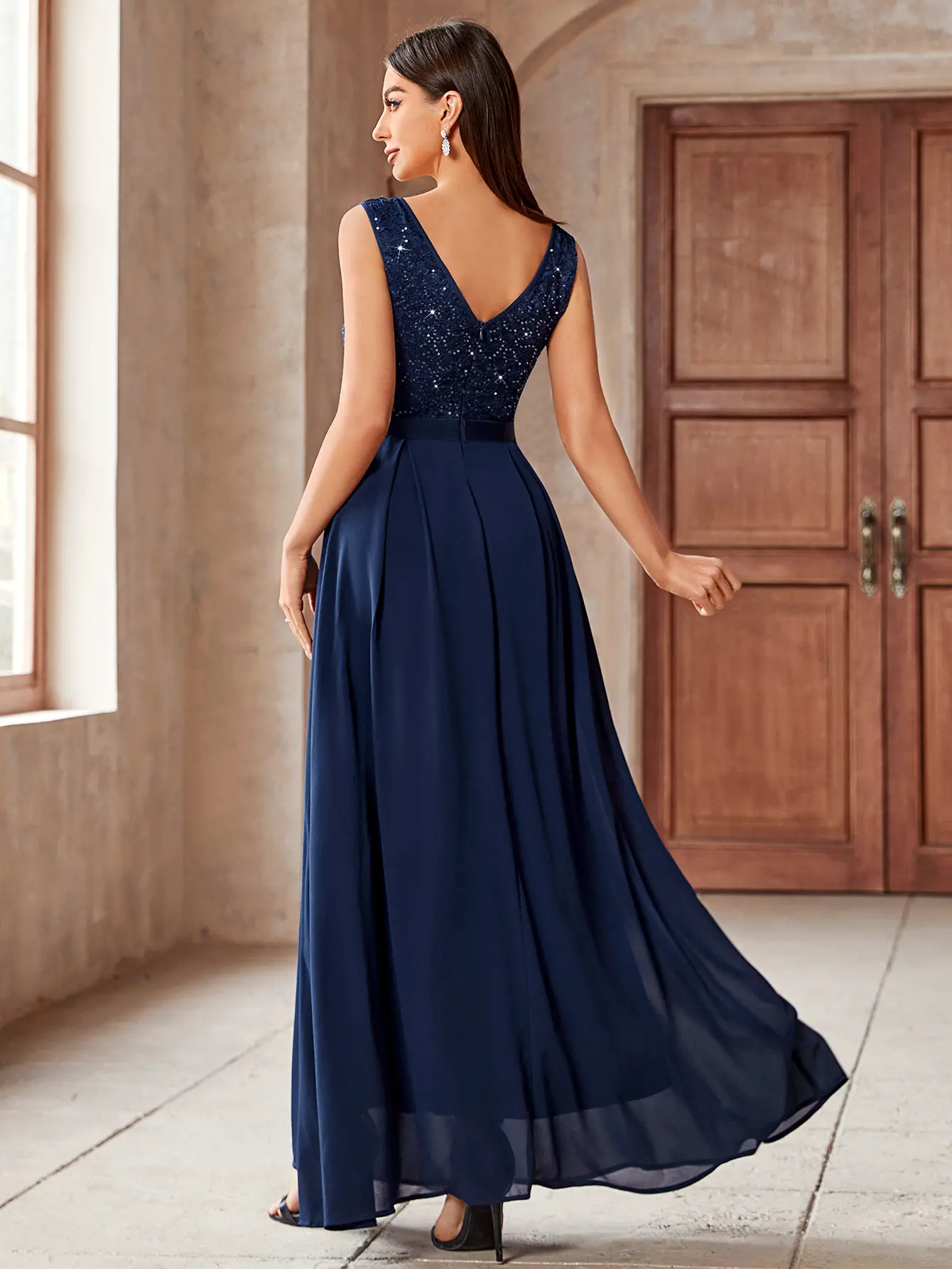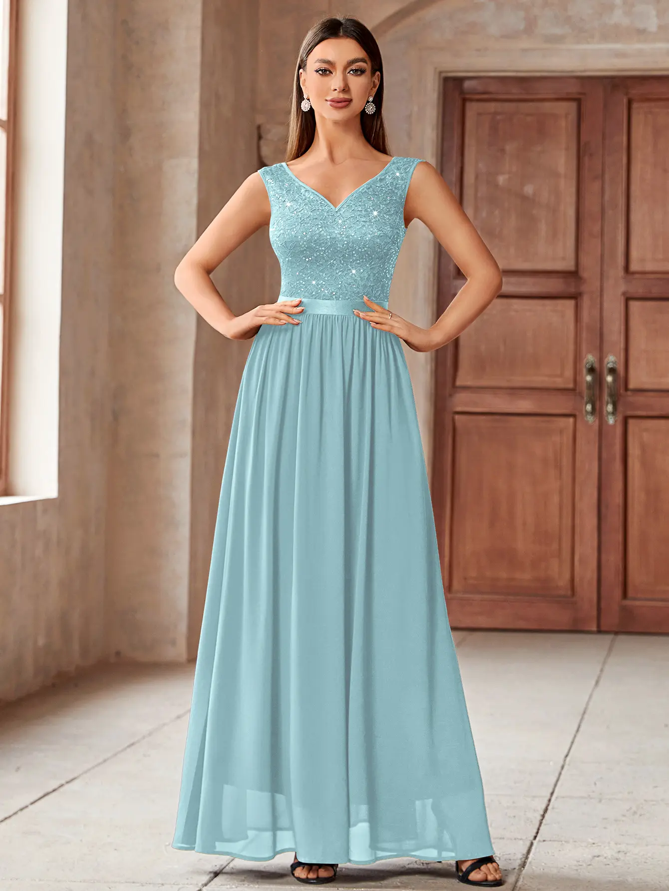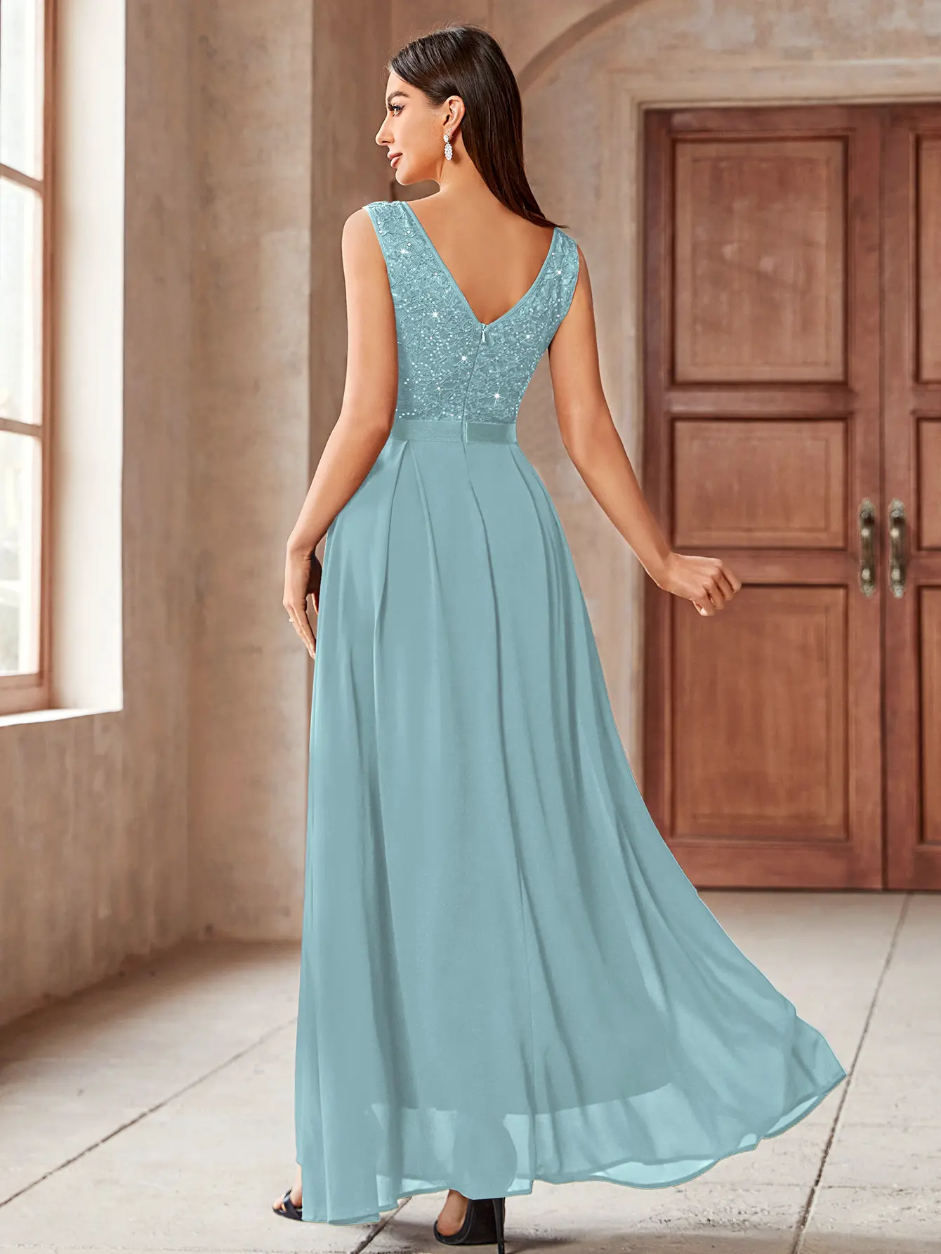 ·Features: Double Deep V-Neck, Sleeveless, Lace Contrast Chiffon, A Line, Maxi Dress, Zipper up Back