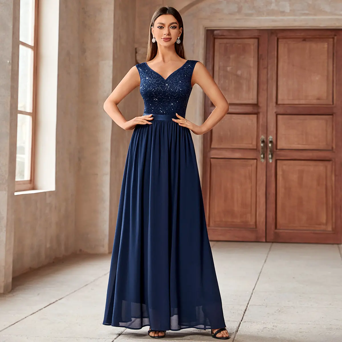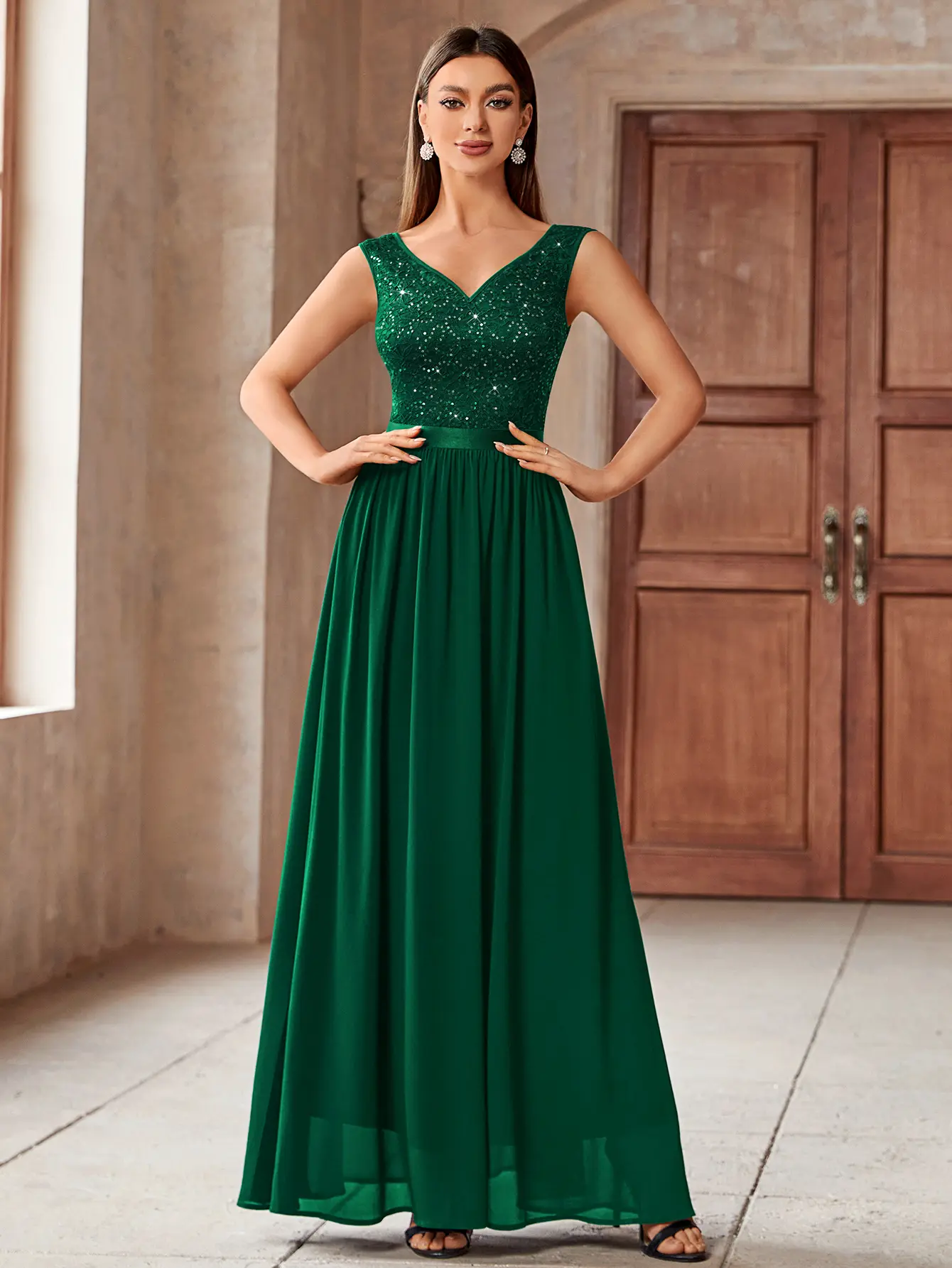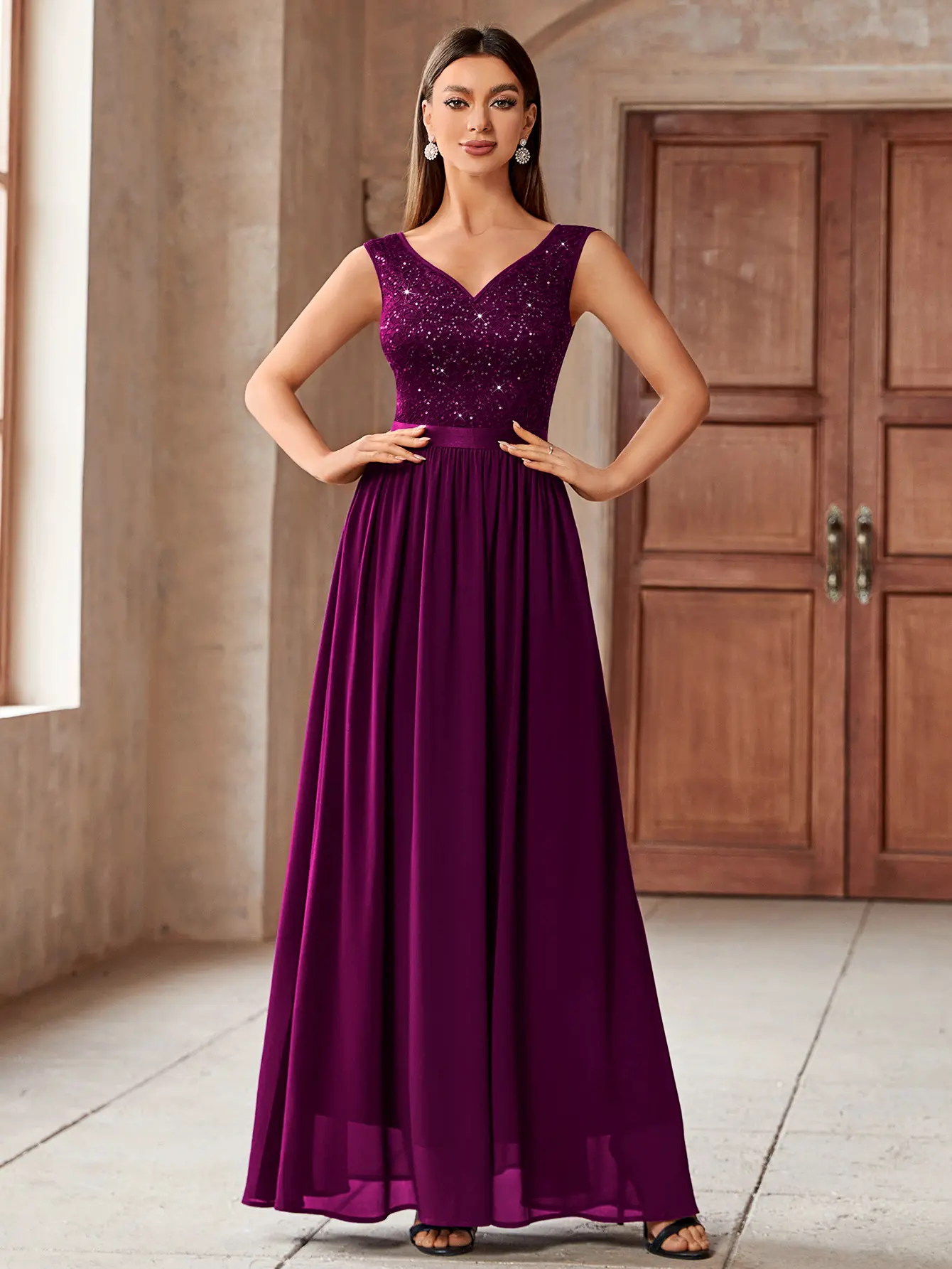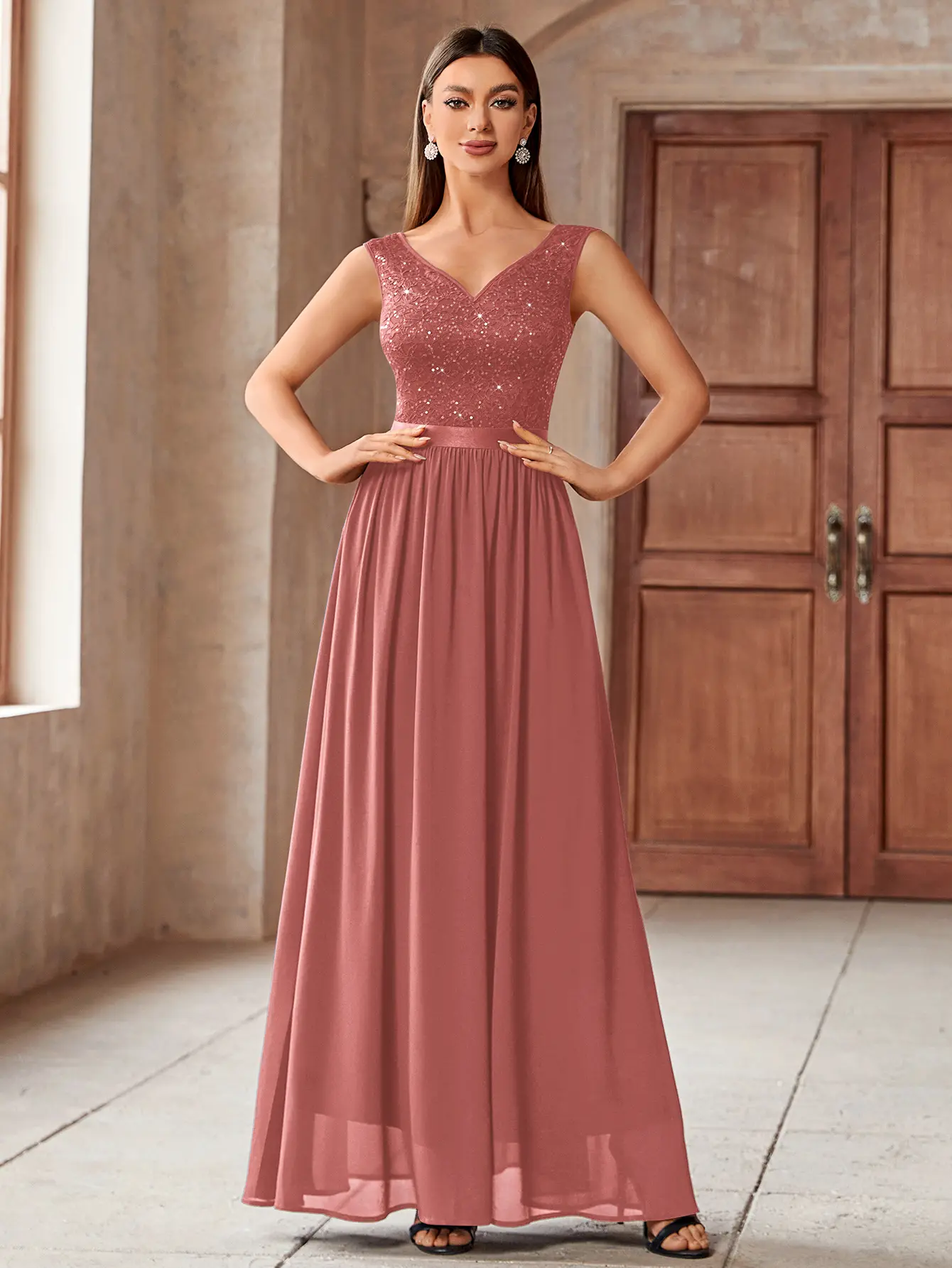 ·Features: Double Deep V-Neck, Sleeveless, Lace Contrast Chiffon, A Line, Maxi Dress, Zipper up Back