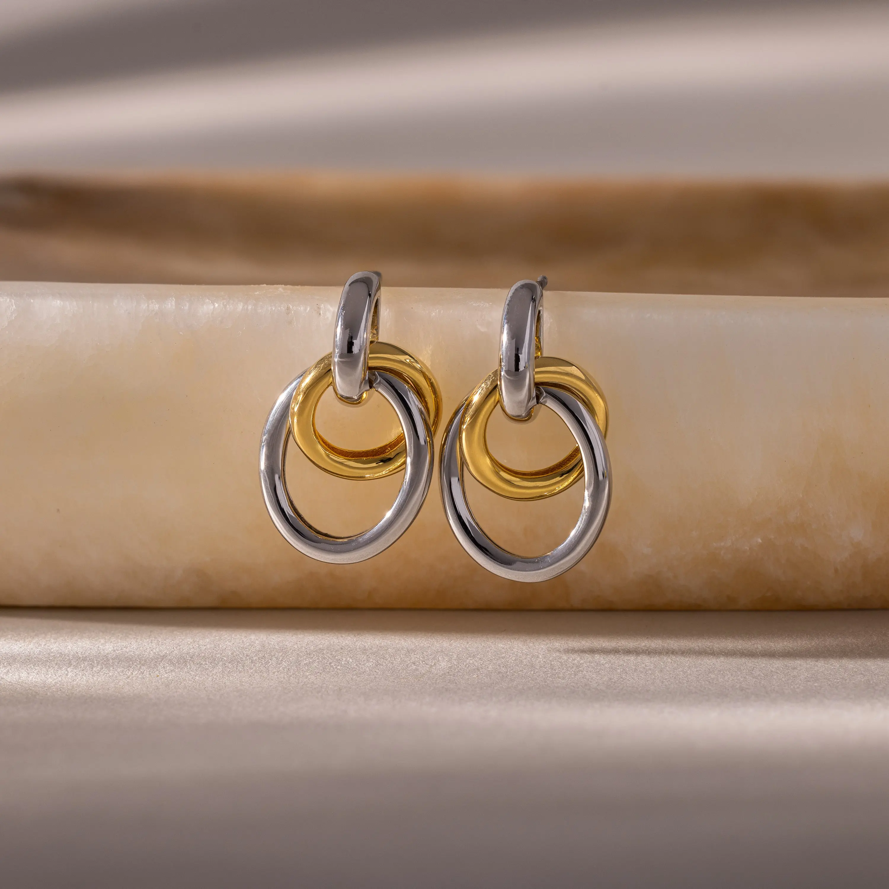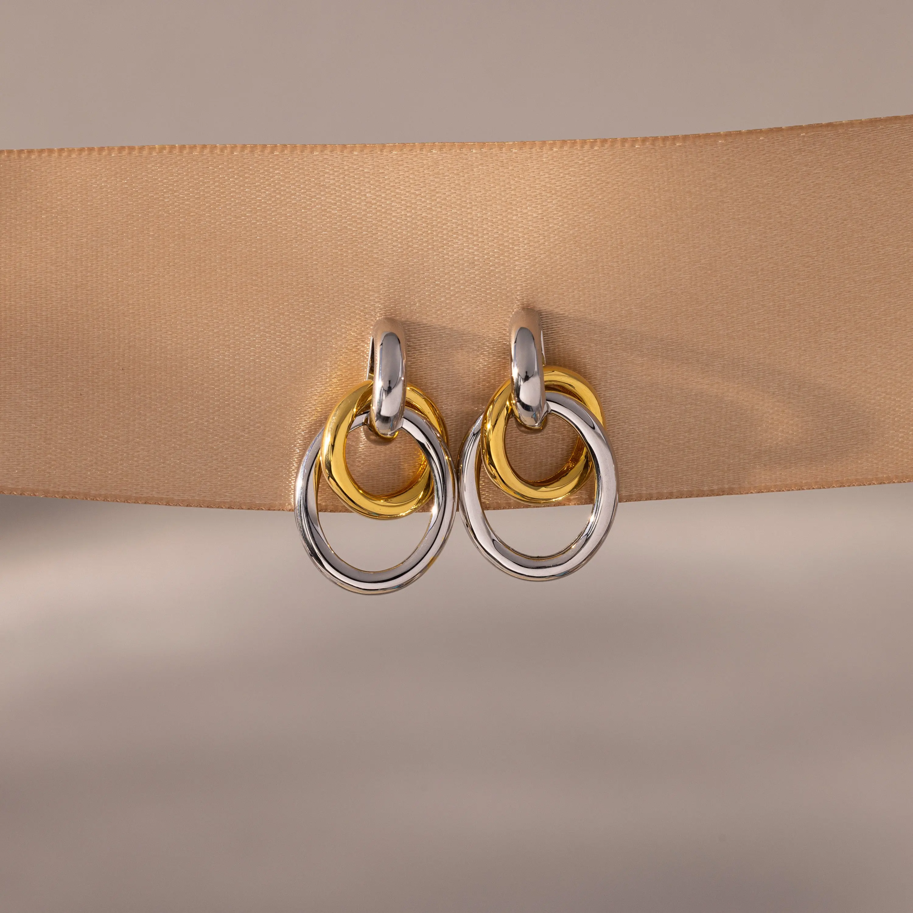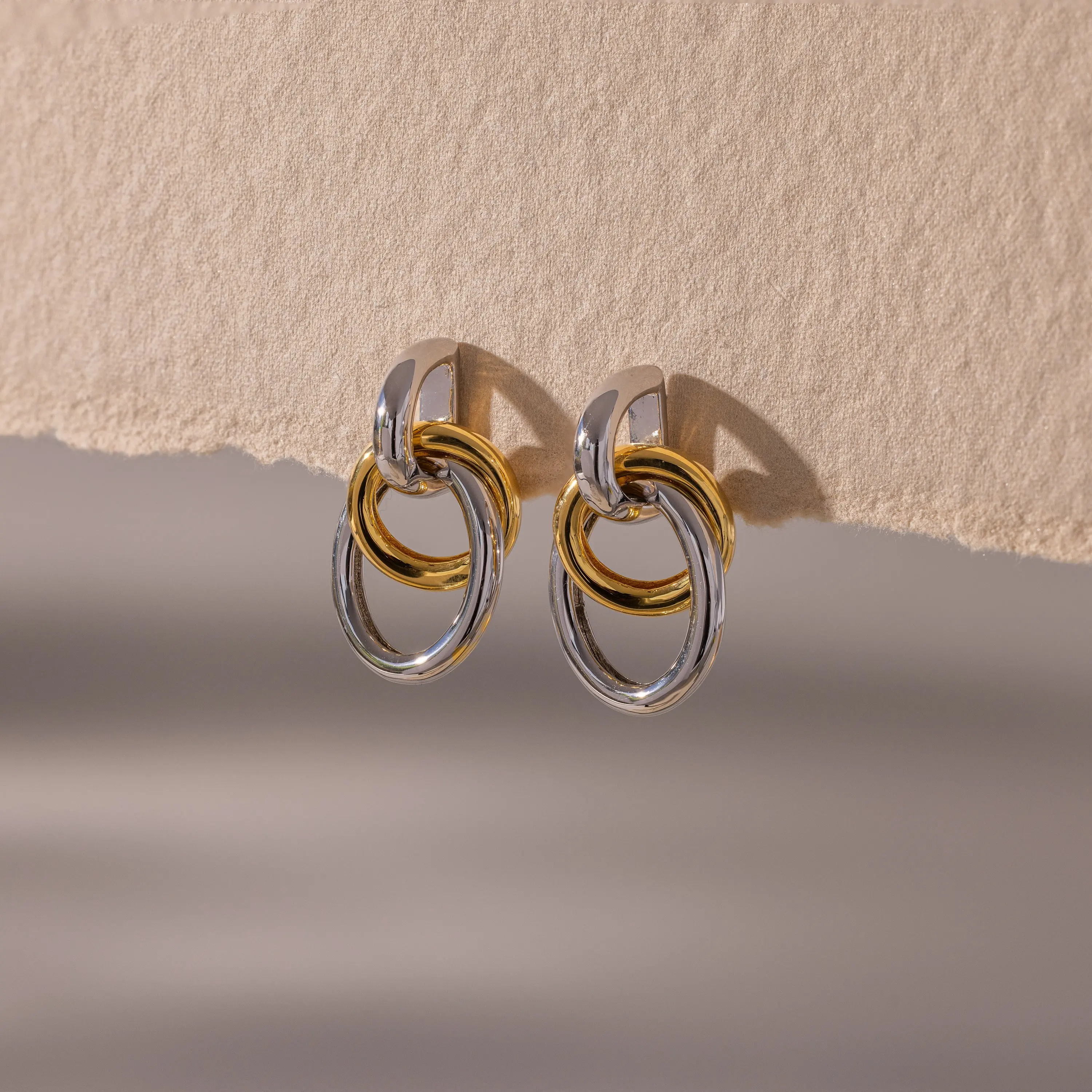 A fusion of form and contrast, our Mixed Metal Linked Earrings pair gold and silver tones in a striking interlocking design. Their sculptural silhouette makes a refined yet powerful statement, perfect for those who love bold, contemporary design.
