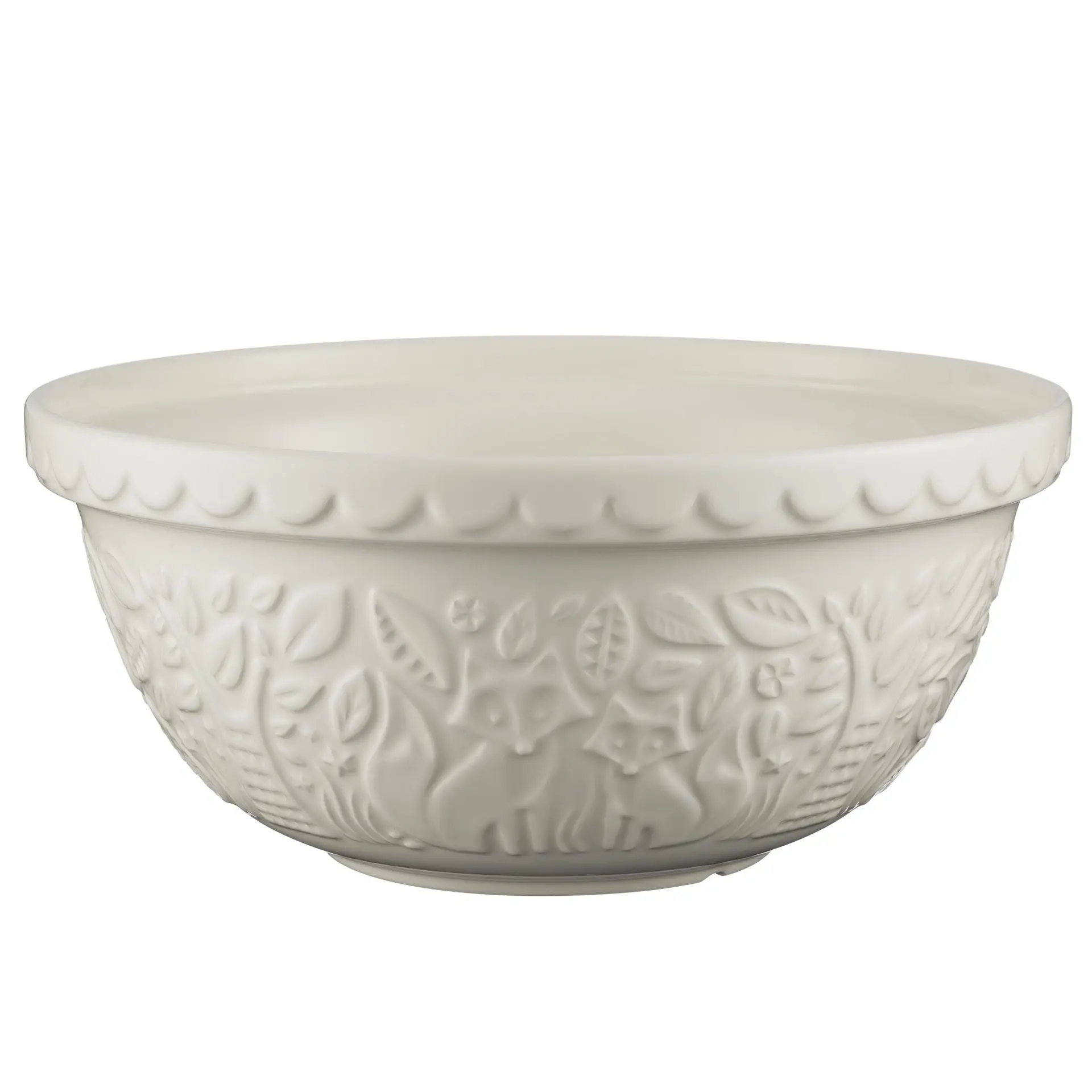 Whip up the perfect batch of cookies, pancakes, and more with the Mason Cash In The Forest Mixing Bowl. Made of durable, chip-resistant earthenware, this wide mixing bowl is perfect for children and adults alike. Designed as part of the In The Forest Collection, this cream-colored bowl features embossed foxes, trees, and leaves. Don't want to spend ages cleaning your mixing bowl? This 4.25-Quart mixing bowl is dishwasher-safe and microwave-safe for quick heating-up of ingredients. No matter what you want to bake, this earthenware bowl is a must-have for your kitchen. Add some whimsy to your baking equipment with the Fox Embossed Mixing Bowl from the Mason Cash In The Forest Collection.