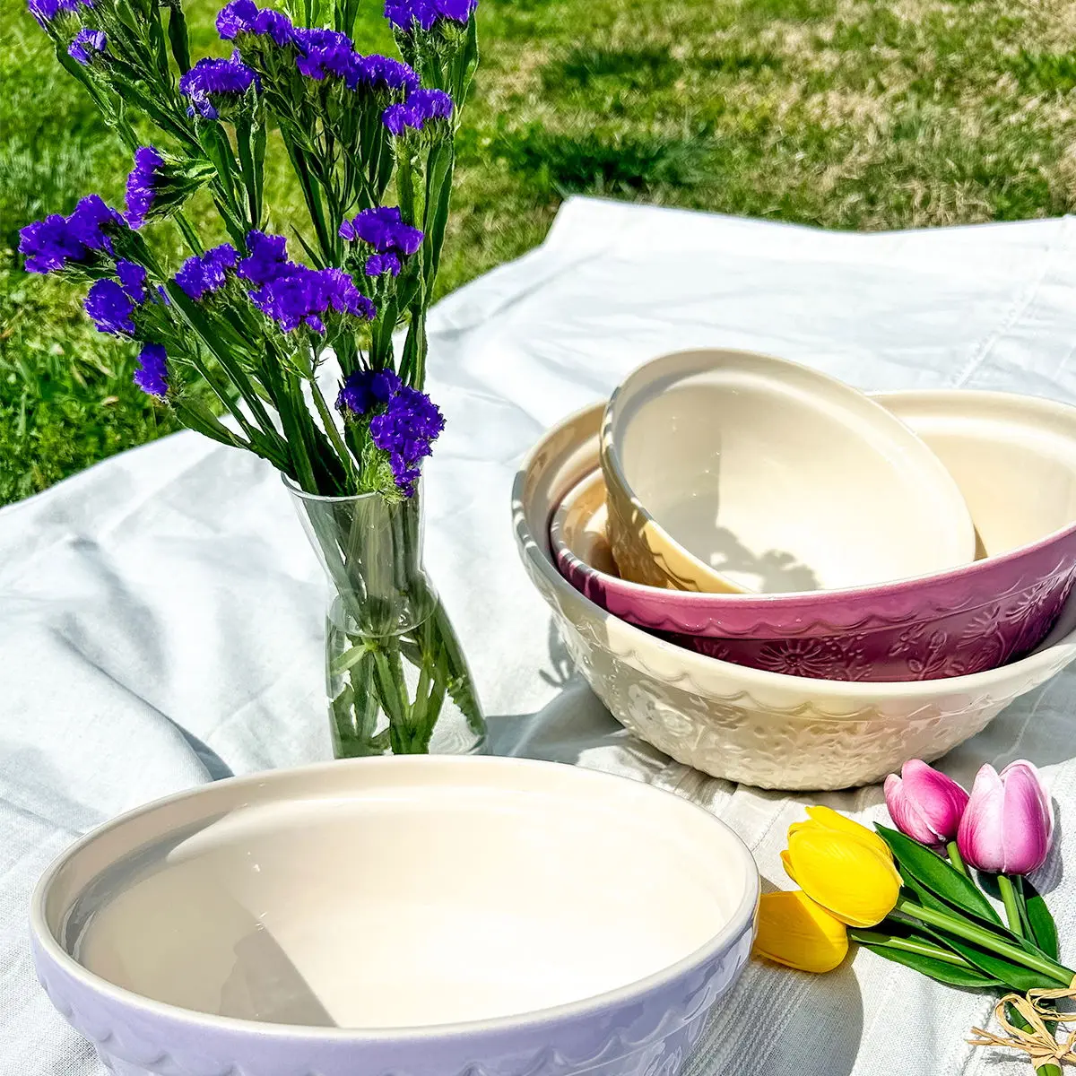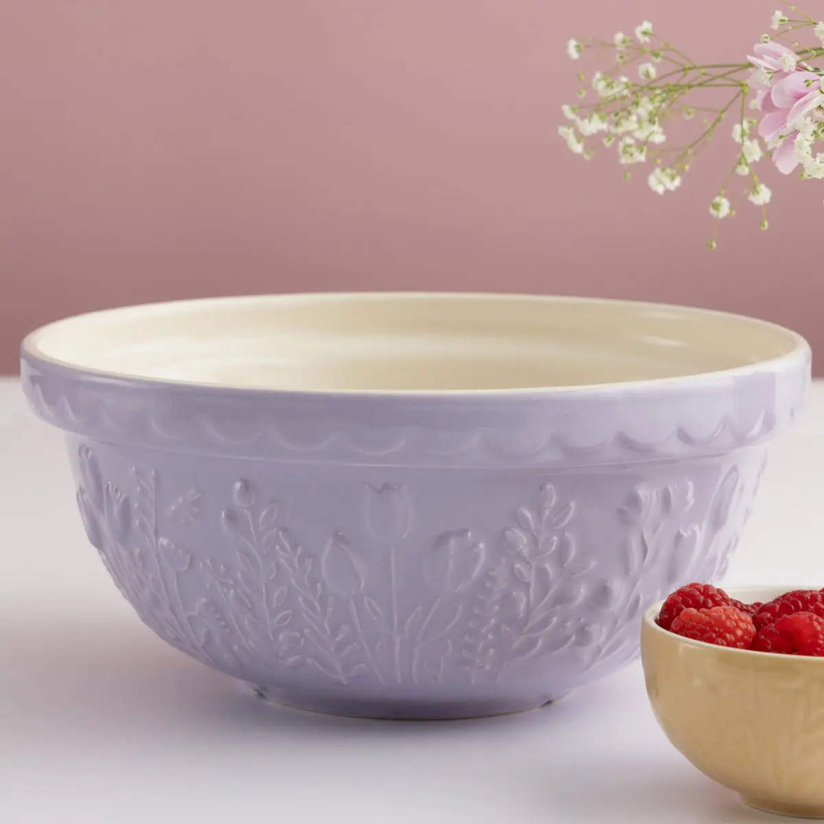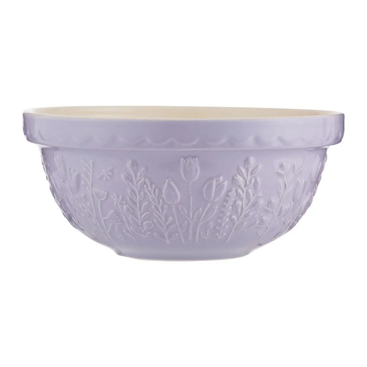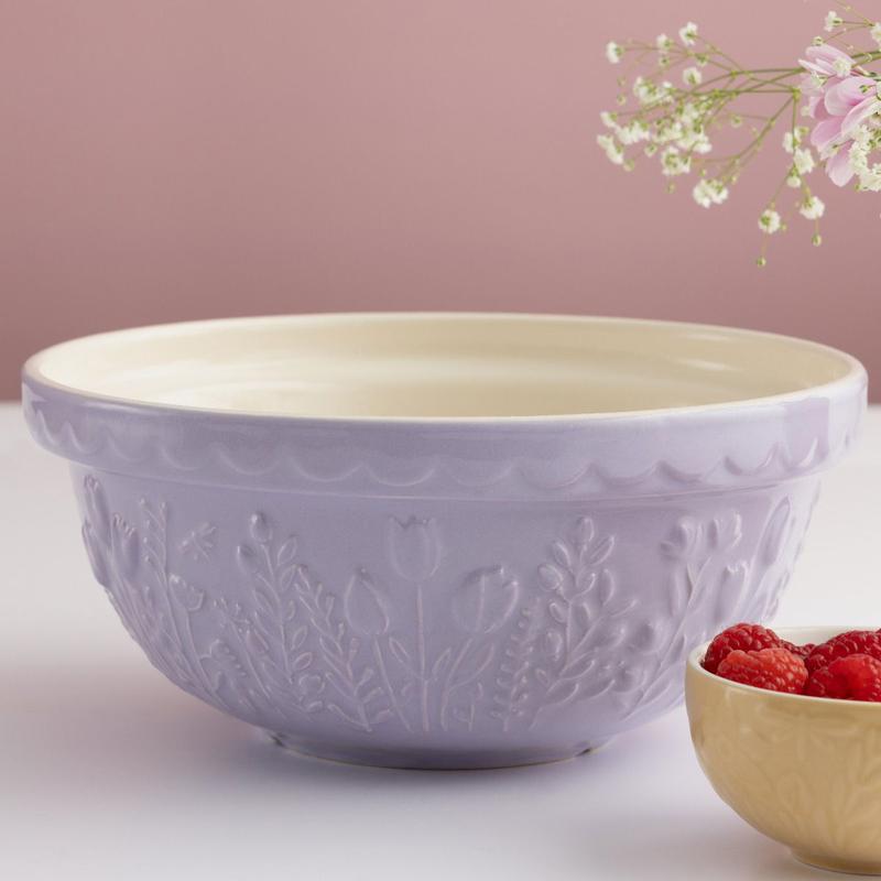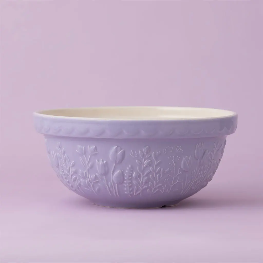 Bring the effortless charm of lush countryside fields indoors with the Mason Cash In The Meadow Collection S24 Mixing Bowl in Tulip. Made with Mason Cash's time-honored stoneware that is resistant to chipping and cracking, this mixing bowl will be a durably elegant addition to your everyday baking preparation. With a 2.15 Quart capacity, the S24 mixing bowl is ideal for preparing single batches of dough or batter or for serving side dishes. The light lavender purple coloring is highlighted with an embossed Tulip design that lines the bowl's perimeter, while the classic scalloped rim offers maximum grip - making for a practical, elegant piece that will let mixing tasks go smoother. Allow your baking tasks to bloom with style and order the Mason Cash In The Meadow Mixing Bowl today!