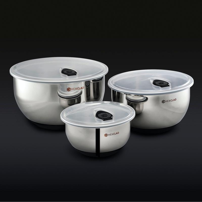 Our set of bowls feature vacuum seal lids, but that’s only half the culinary prowess they possess. They have a variety of uses, and thanks to the nesting mixing bowl design, they can help take up less space on your countertop.