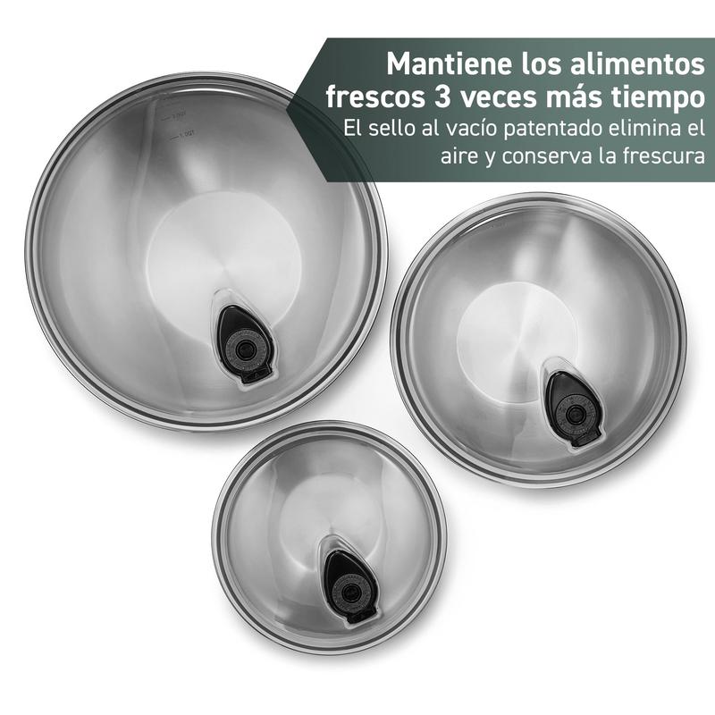 Our signature mixing bowl set gives you an edge in food prep and storage. A much-needed upgrade of a kitchen essential, our stainless steel bowls feature a non-slip silicone base, so they stay put while you’re mixing, blending, and beating—even at an angle. Each bowl comes with a patented vacuum-seal lid so you can go right from the counter to the fridge and keep your food fresh up to 3x longer. The lids also feature a date-saving dial that takes the guesswork out of storing leftovers and marinades. These sturdy, easy-to-handle bowls nest for clutter-free storage and are dishwasher safe.