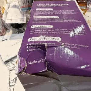 Very very bad packaging for shipping. You cannot blame the shipping company when you put my metal bowels into a plastic bag to be shipped. These bowls were in a manufacture box, not shipping box. These are suppose to be Christmas presents. Boxes are crushed and ripped, very disappointed.