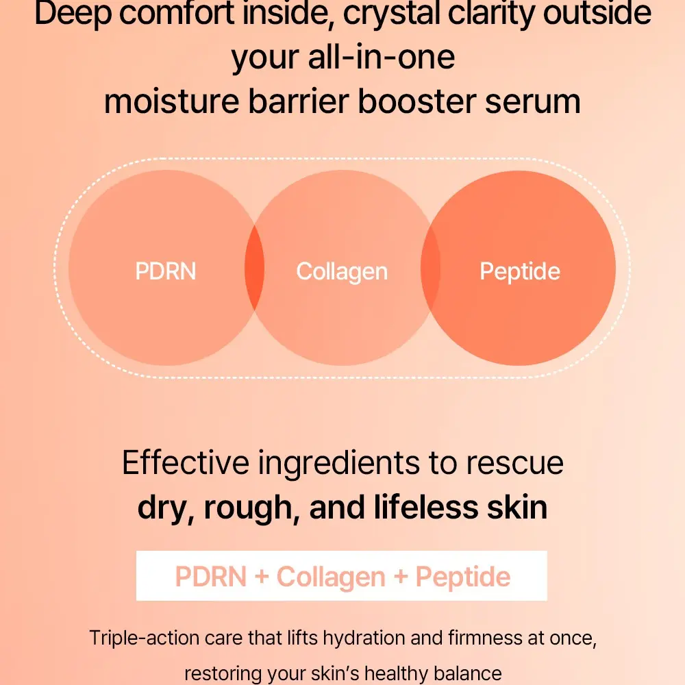 A gentle, moisture-rich serum featuring PDRN, collagen, and peptides, designed to support a smoother and more hydrated-looking complexion.