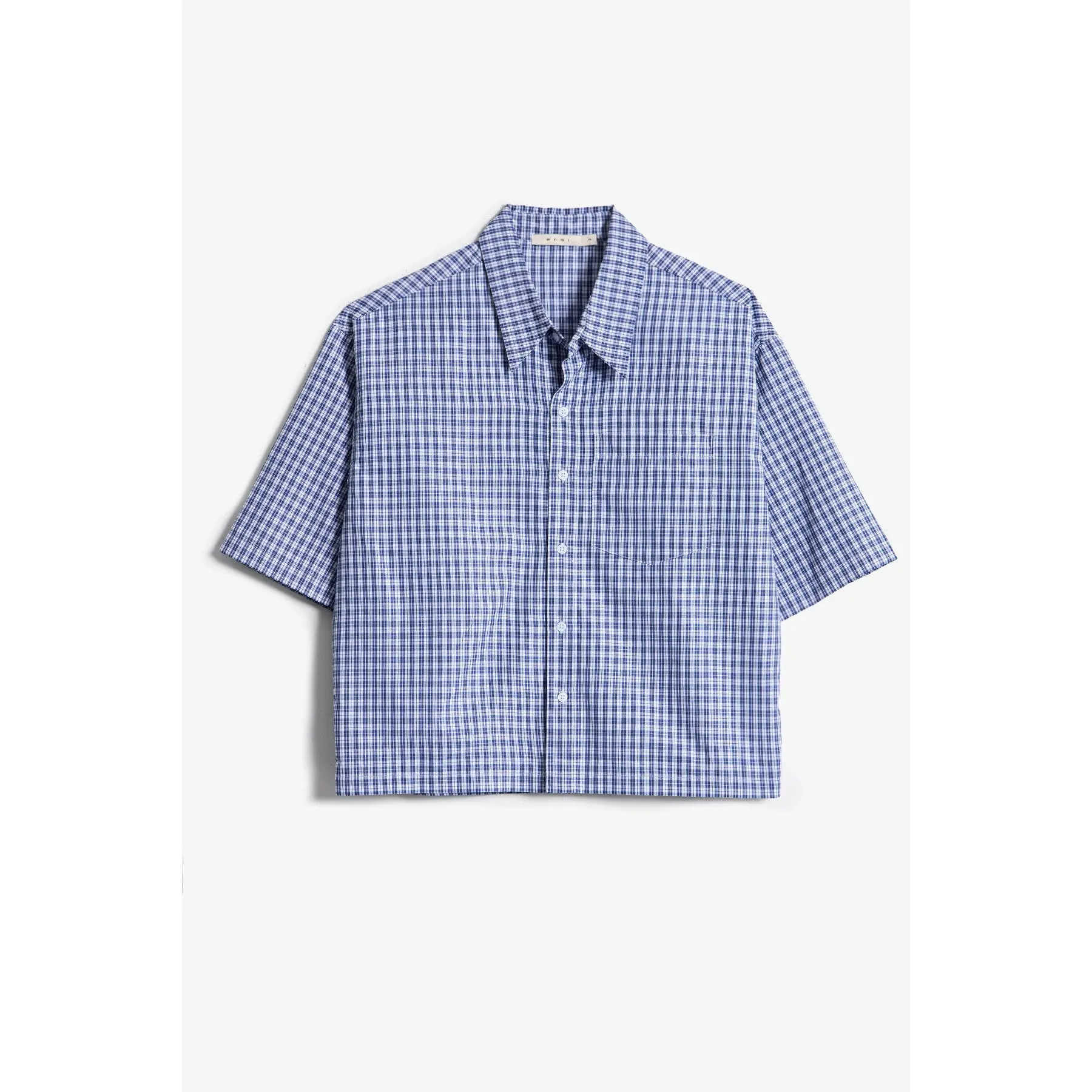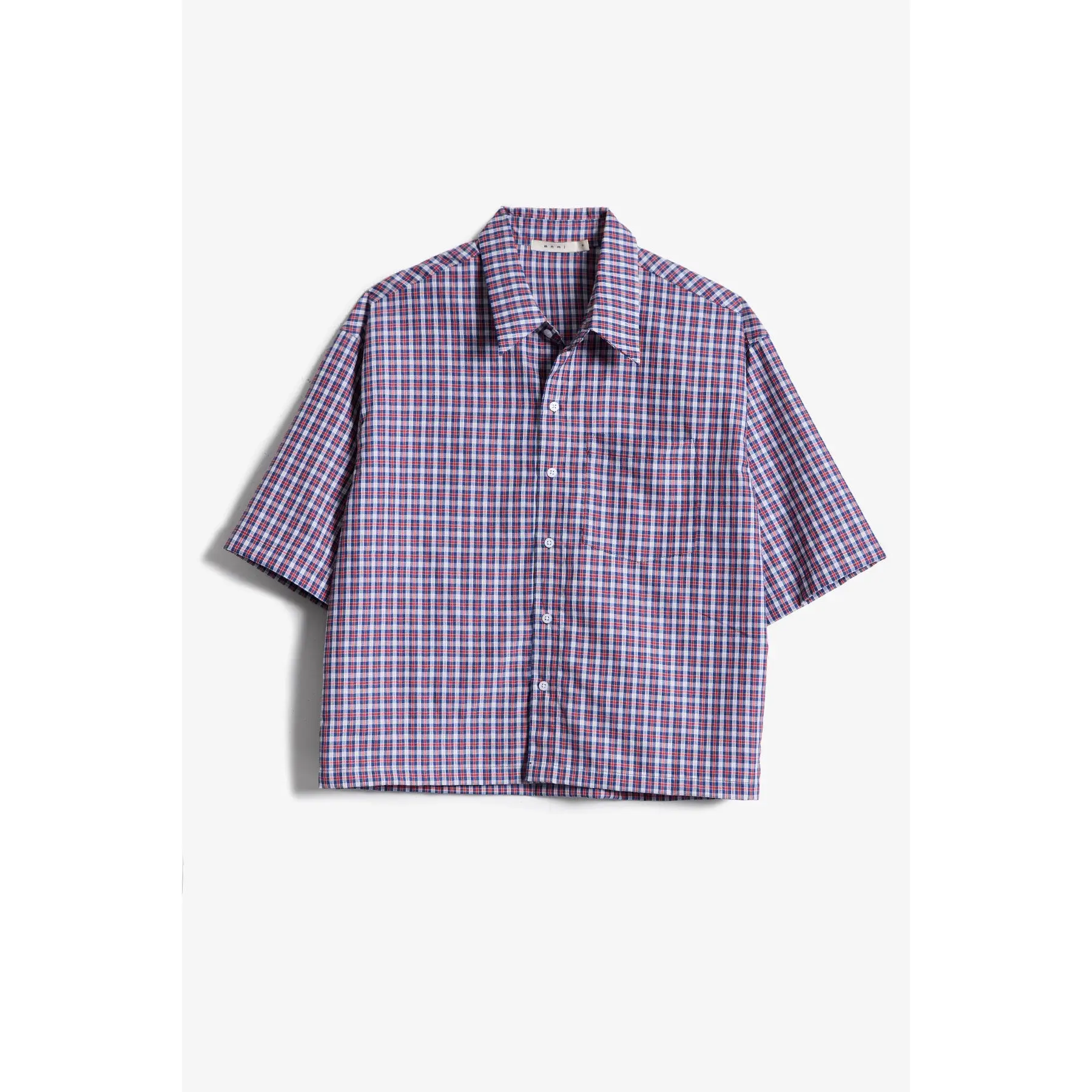 Constructed from a crisp cotton-blend poplin, this cropped overshirt features a boxy silhouette and short, wide sleeves. Designed with a classic spread collar, front button closure, and a single patch pocket at the chest. Finished with a straight hem.