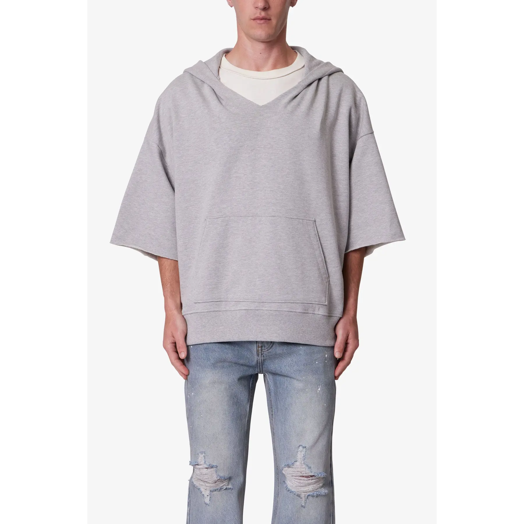 5. mnml Hooded 3/4 Sleeve Rag Sweater - Grey