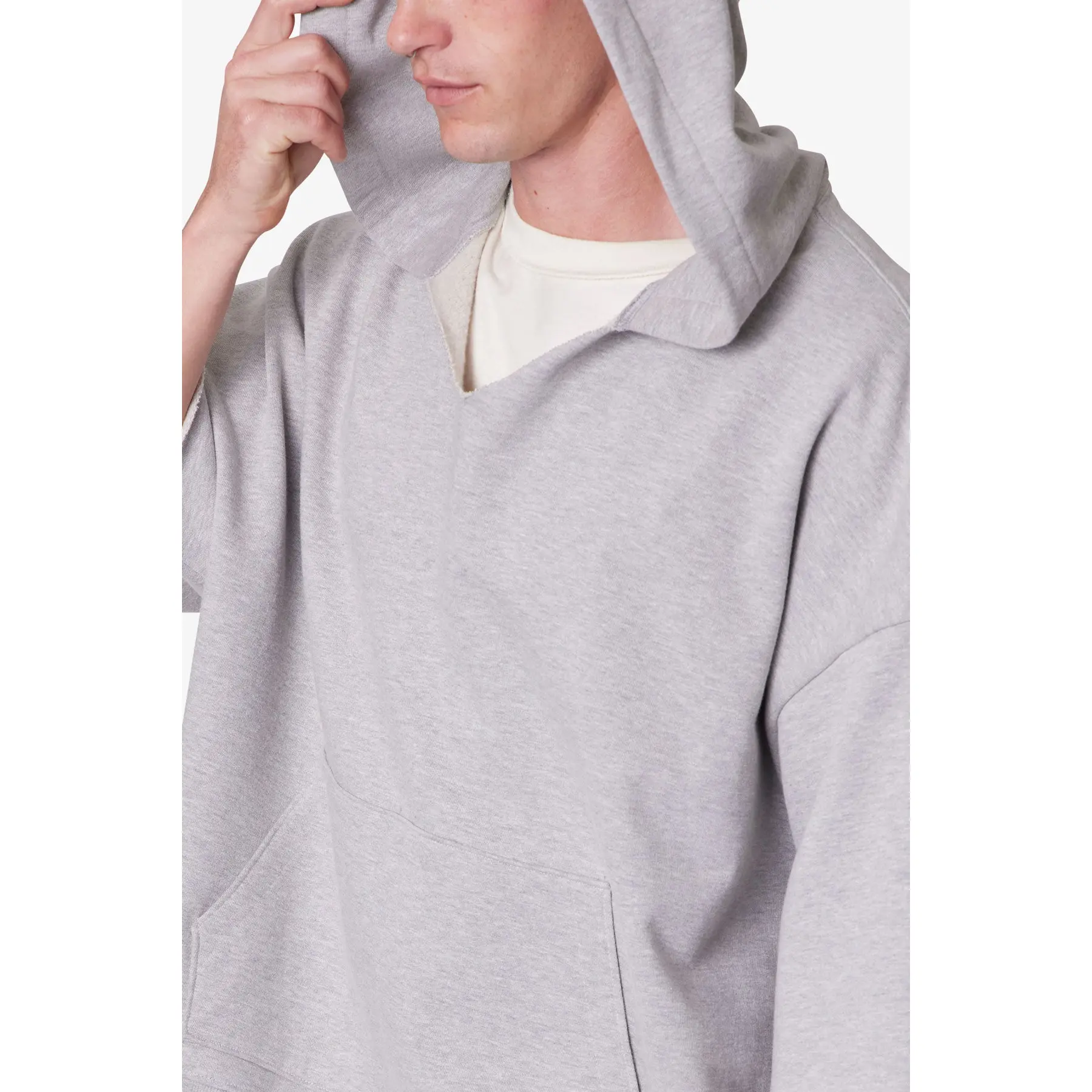 Constructed from 360 gsm French terry and vintage washed for a worn-in effect, the Hooded 3/4 Sleeve Rag Sweater features a relaxed, wide silhouette with cut-off sleeves. Designed with a notched neckline, standard kangaroo front pocket, and a hood, this outerwear piece delivers a deconstructed take on a classic hoodie.