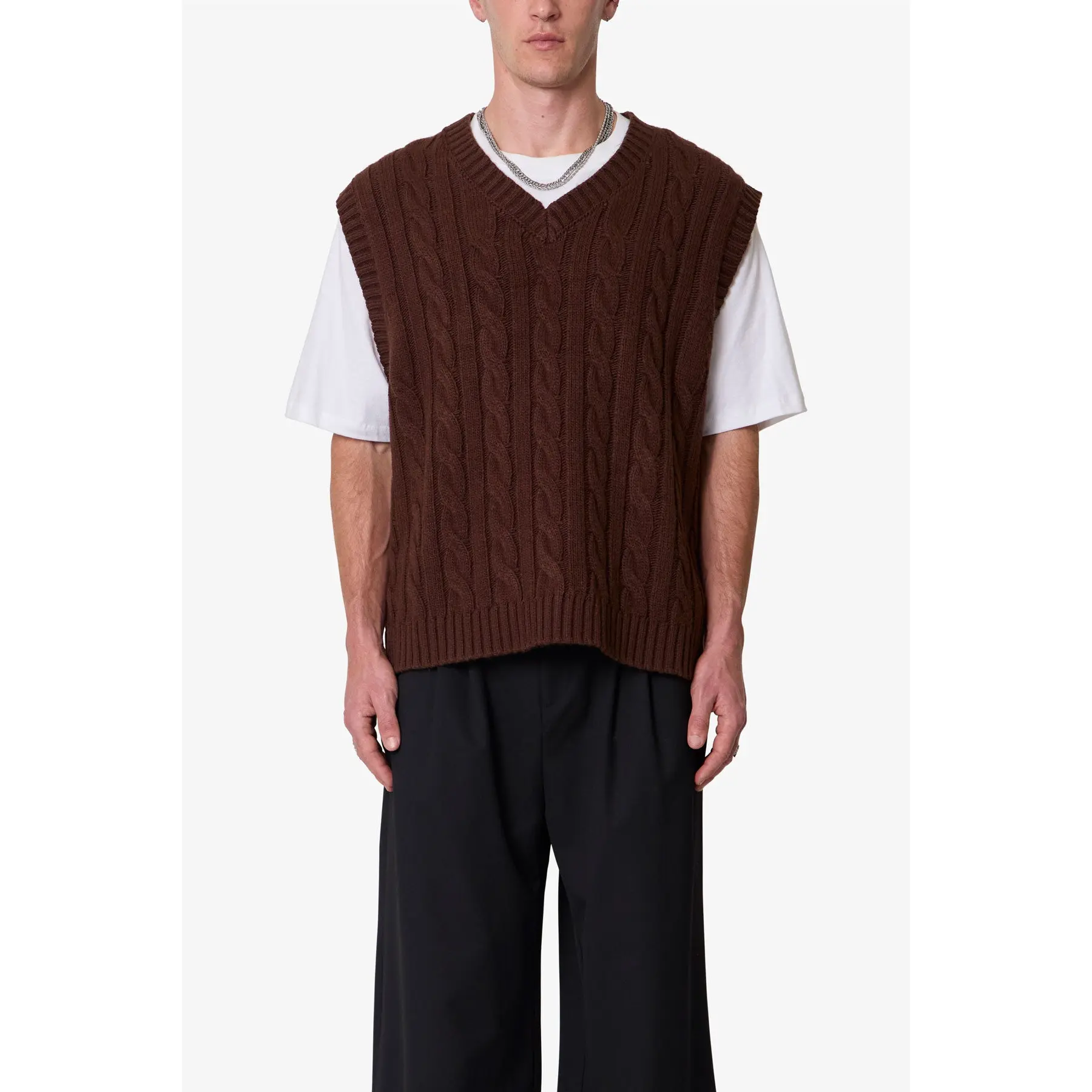 The Knit Vest is constructed from a cotton-acrylic-nylon blend and features a standard fit. Designed with a chunky cable knit pattern, this pullover vest includes a V neckline, ribbed armholes, and a ribbed bottom hem.