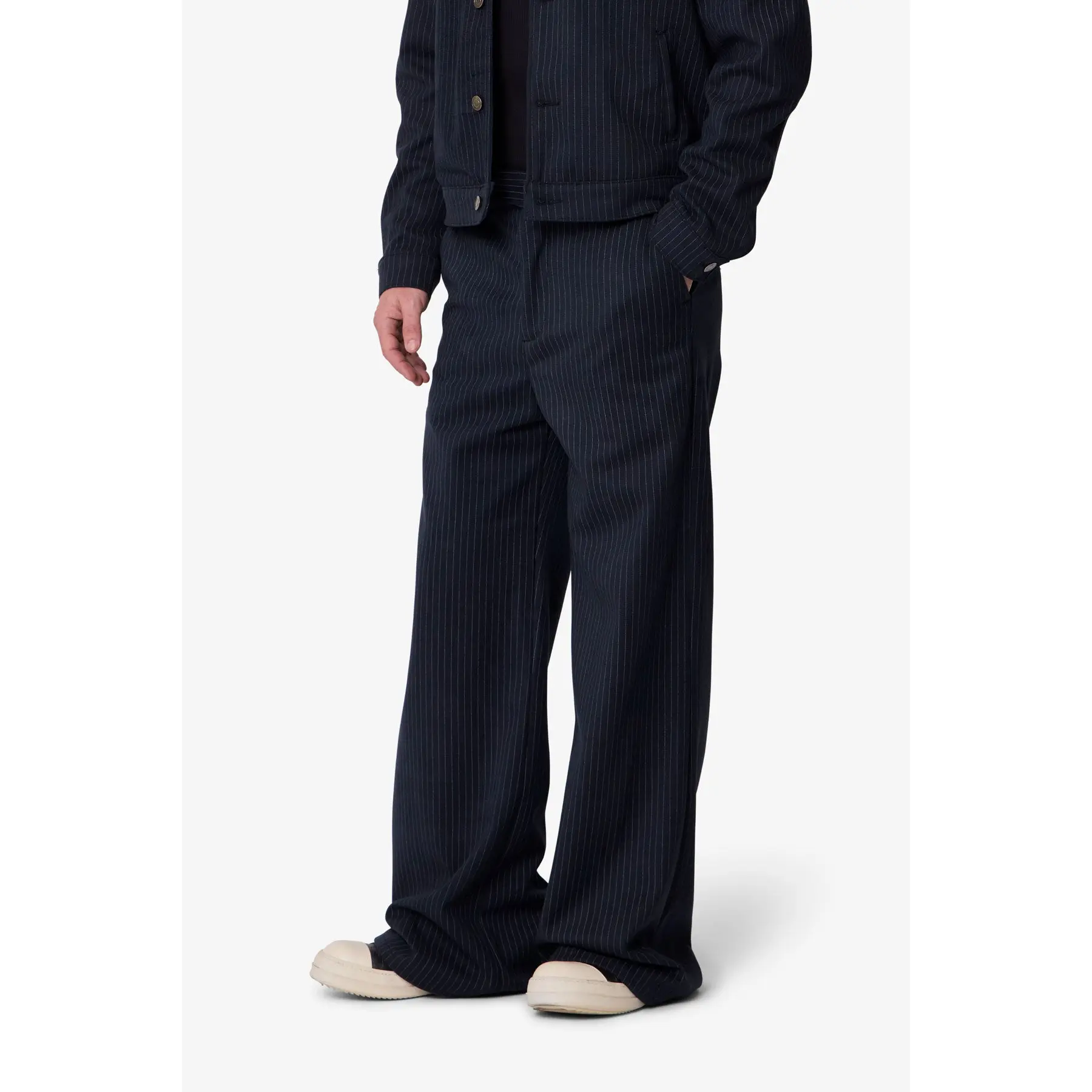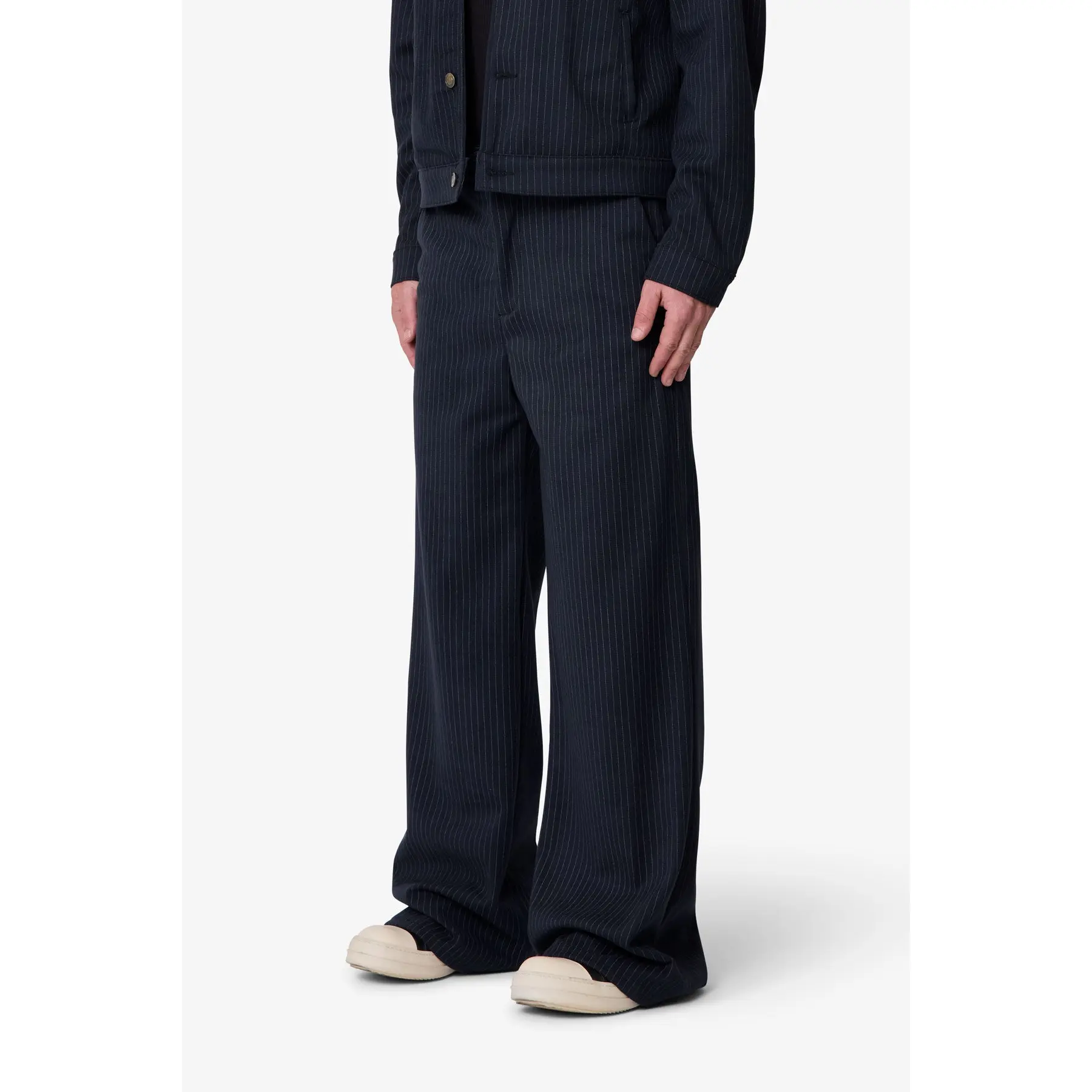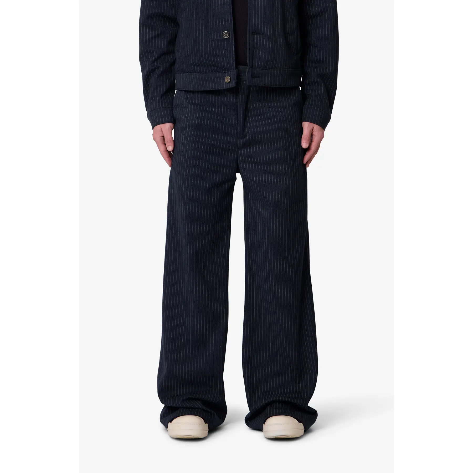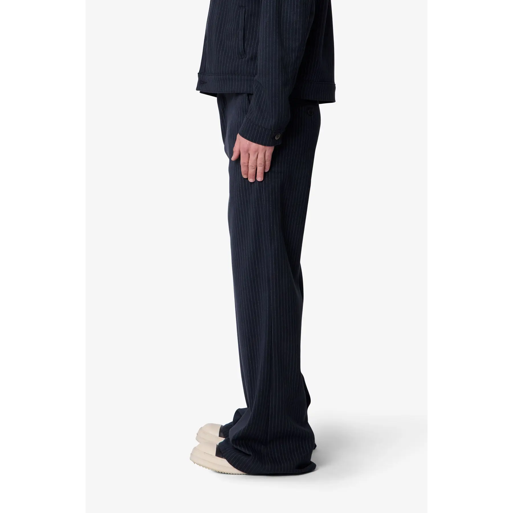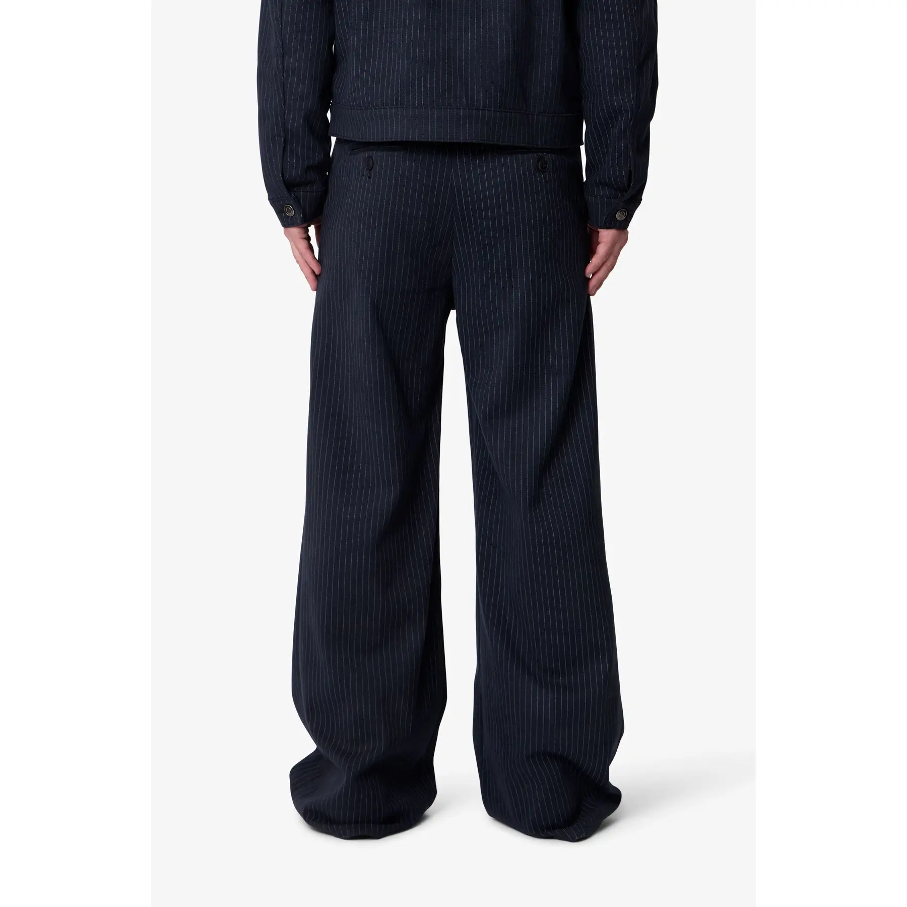 The Pinstripe Bootcut Trouser is cut in an oversized, relaxed fit with a slight flare at the hem, allowing for natural movement and balanced volume. Crafted from 100% polyester with a pinstripe pattern, the fabric has a smooth hand and structured weight that holds its shape over time. Designed with a hook-and-eye waistband closure and subtle panel detailing, it merges relaxed proportions with considered construction for a piece built to rotate confidently in your wardrobe.
