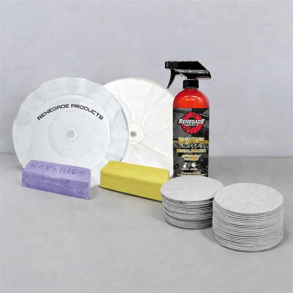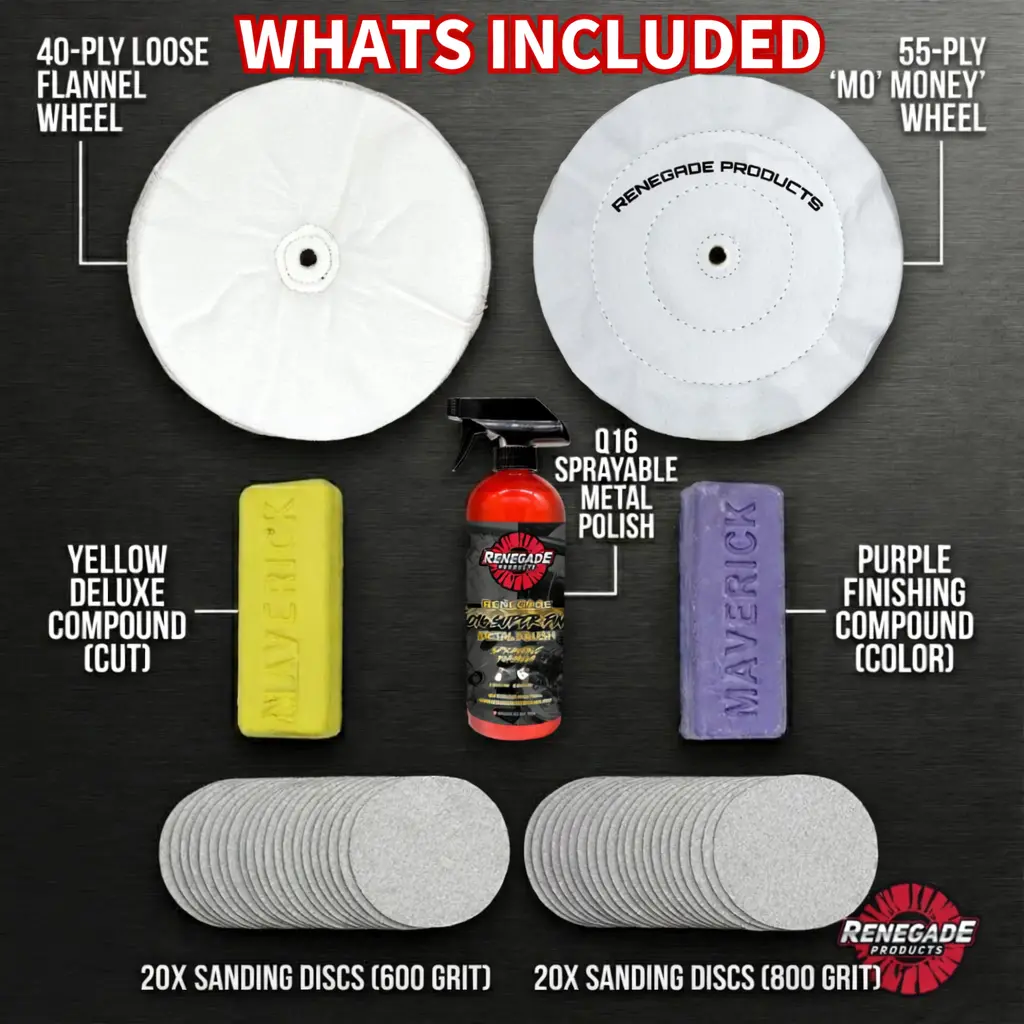 This bundle features premium buffing wheels, pro-grade compounds, a sprayable metal polish, and sanding discs that work together for a fast, flawless finish.